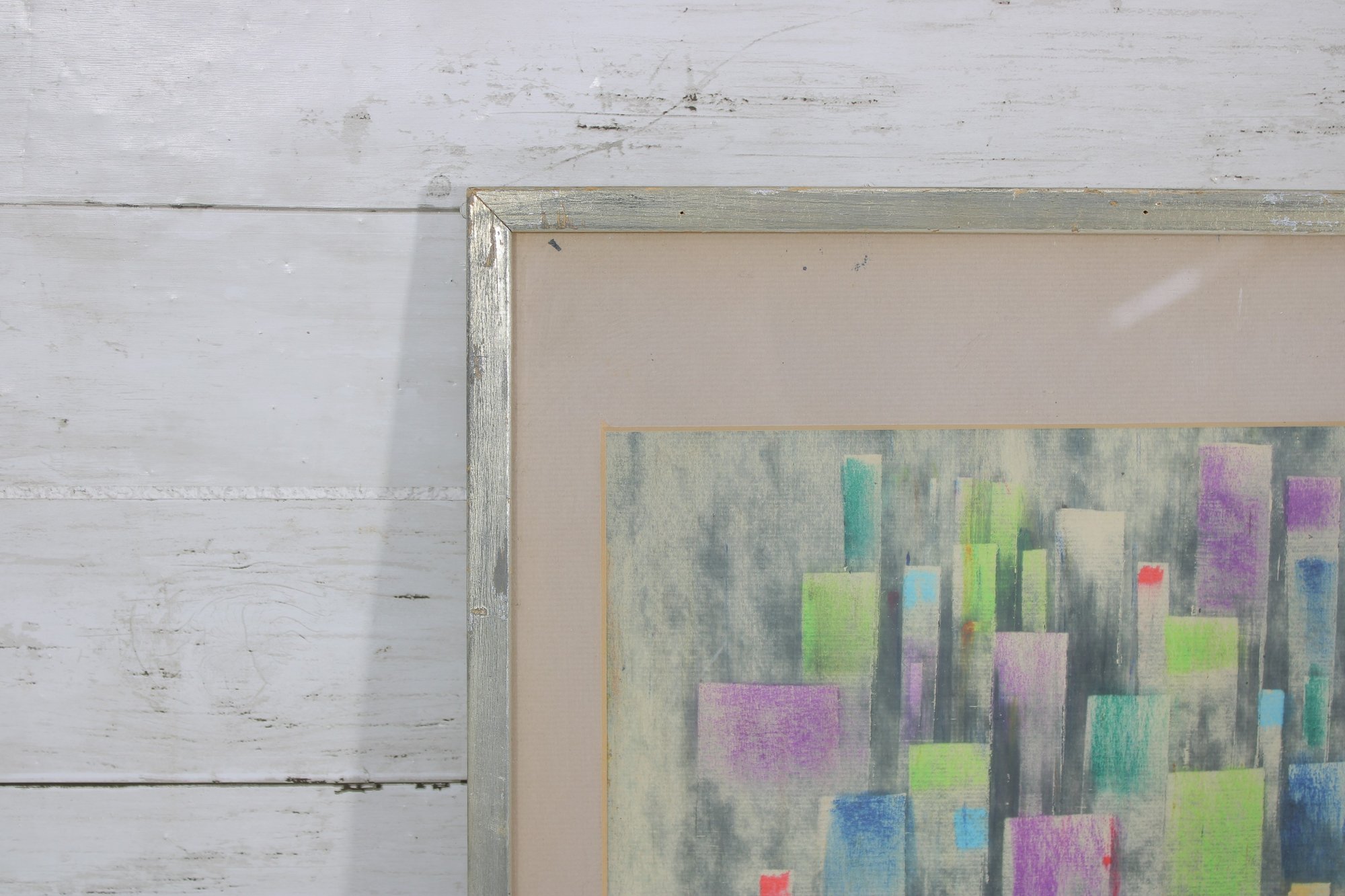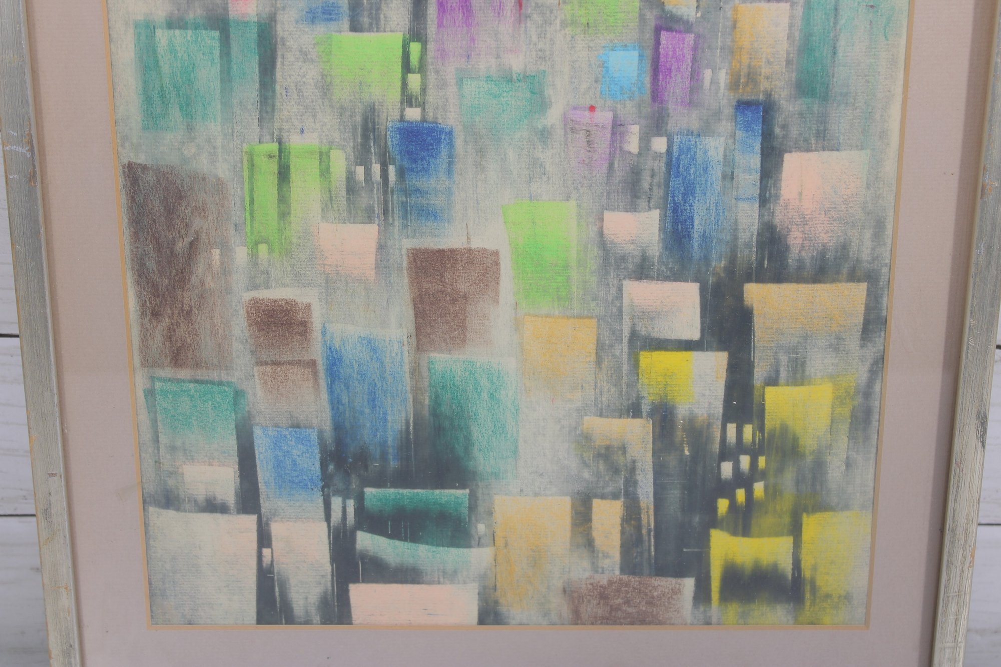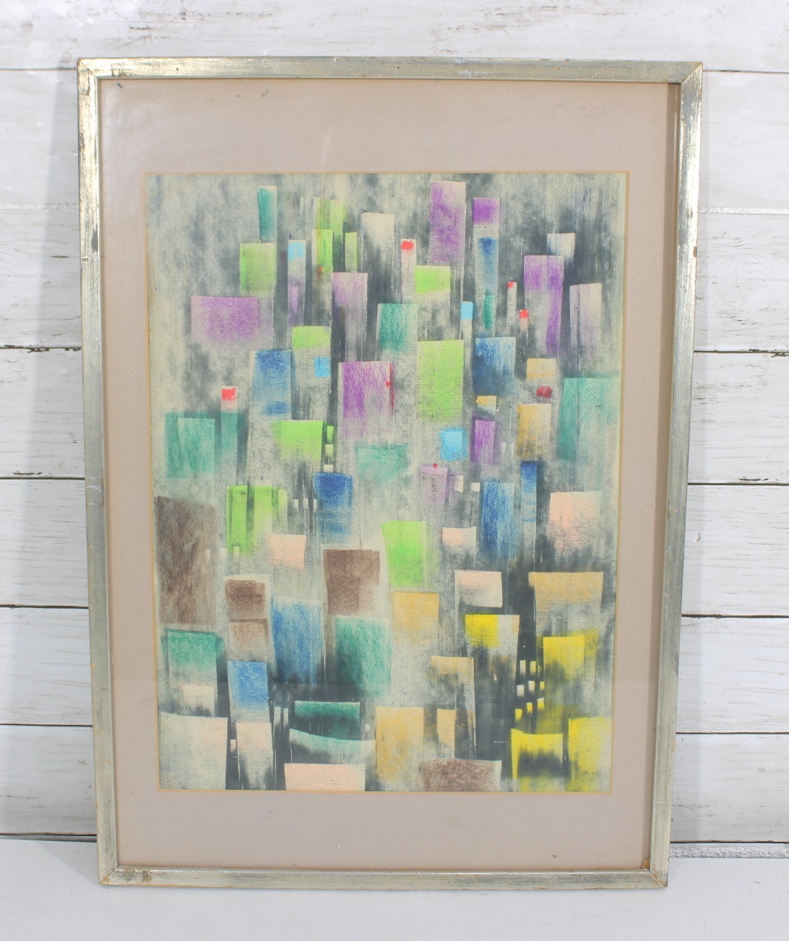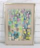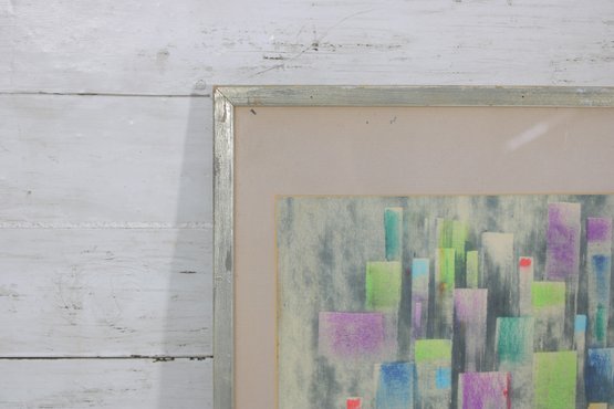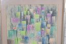 A beautiful vintage abstract lithograph featuring a stylized cityscape composition in soft, layered tones. The artwork presents a geometric skyline of vertical forms in pastel hues of green, blue, purple, and yellow, evoking a dreamy urban landscape with a distinctly mid-century modern aesthetic.