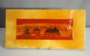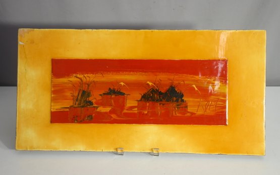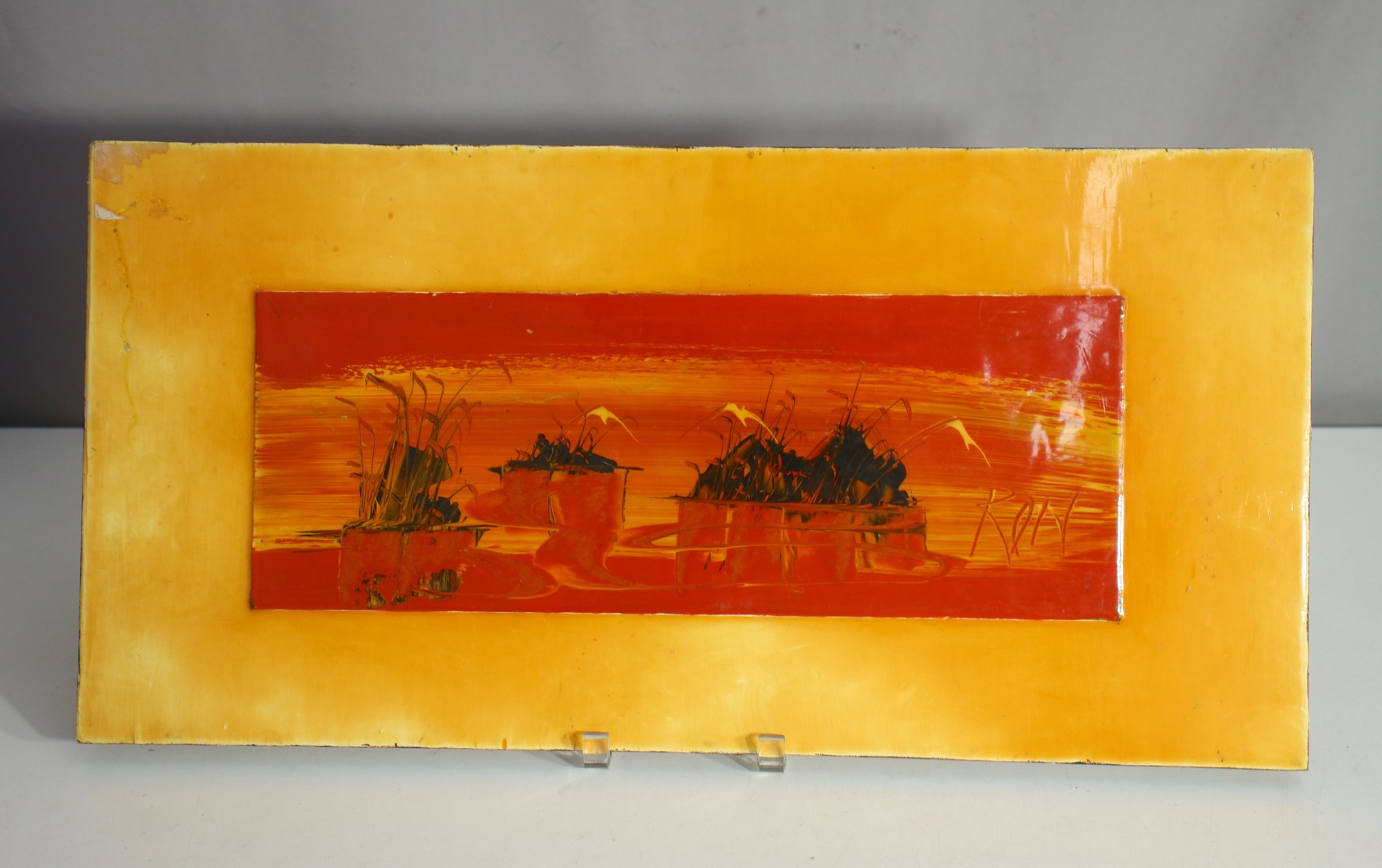 This is a striking vintage abstract enamel art panel featuring a vibrant red and yellow landscape-like composition, likely depicting a natural scene with reeds or plants silhouetted against an intense background. The enamel work is mounted on a wooden backing, which shows a sturdy construction with a hanging wire attached for easy wall display. The artwork exhibits a distinct signature in the enamel (as seen in the close-up photo), adding authenticity and potential provenance value. The panel reflects mid-century modern aesthetics, ideal for collectors of unique art or lovers of bold, colorful designs.