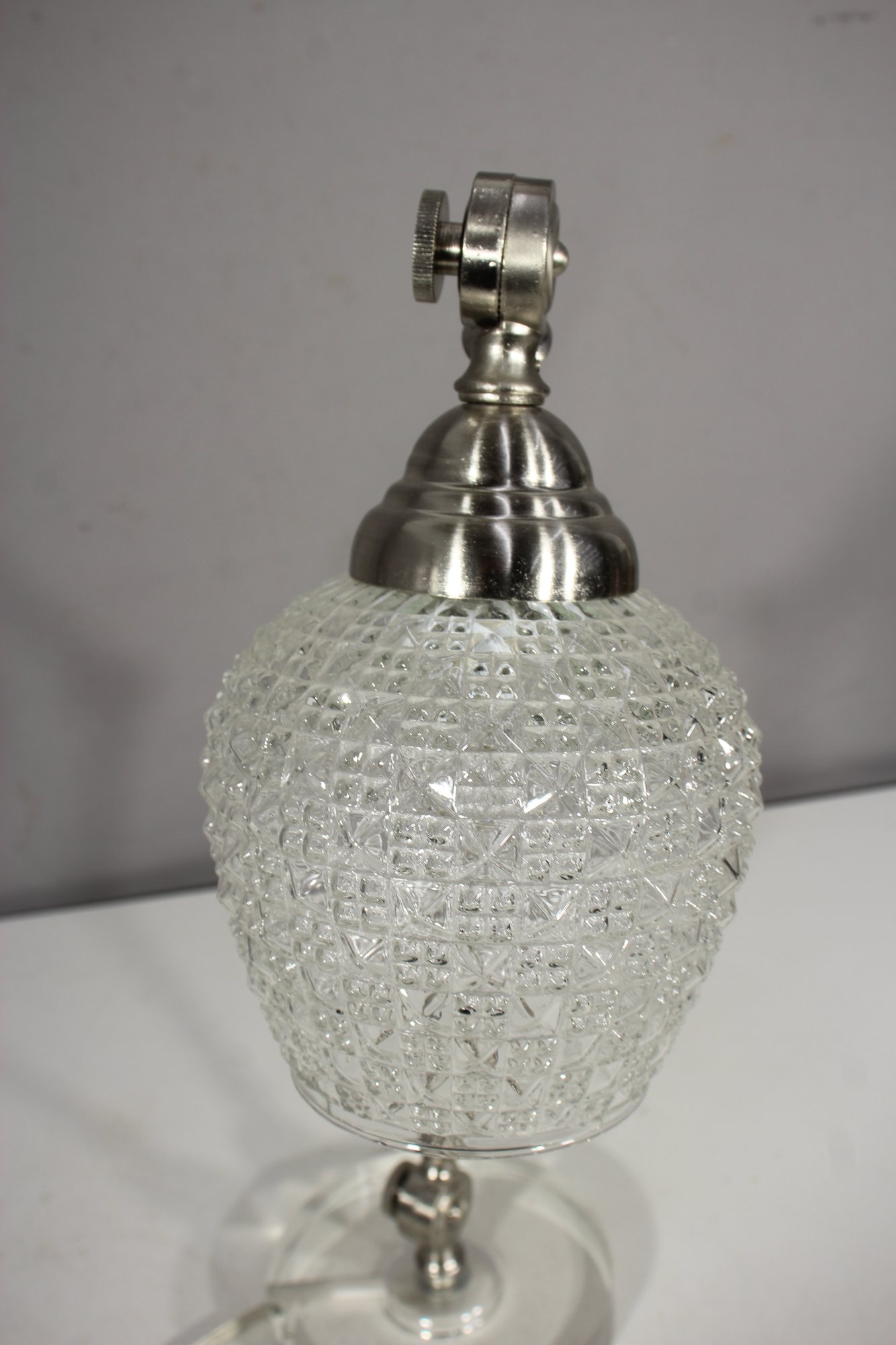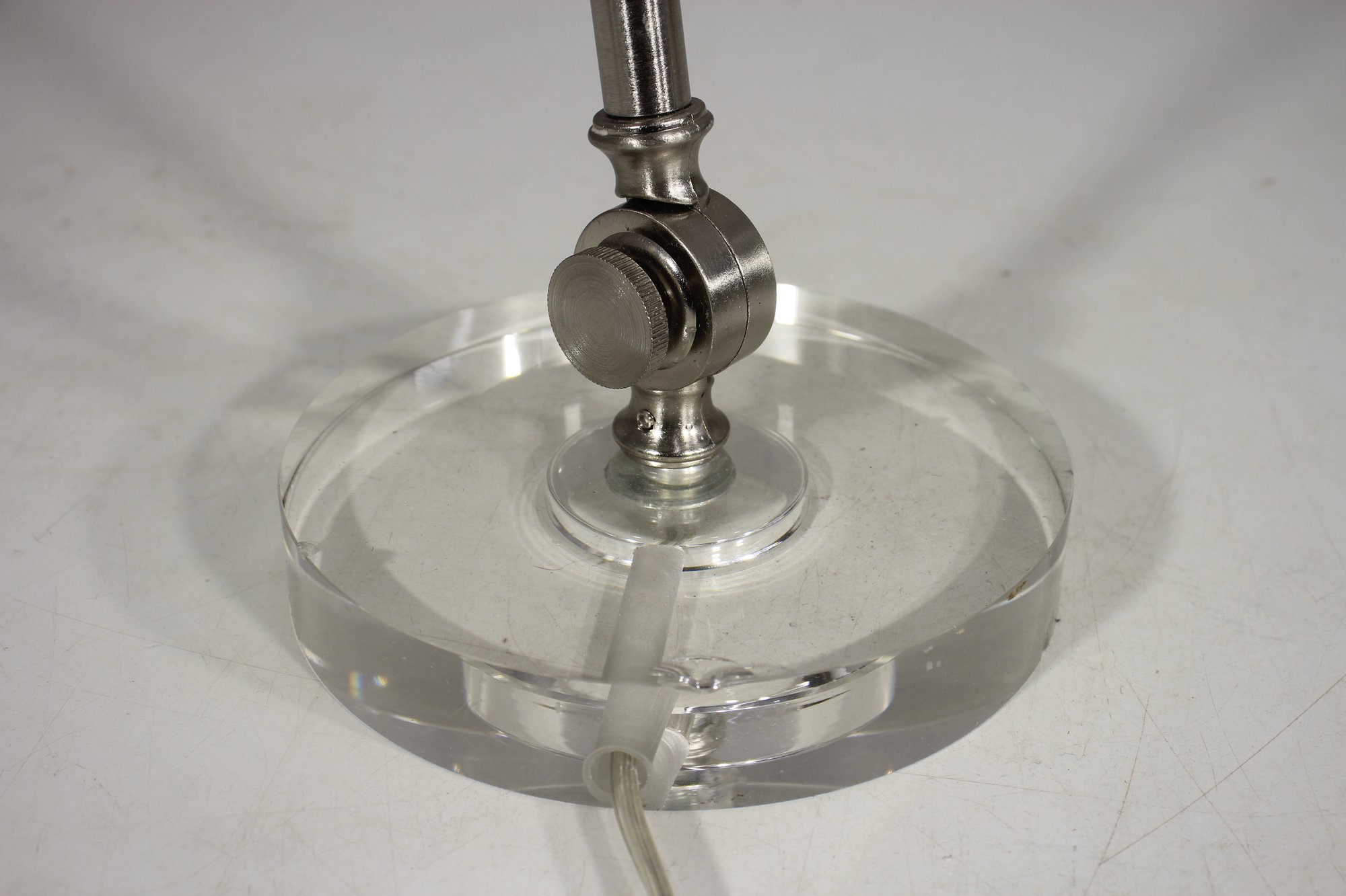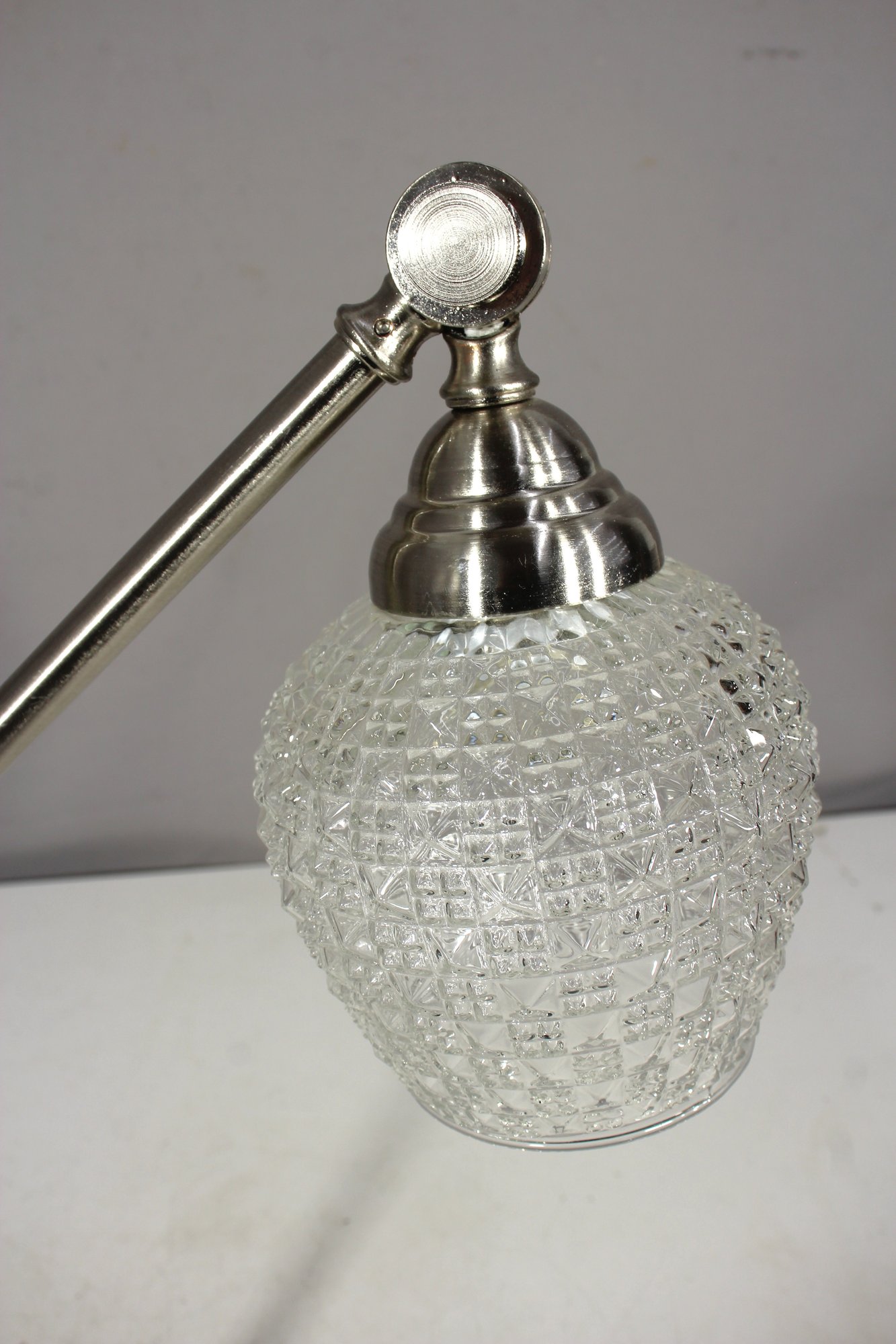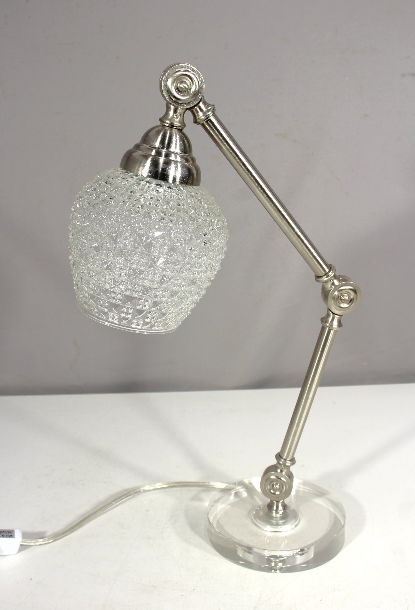 This elegant adjustable desk lamp features a stunning crystal-cut shade, a sleek nickel-finished arm, and a clear acrylic base for a modern touch. The lamp is in good working condition, with a small chip on the base (as shown in photos), which does not affect its functionality. Perfect for adding a sophisticated and timeless accent to your home or office décor.