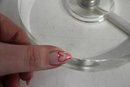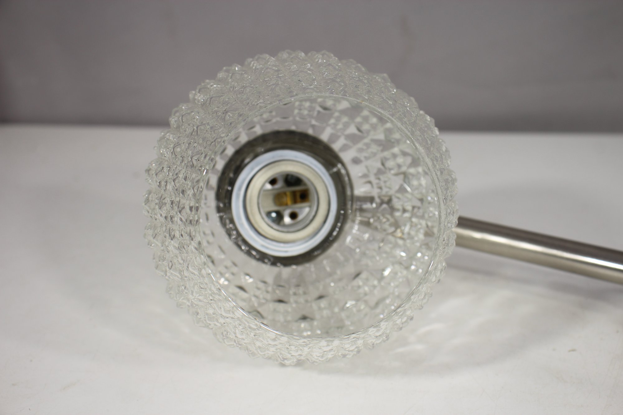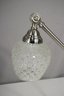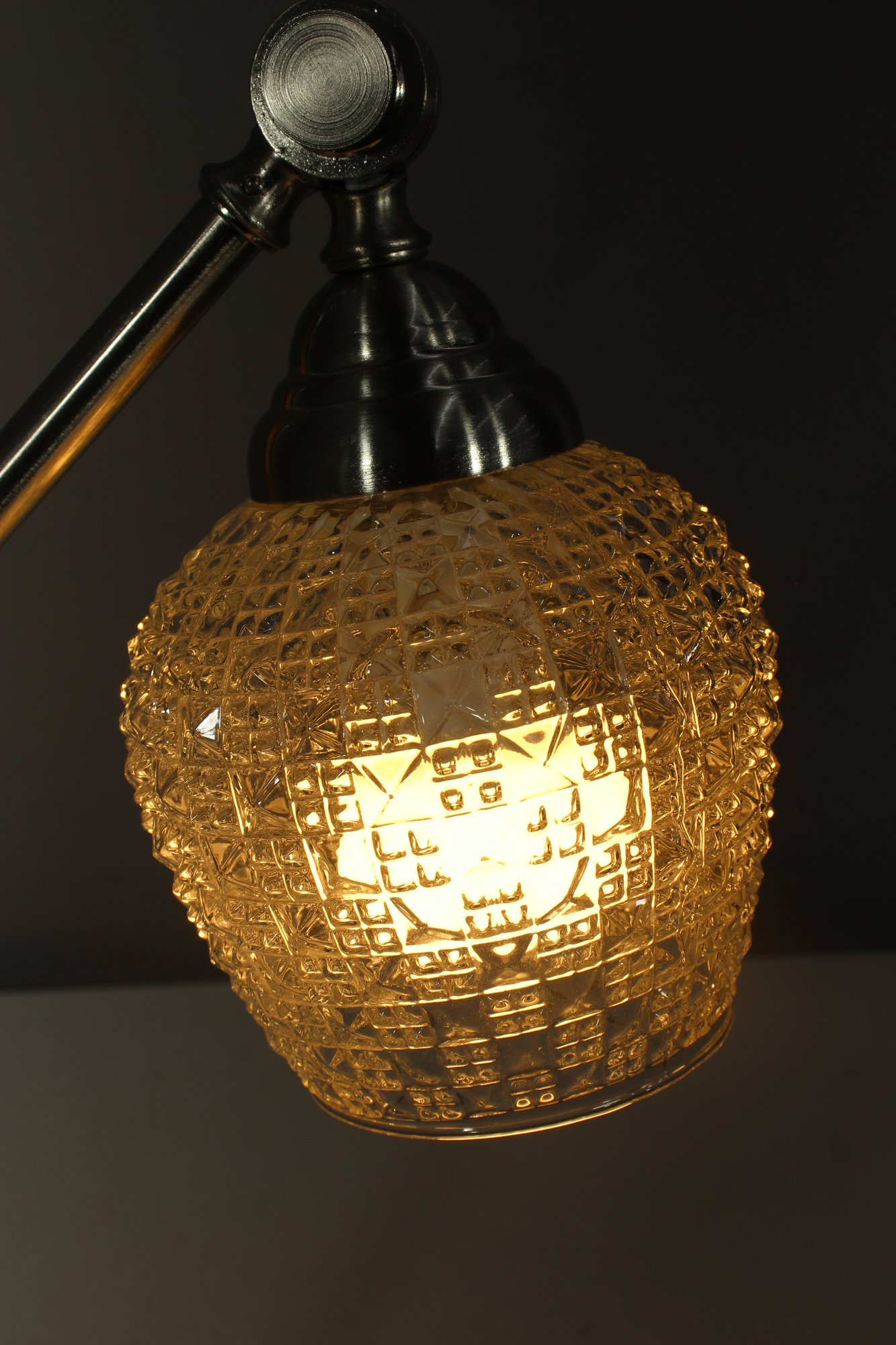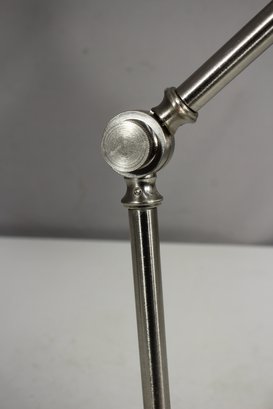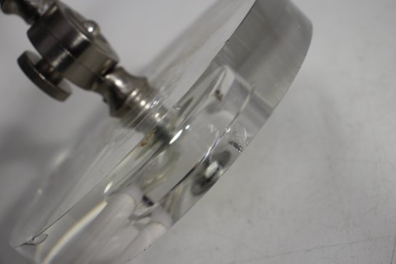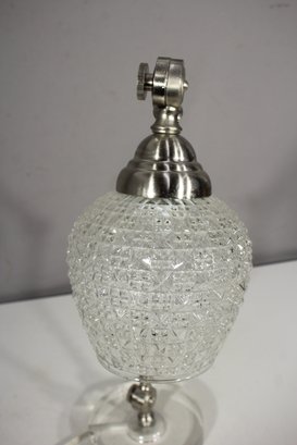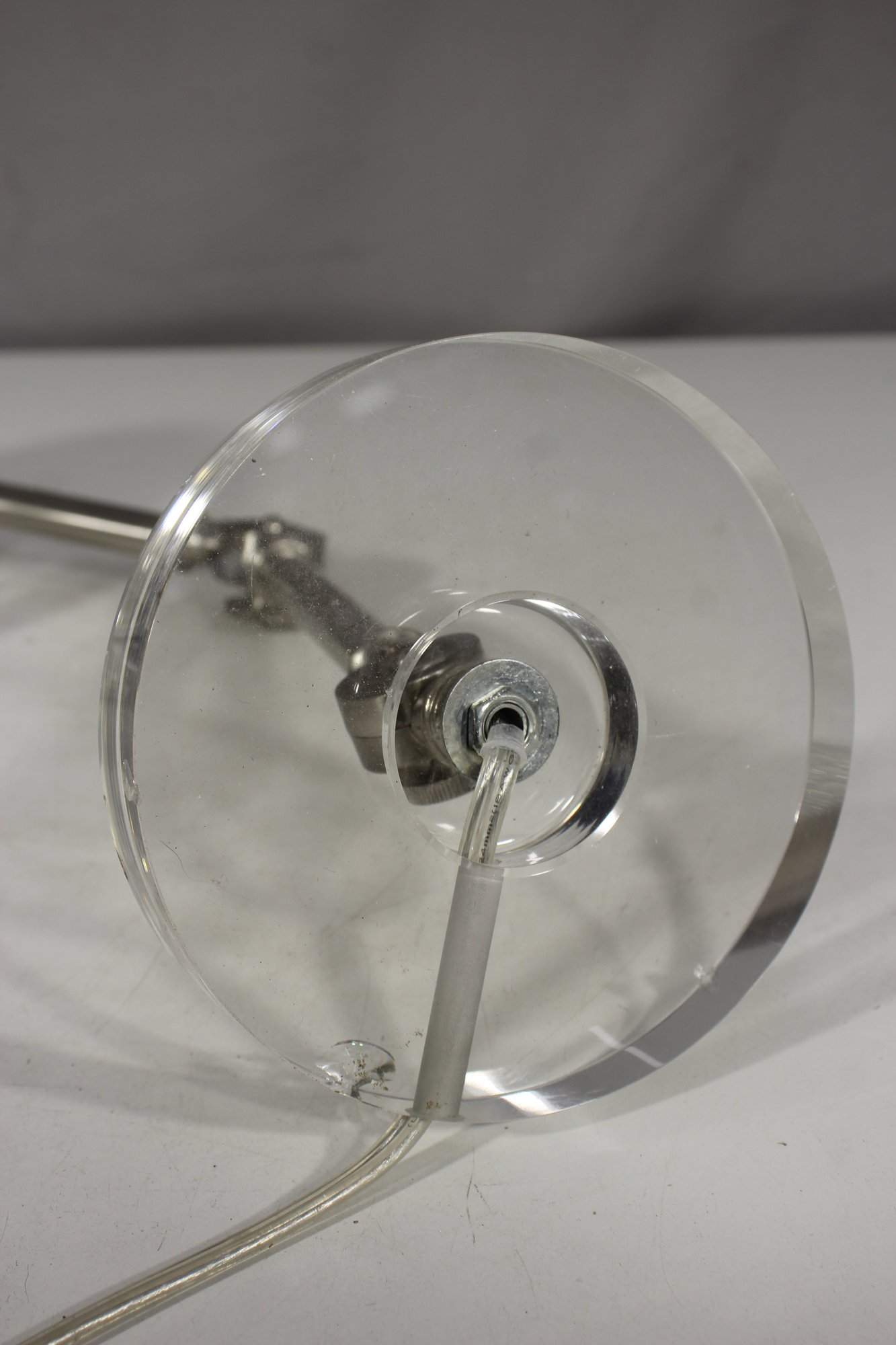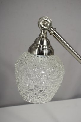 This elegant adjustable desk lamp features a stunning crystal-cut shade, a sleek nickel-finished arm, and a clear acrylic base for a modern touch. The lamp is in good working condition, with a small chip on the base (as shown in photos), which does not affect its functionality. Perfect for adding a sophisticated and timeless accent to your home or office décor.