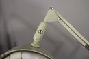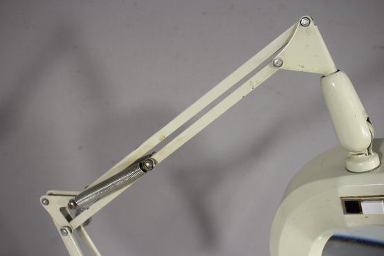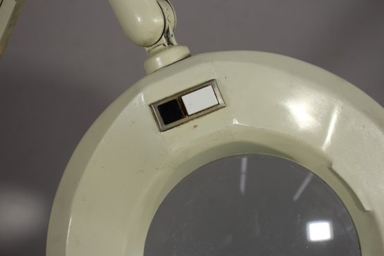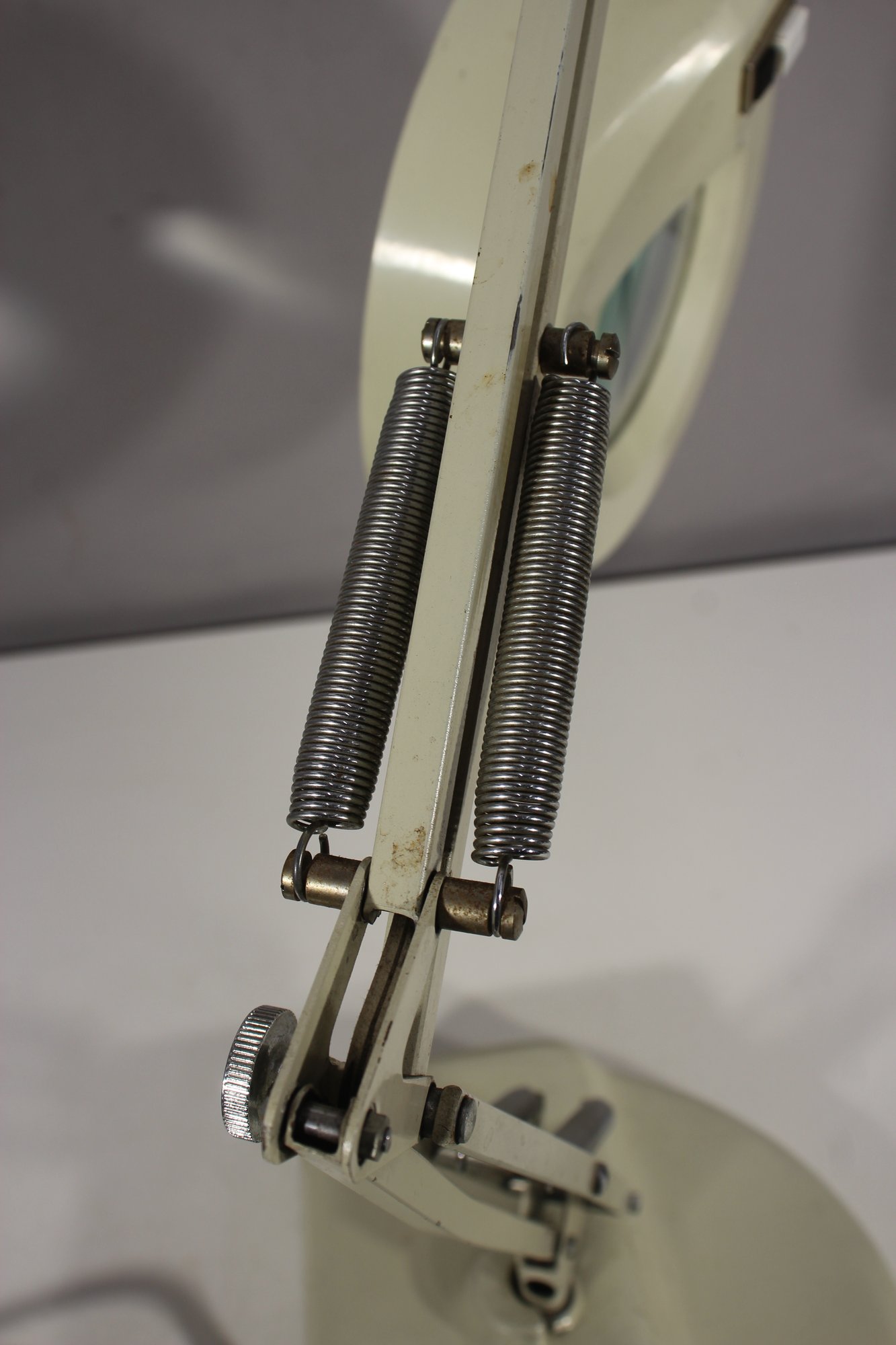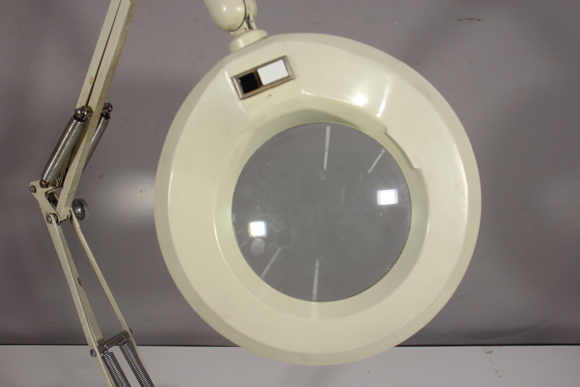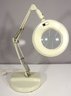 vintage adjustable magnifying task lamp, ideal for hobbyists, watchmakers, or detailed work. This lamp features a built-in magnifying glass surrounded by a fluorescent ring light.
