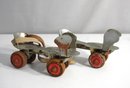 Step back in time with this pair of vintage adjustable metal roller skates. Featuring a classic design with metal frames, leather straps, and vibrant red wheels, these skates are a nostalgic piece of skating history. The skates show natural wear and patina, adding to their retro charm and appeal.