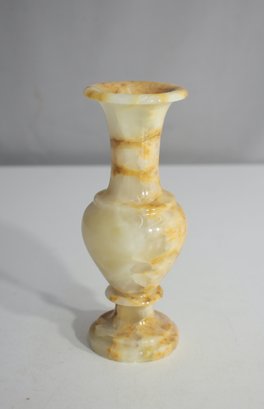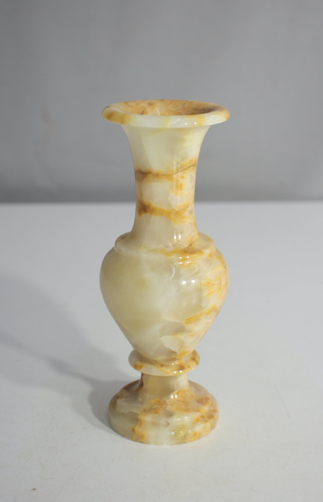 This charming vintage vase is crafted from natural alabaster marble, showcasing beautiful earthy tones of cream and golden veining. Standing approximately X inches tall, its elegant shape and polished finish make it a timeless decorative piece for any home. Perfect for displaying small floral arrangements or as a standalone statement. This vase is in great condition with no major chips or cracks, adding a touch of vintage charm to your collection. A true collector's item!