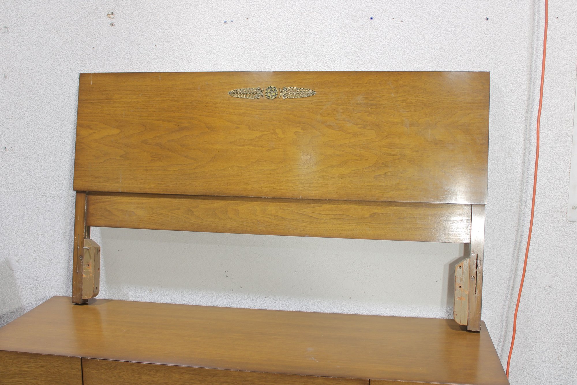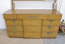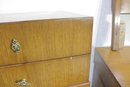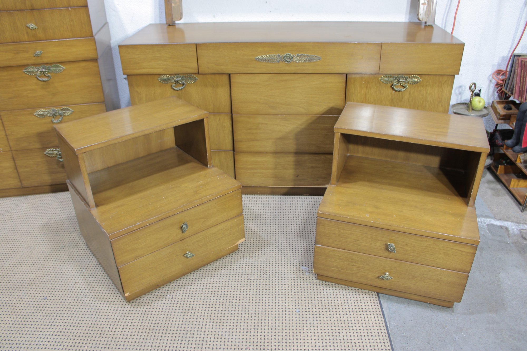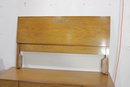 vintage full-size bedroom furniture set by Albert, featuring clean lines, warm wood tones, and classic mid-century styling. This matching set includes a dresser, chest of drawers, and two nightstands, all showcasing solid craftsmanship and elegant original hardware.