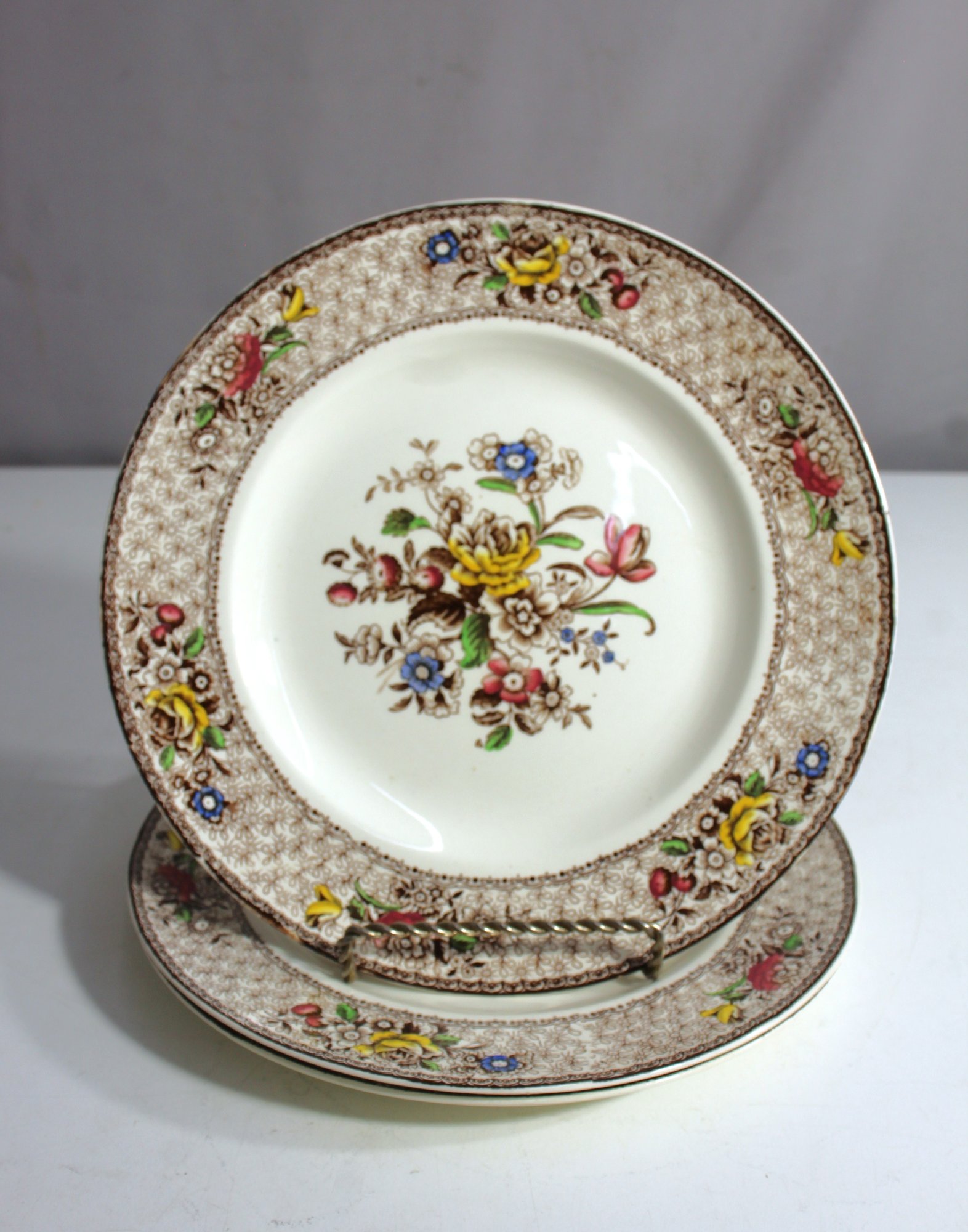 Beautiful set of four 9-inch vintage plates by Alfred Meakin, featuring the intricate "Dorset" pattern. These plates showcase a delicate floral motif in the center, surrounded by a detailed border with colorful floral accents, adding a touch of elegance and charm to any table setting. Made in England and marked with the Alfred Meakin logo, these plates are crafted from high-quality Royal Semi-Porcelain, perfect for collectors of vintage English pottery or anyone looking to add timeless style to their home décor.
