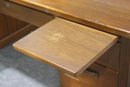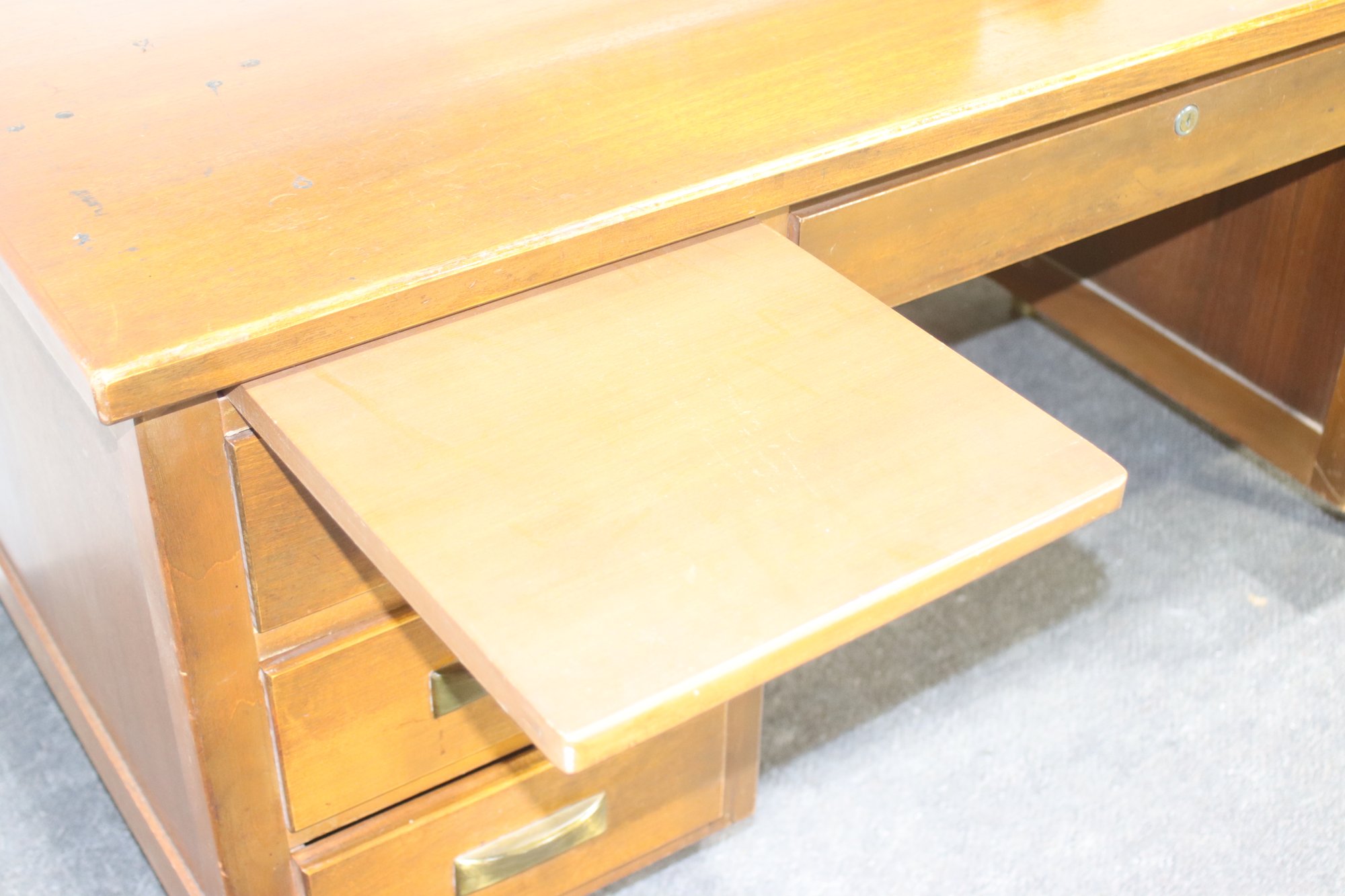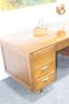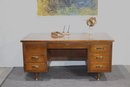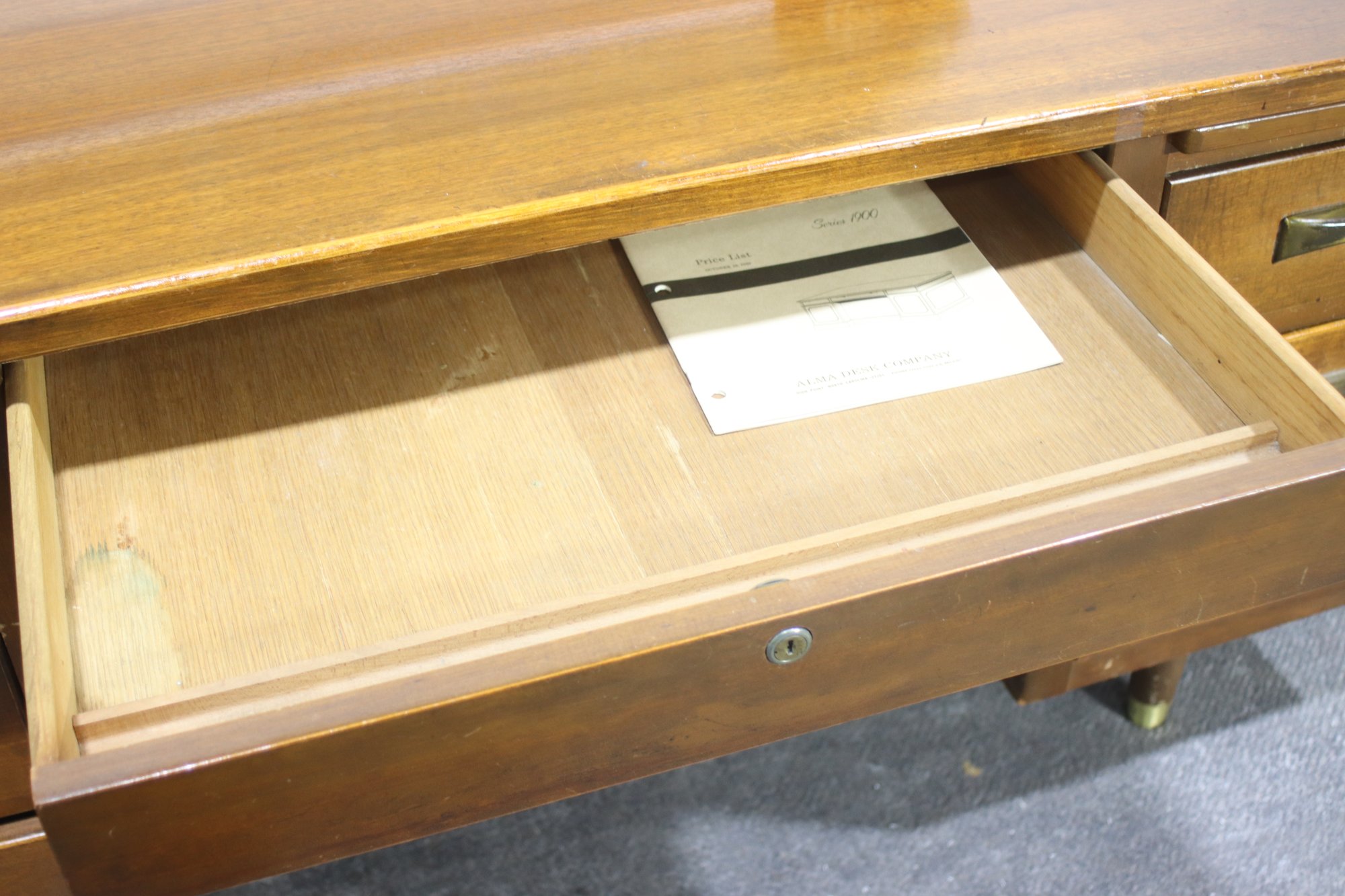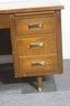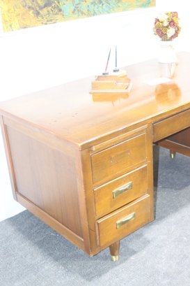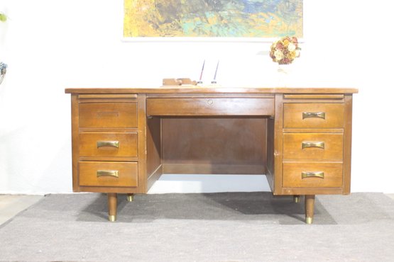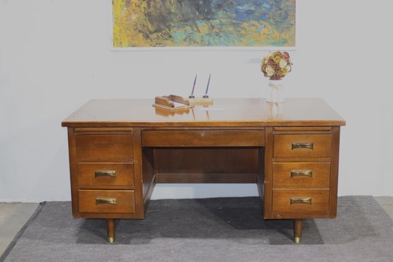 This vintage executive desk by Alma Desk Company is a stunning mid-century modern piece, featuring a rich wood finish, brass handles, and tapered legs. With six spacious drawers, a pull-out writing board, and a sturdy design, this desk offers both functionality and timeless style—perfect for a home office or workspace.