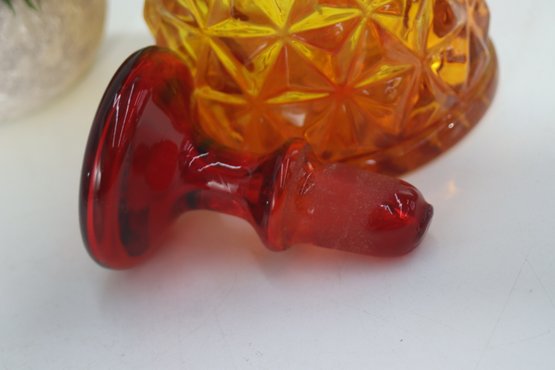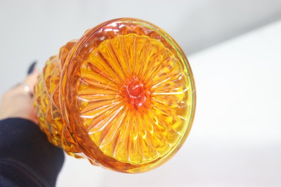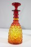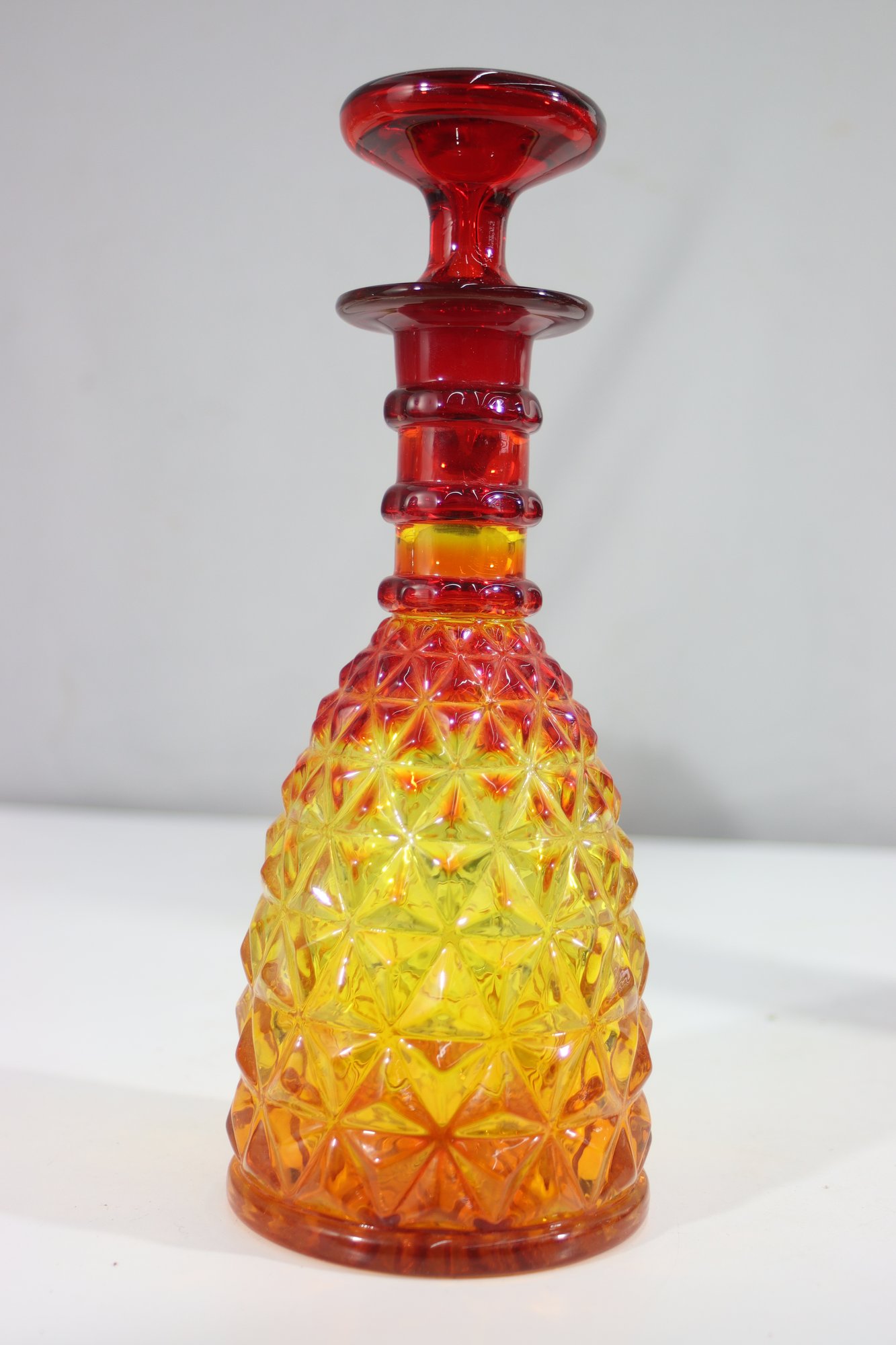 This stunning vintage Amberina glass decanter features a rich gradient of fiery red to golden amber hues, creating a brilliant glow in the light. The intricate diamond point pattern enhances its beauty, making it a true statement piece for any bar or glass collection.