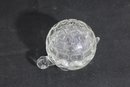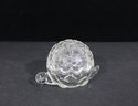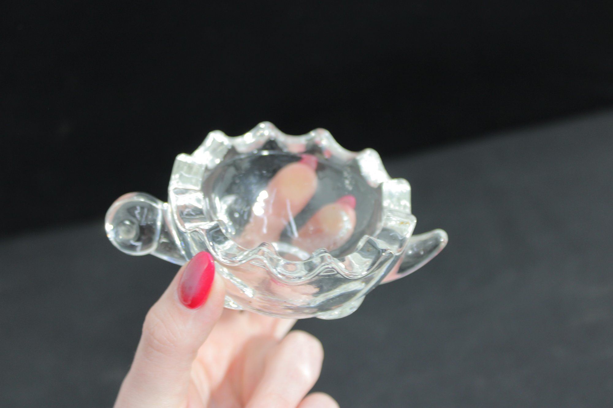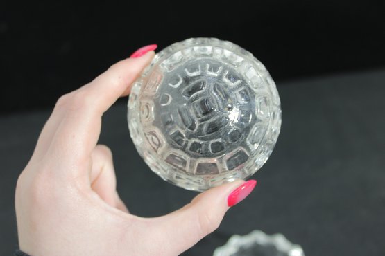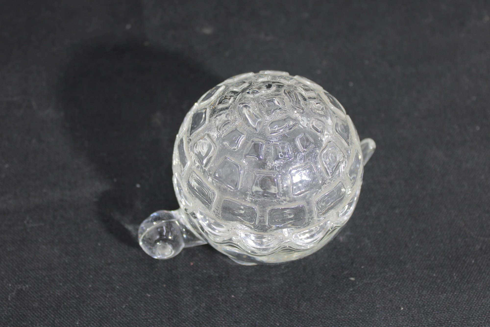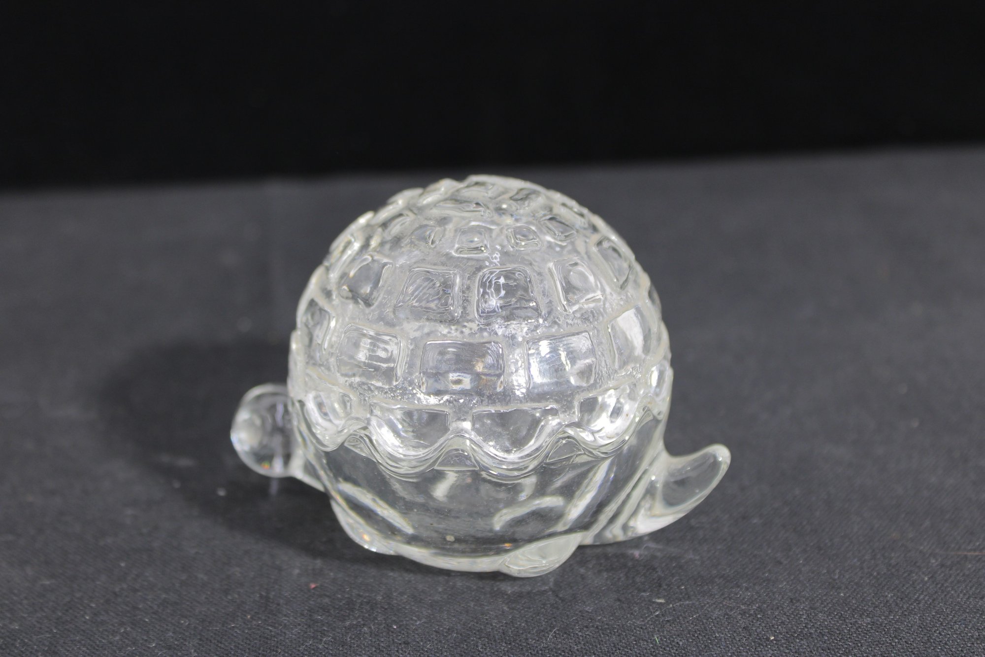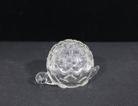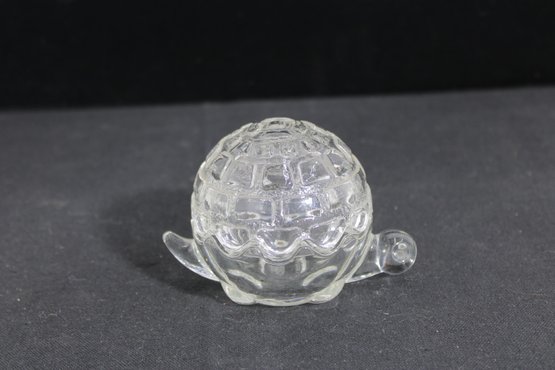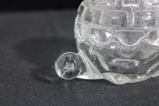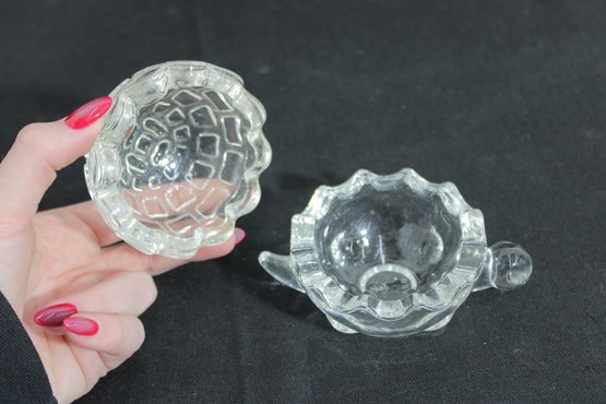 Adorable vintage Anchor Hocking clear glass trinket dish in the shape of a turtle, complete with a removable shell lid. This charming covered dish features a textured shell pattern on top and a scalloped base, with small molded head and tail details that bring the piece to life.