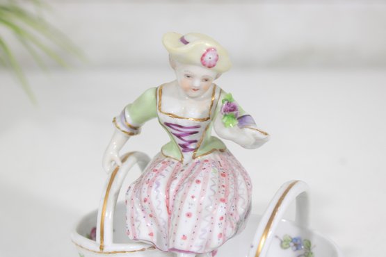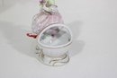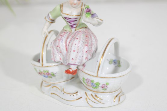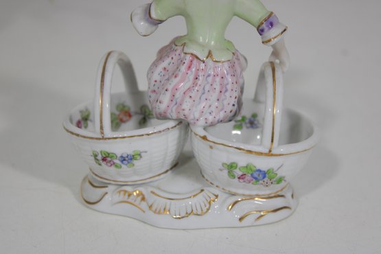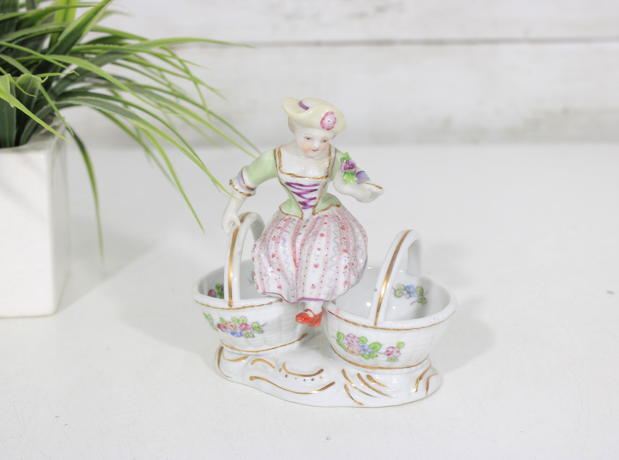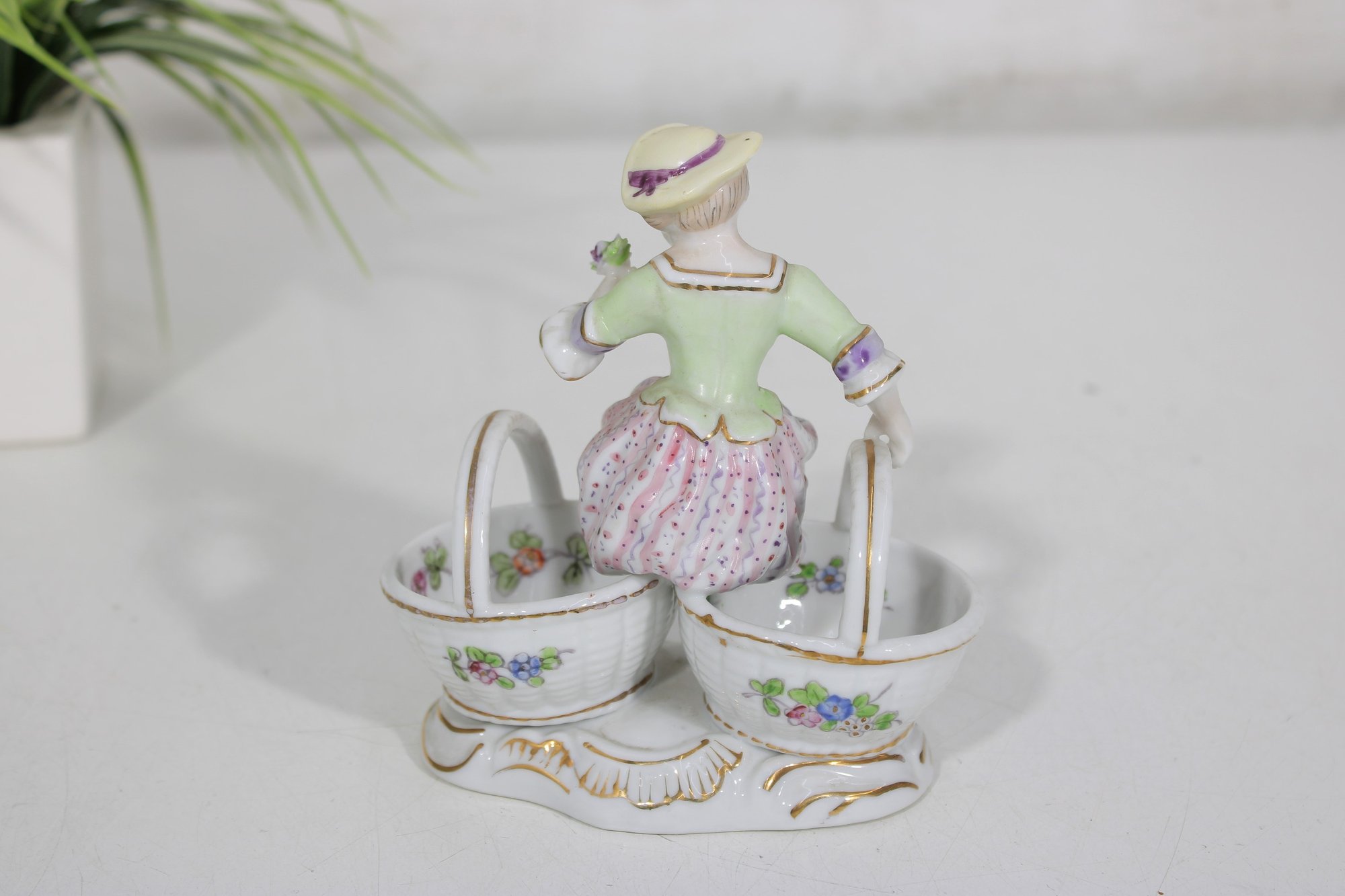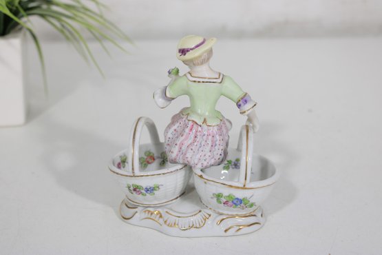 The figure is dressed in a soft pastel outfit with a detailed skirt and bonnet, giving the piece a classic European-inspired decorative style often seen in Andrea by Sadek figurines. The twin baskets beside the figure add a unique and decorative element to the design.