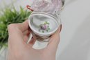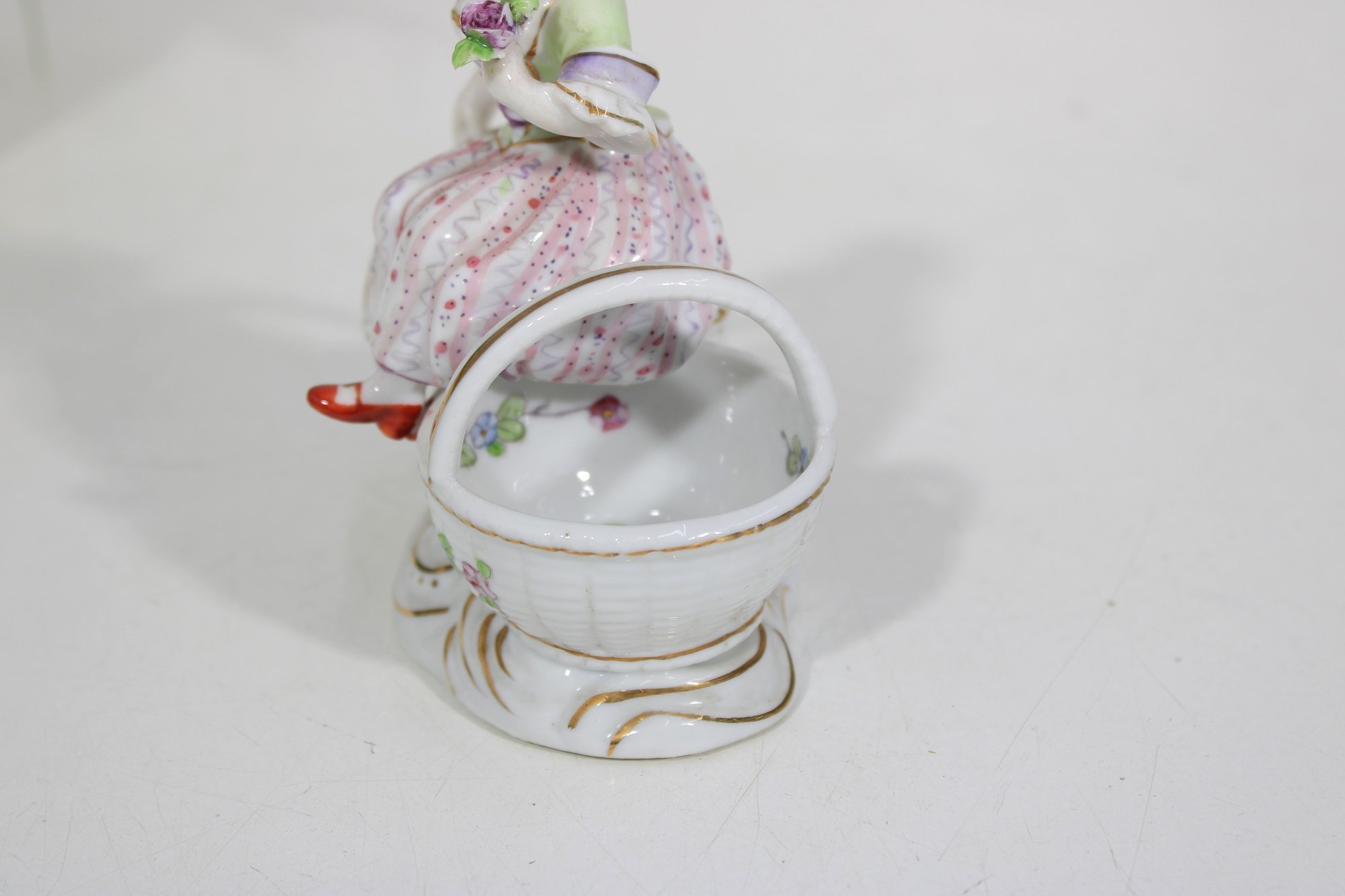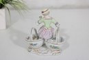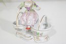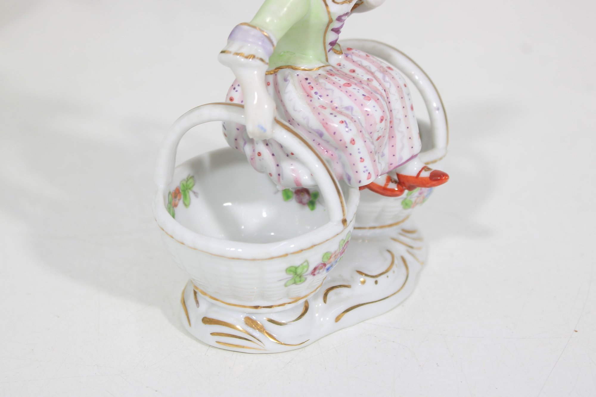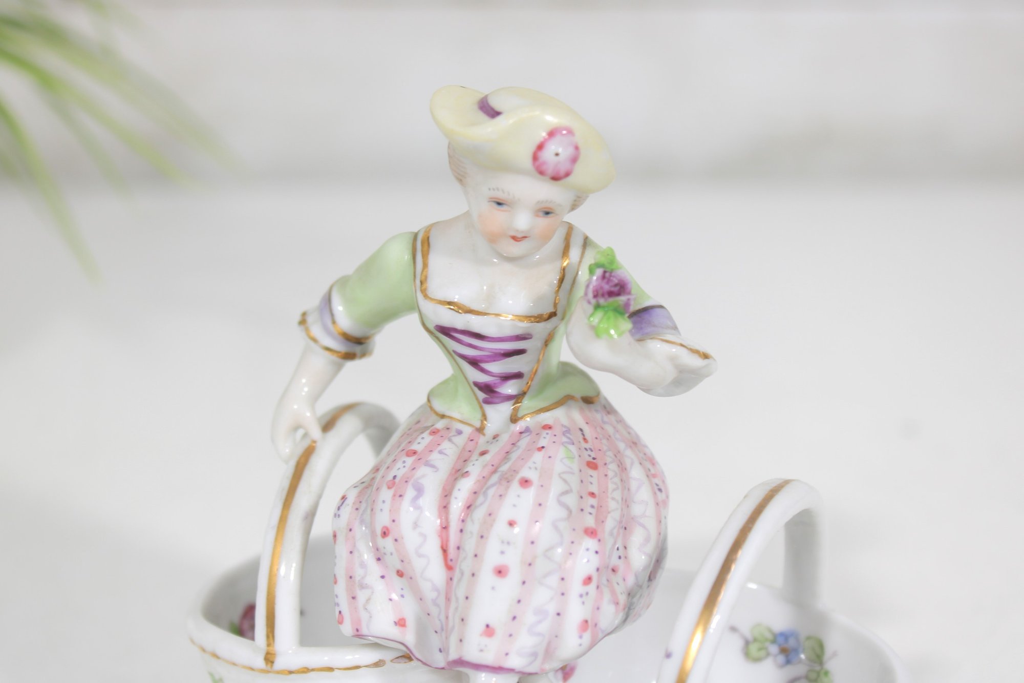 The figure is dressed in a soft pastel outfit with a detailed skirt and bonnet, giving the piece a classic European-inspired decorative style often seen in Andrea by Sadek figurines. The twin baskets beside the figure add a unique and decorative element to the design.