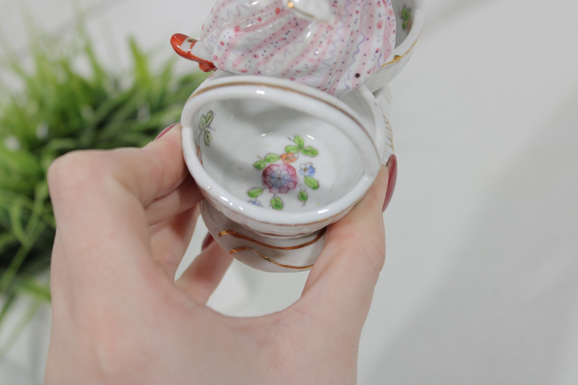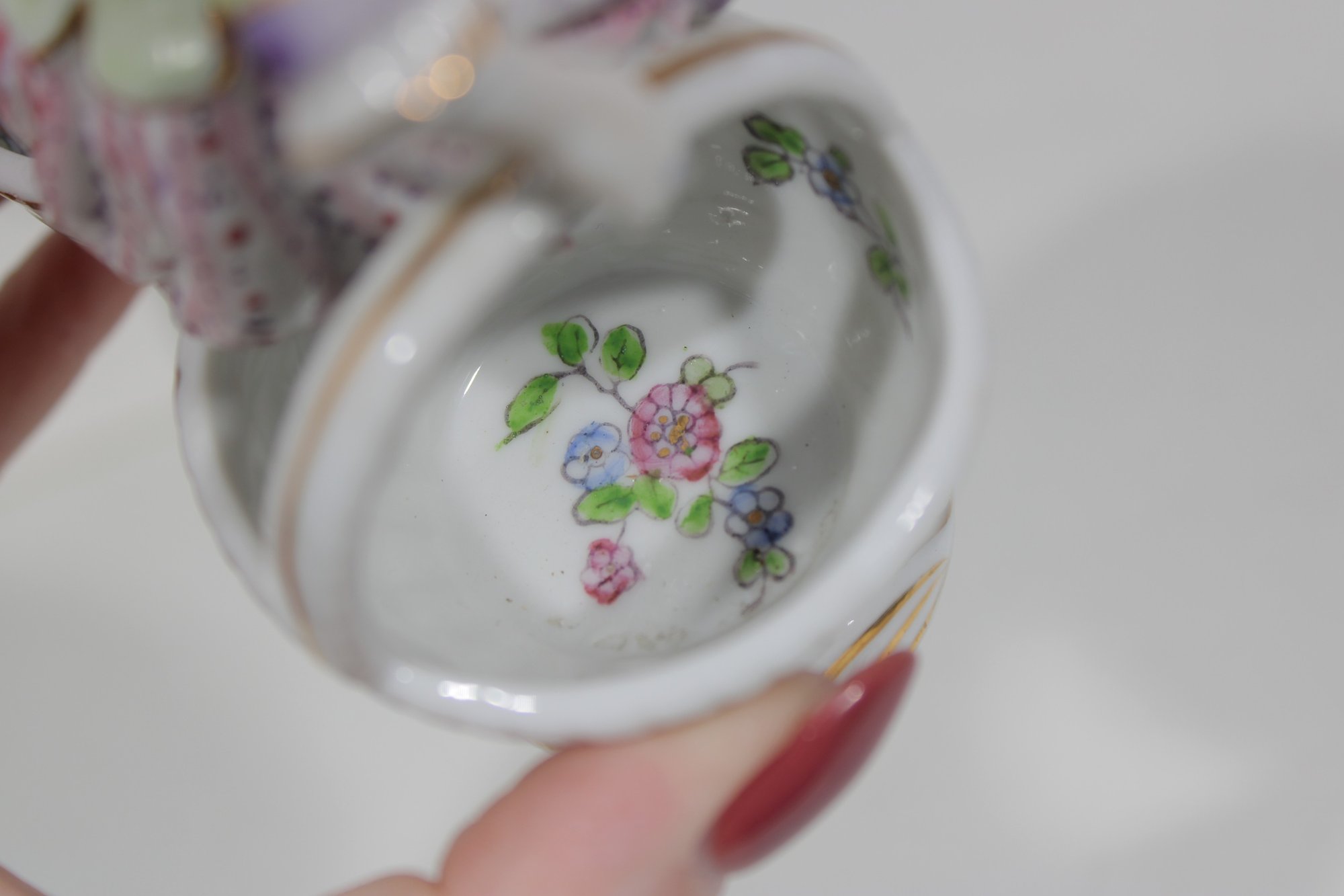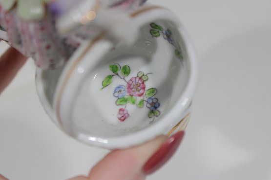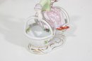 vintage Andrea by Sadek porcelain figurine depicting a young girl seated between two decorative baskets. The piece features delicate hand-painted details including floral basket interiors, pastel clothing, and gold accent trim along the base and basket handles.