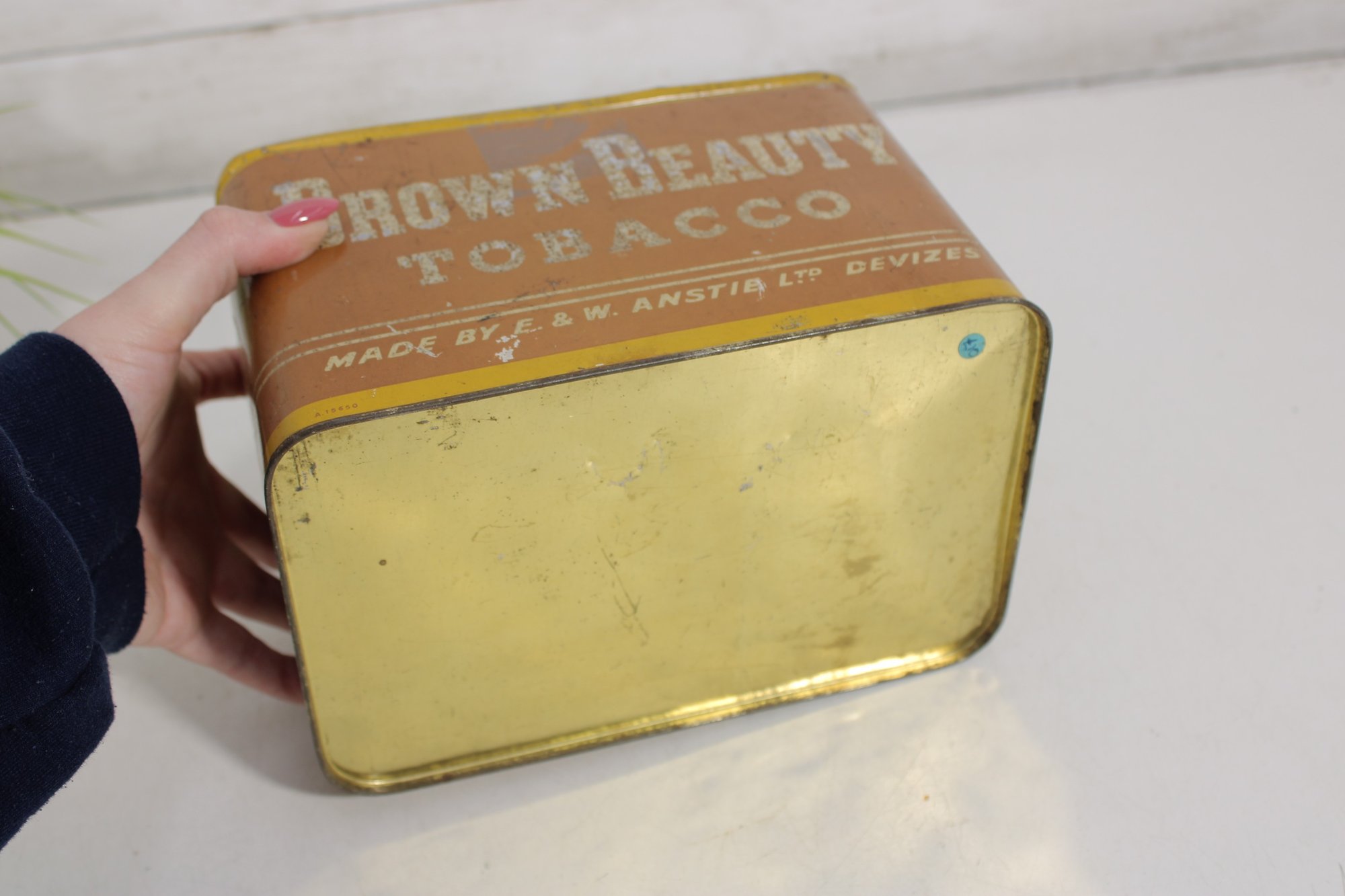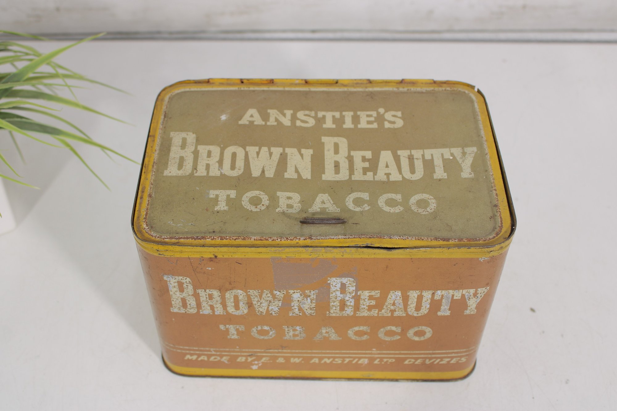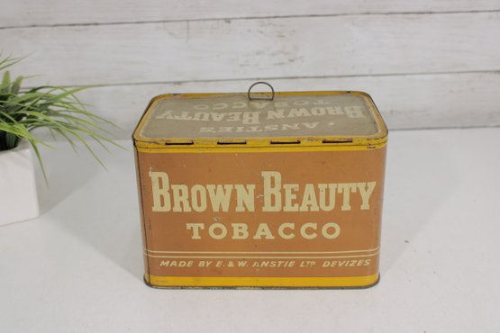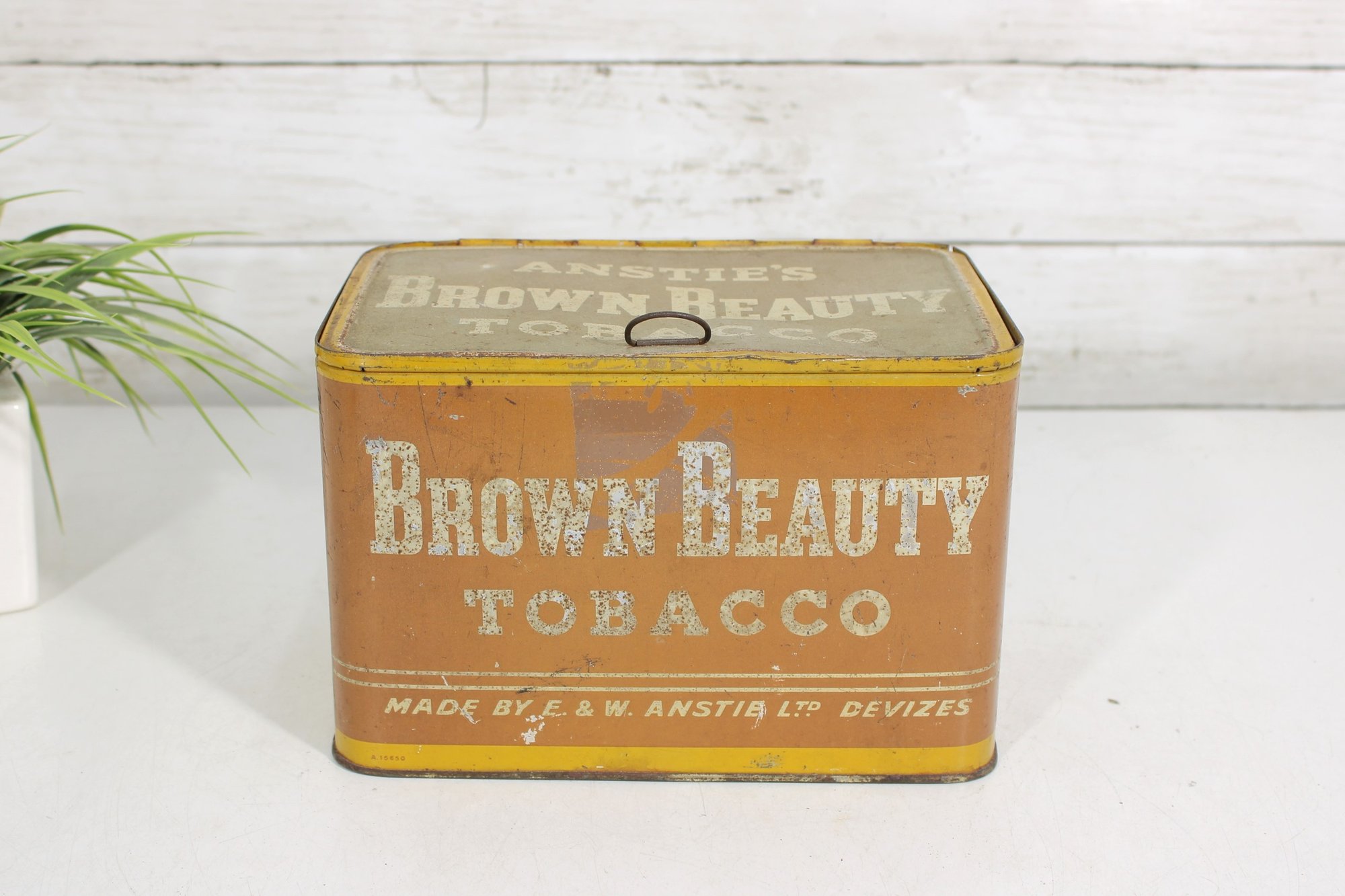vintage Anstie’s “Brown Beauty” Tobacco tin, a classic advertising container produced by E. W. Anstie of Devizes, England. The tin features bold brown and yellow lithographed graphics with the wording “Brown Beauty Tobacco” prominently displayed on multiple sides and the lid.