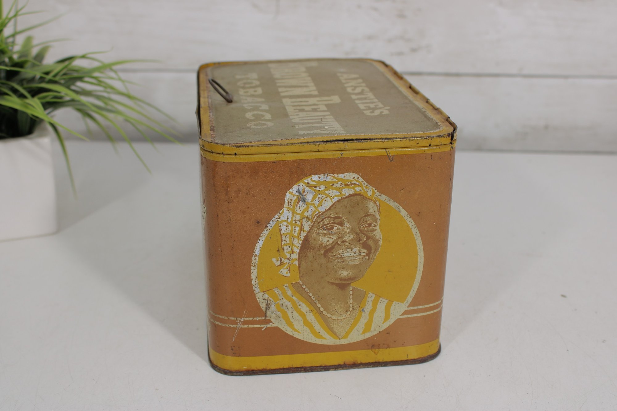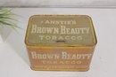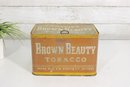 One side displays a portrait medallion graphic associated with the Brown Beauty brand. The tin has a removable lid with finger pull and a spacious interior that once held pipe tobacco. Pieces like this are highly collectible among tobacciana and vintage advertising tin collectors.
