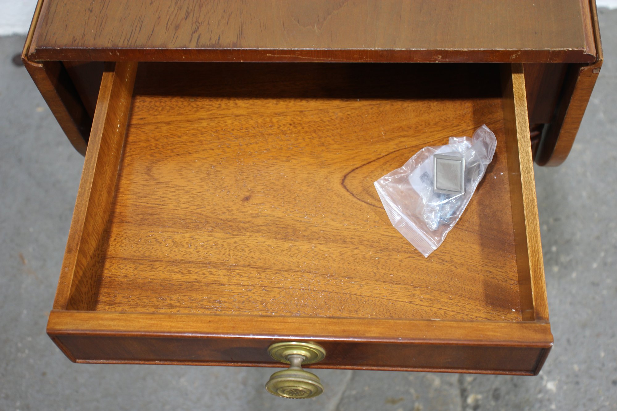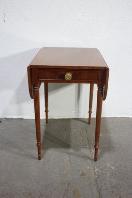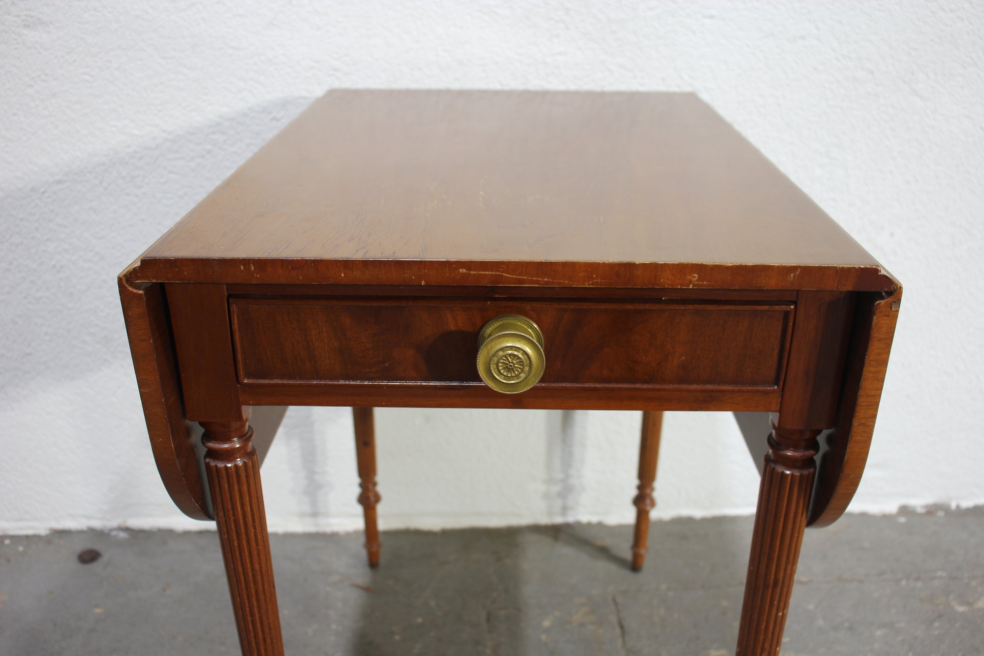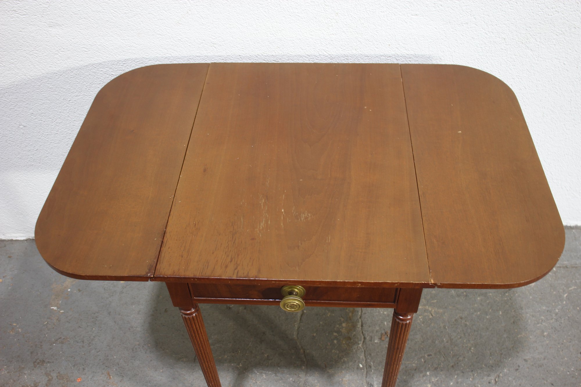 Vintage, Antique Federal Style Drop-Leaf Table. Has a single dovetailed drawer with Brass pull, Reeded legs and Brass Capped Feet.