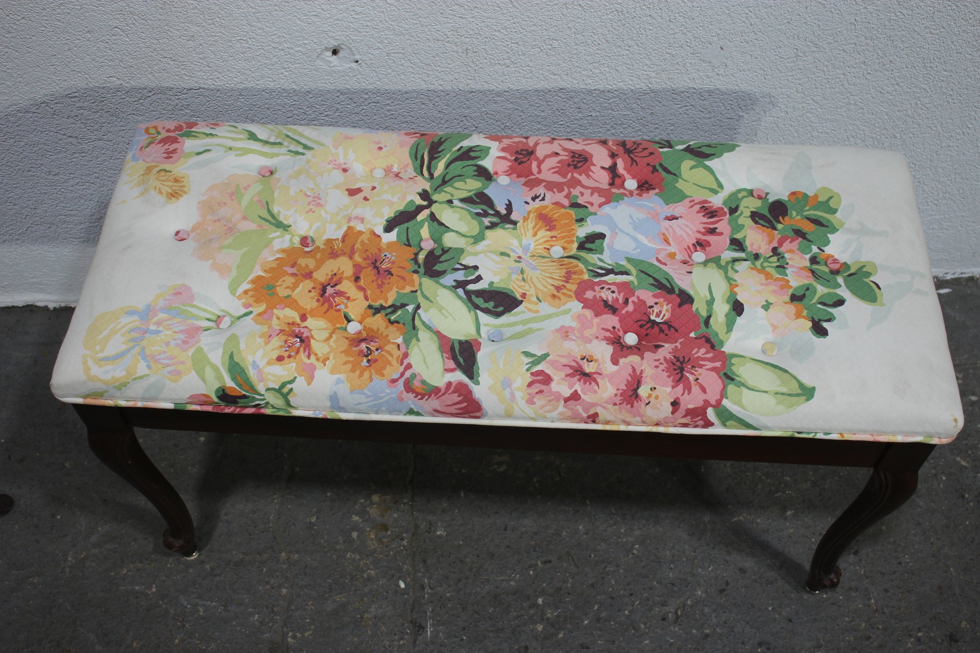 Vintage, Antique Floral Upholstered Bench with Queen Anne Style legs. A beautiful accent piece for any room. In Good Used condition for age.