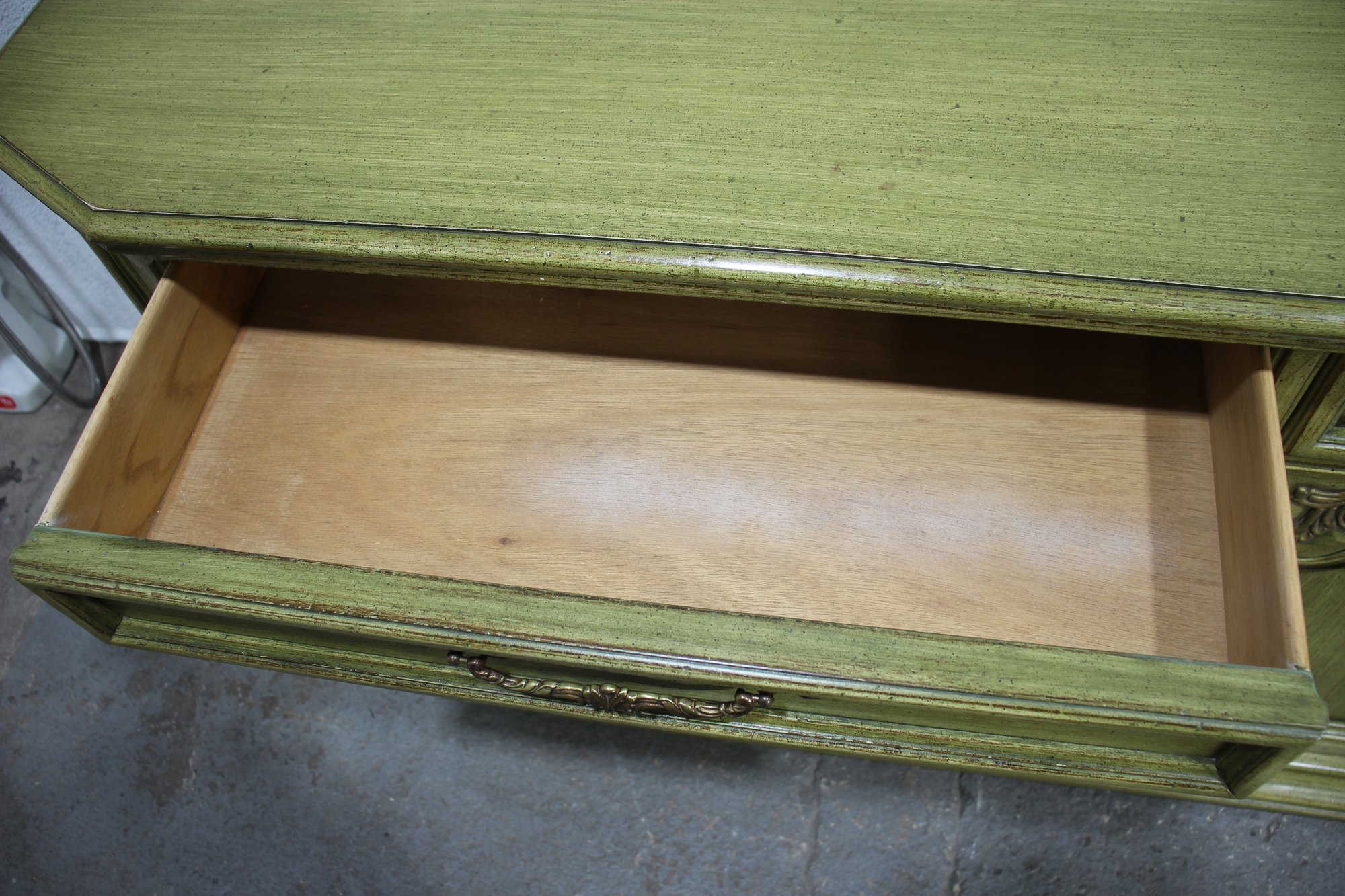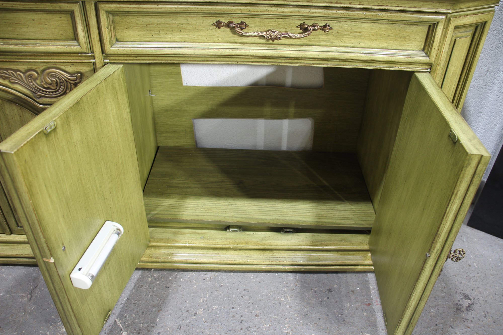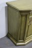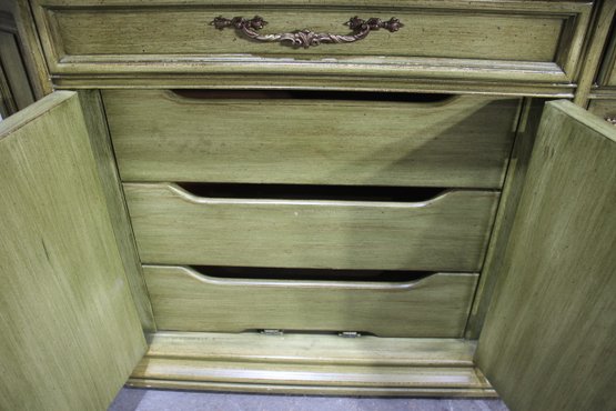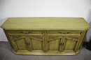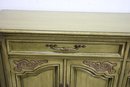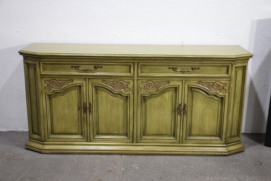 Vintage, French Country Sideboard Credenza. Has an antiqued green finish to it. Featuring two sets of side by side drawers, with one side offering three pull out drawers.