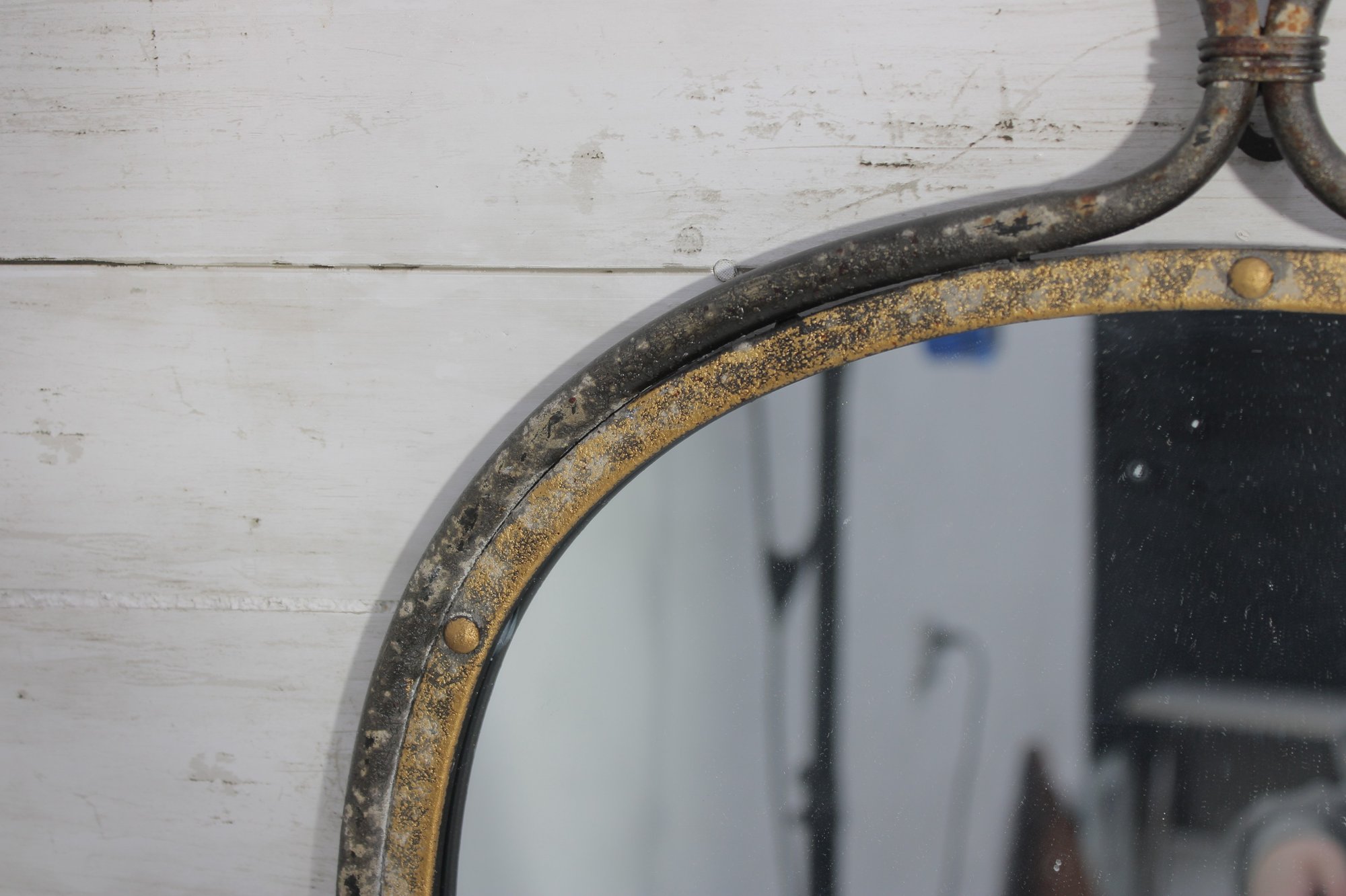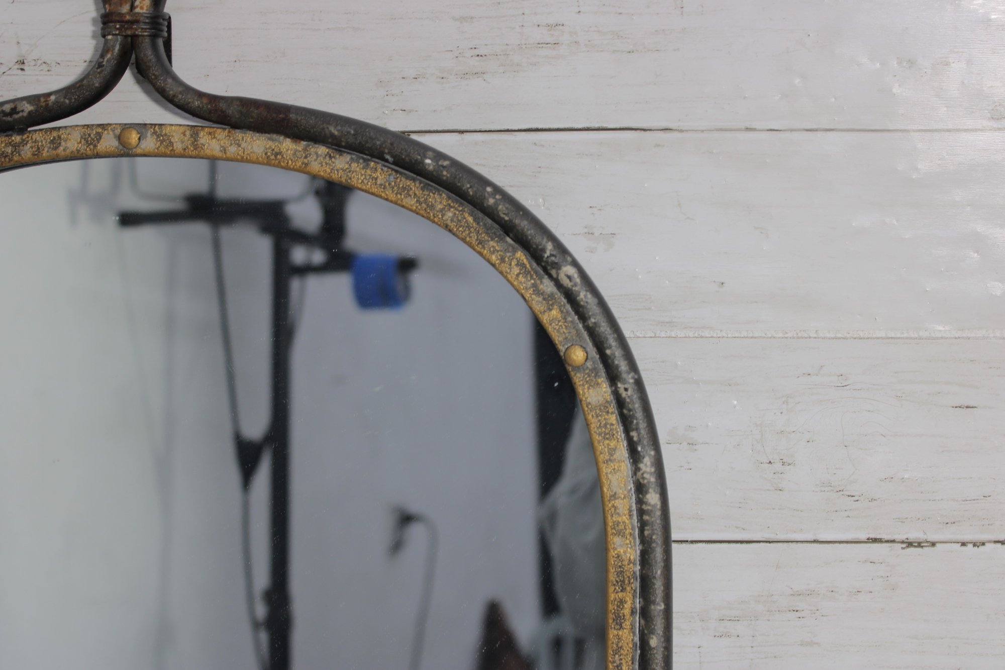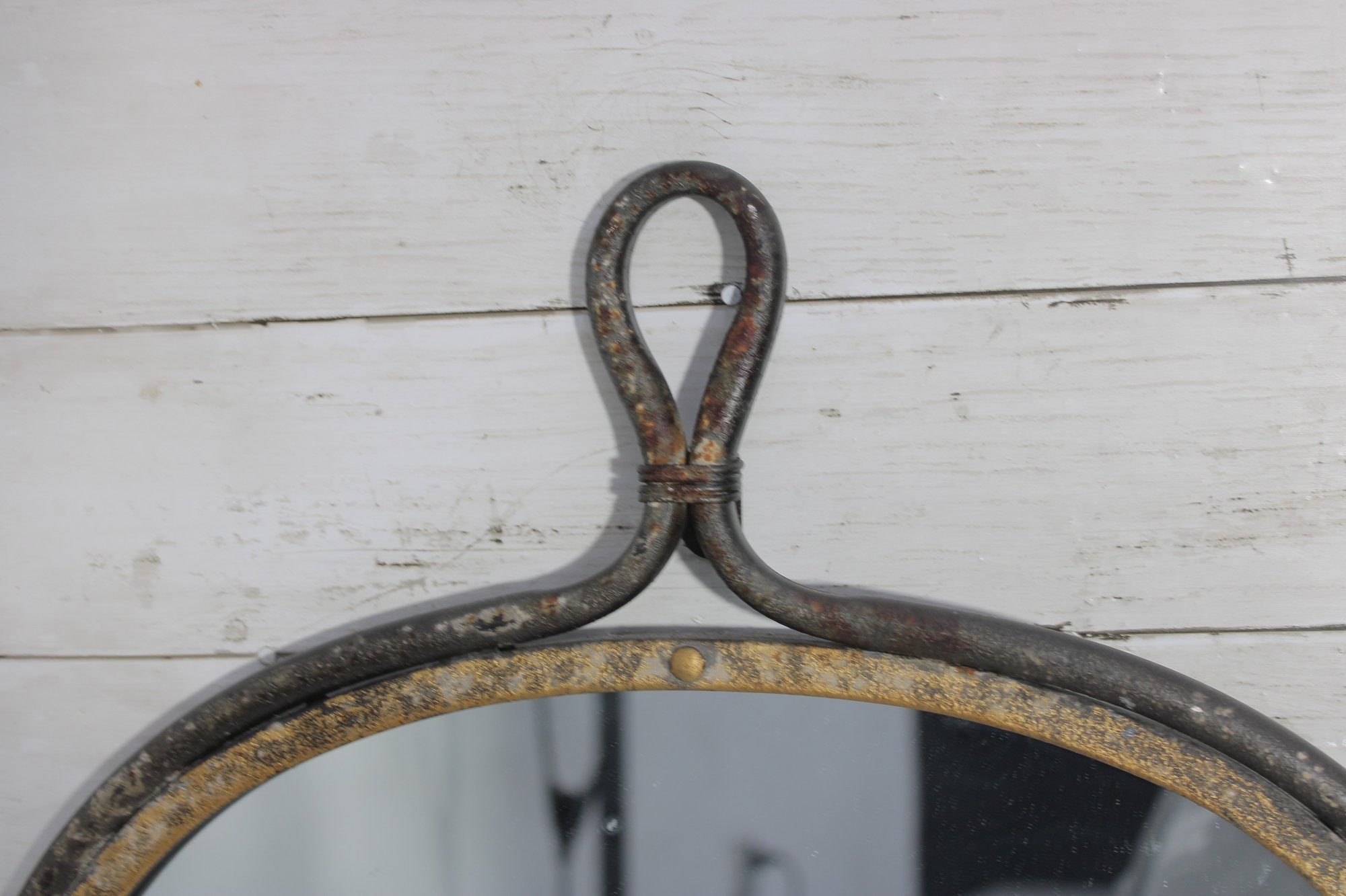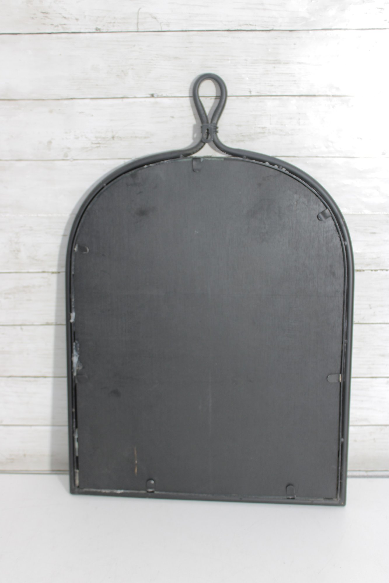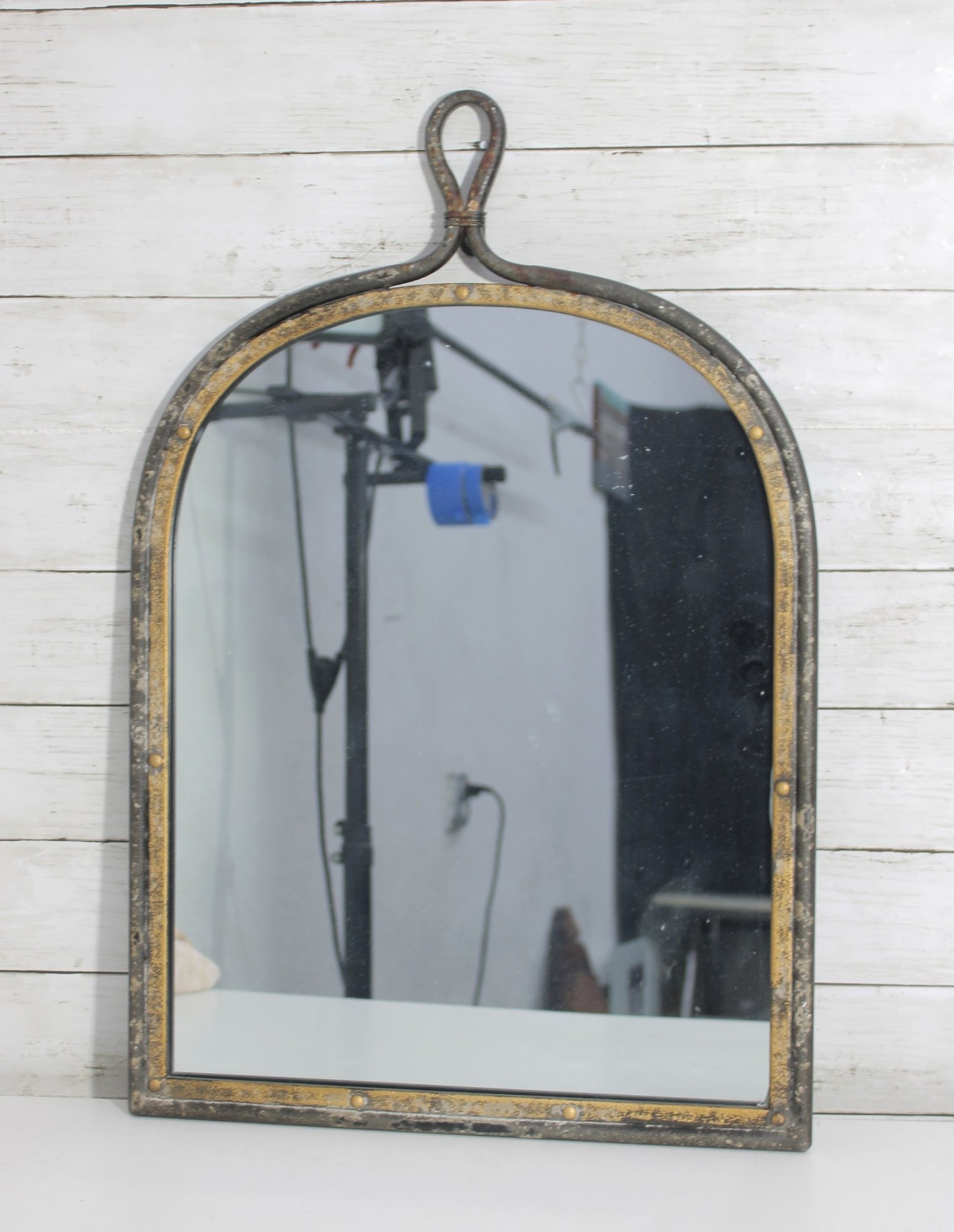 Add character and industrial charm to your space with this vintage-style arched wall mirror, featuring a unique loop handle top and distressed metal frame.