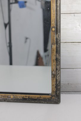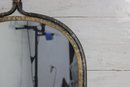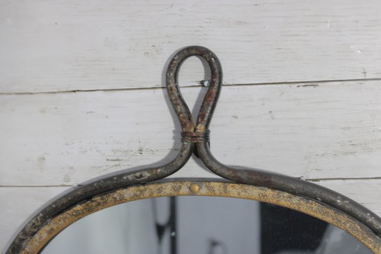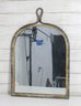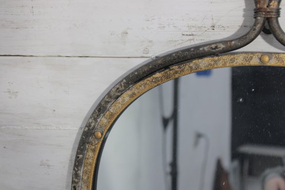 The mirror has a classic arched silhouette with a sturdy metal frame accented by a warm, aged finish with gold-tone detailing and visible patina. The loop handle at the top adds both visual interest and functionality, making it easy to hang while enhancing its industrial and rustic appeal.
