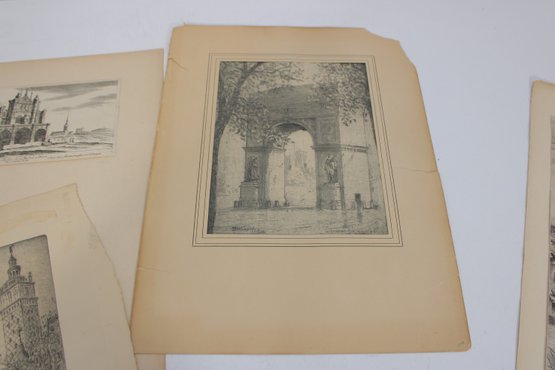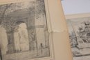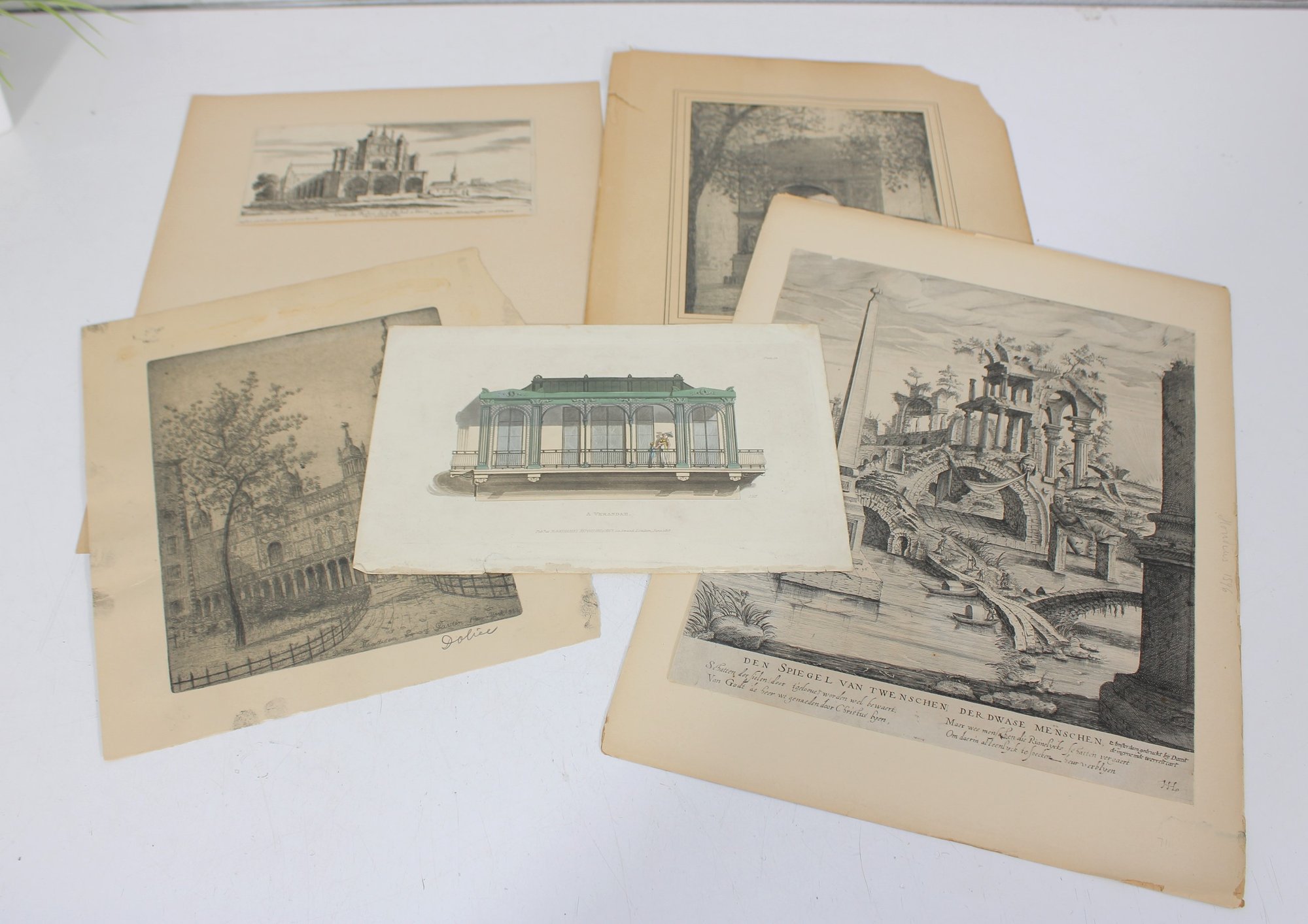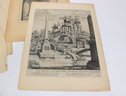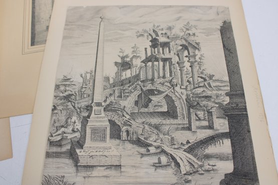 The prints appear to be removed from antique books or folios and are presented on aged paper with natural toning consistent with age. Several pieces feature decorative borders and captioned titles beneath the images.
