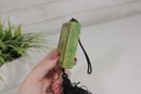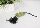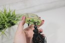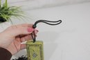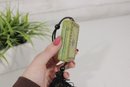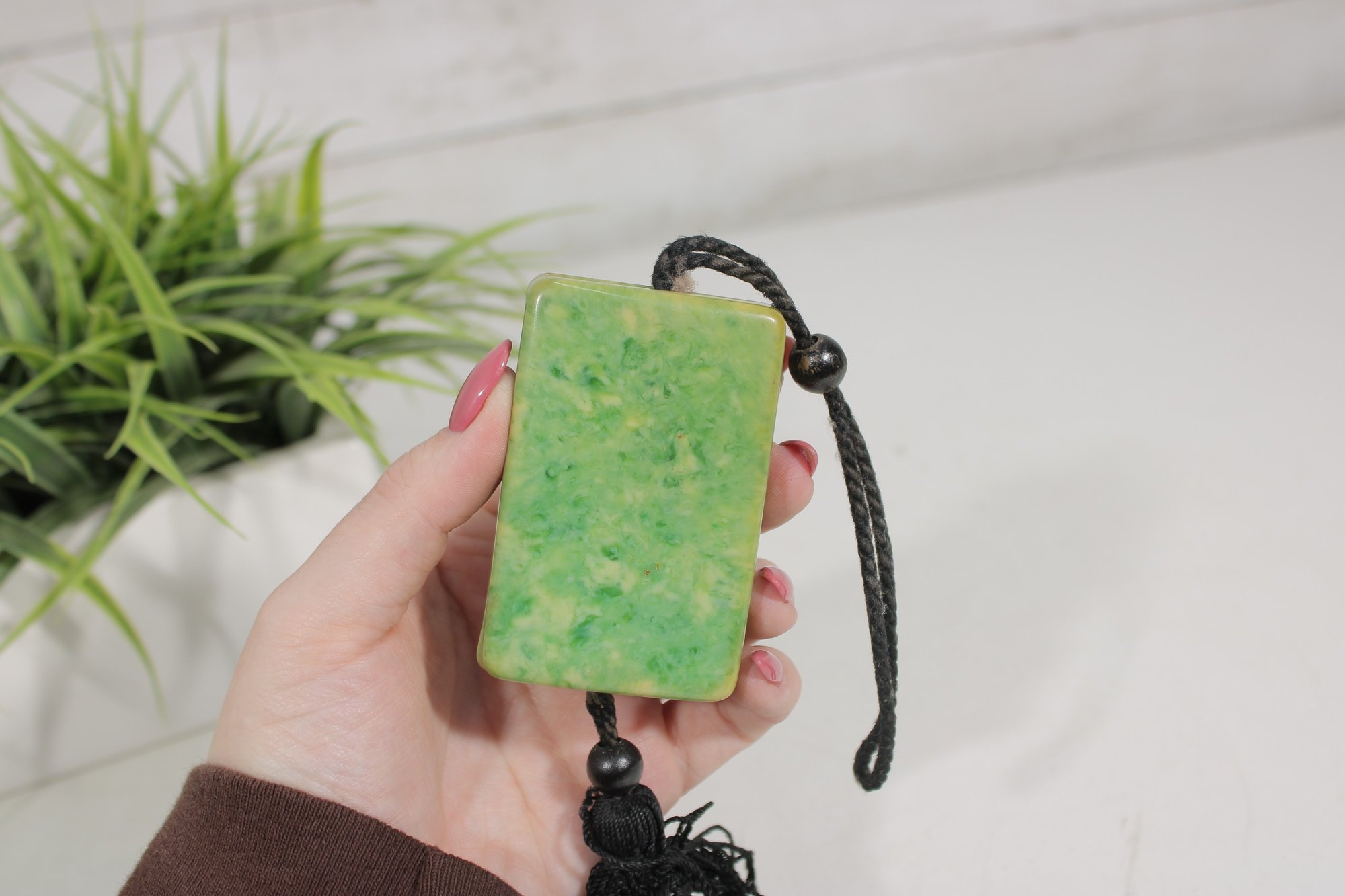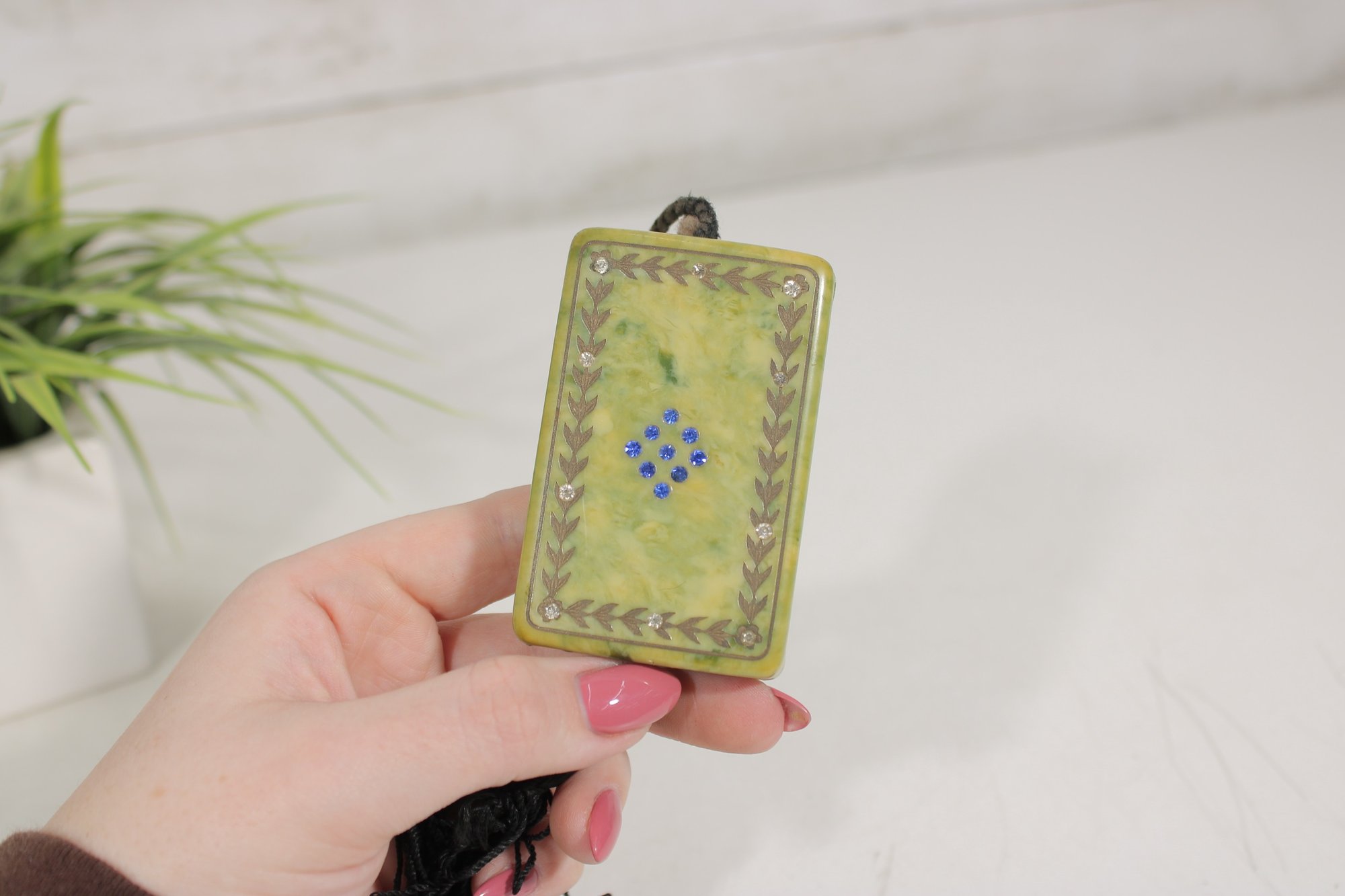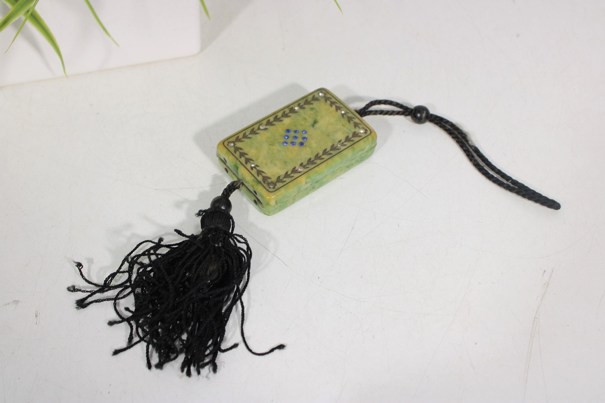 Beautiful Art Deco era celluloid compact featuring a striking green decorative exterior with geometric detailing and a classic rectangular shape. The compact is accented with a black cord wrist strap and decorative tassel, giving it the look of a small evening vanity accessory from the early 20th century.