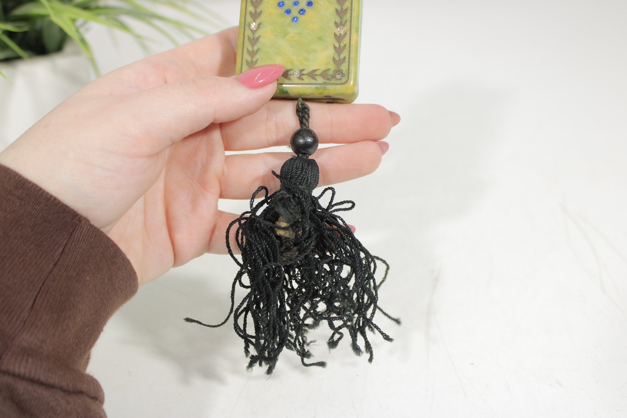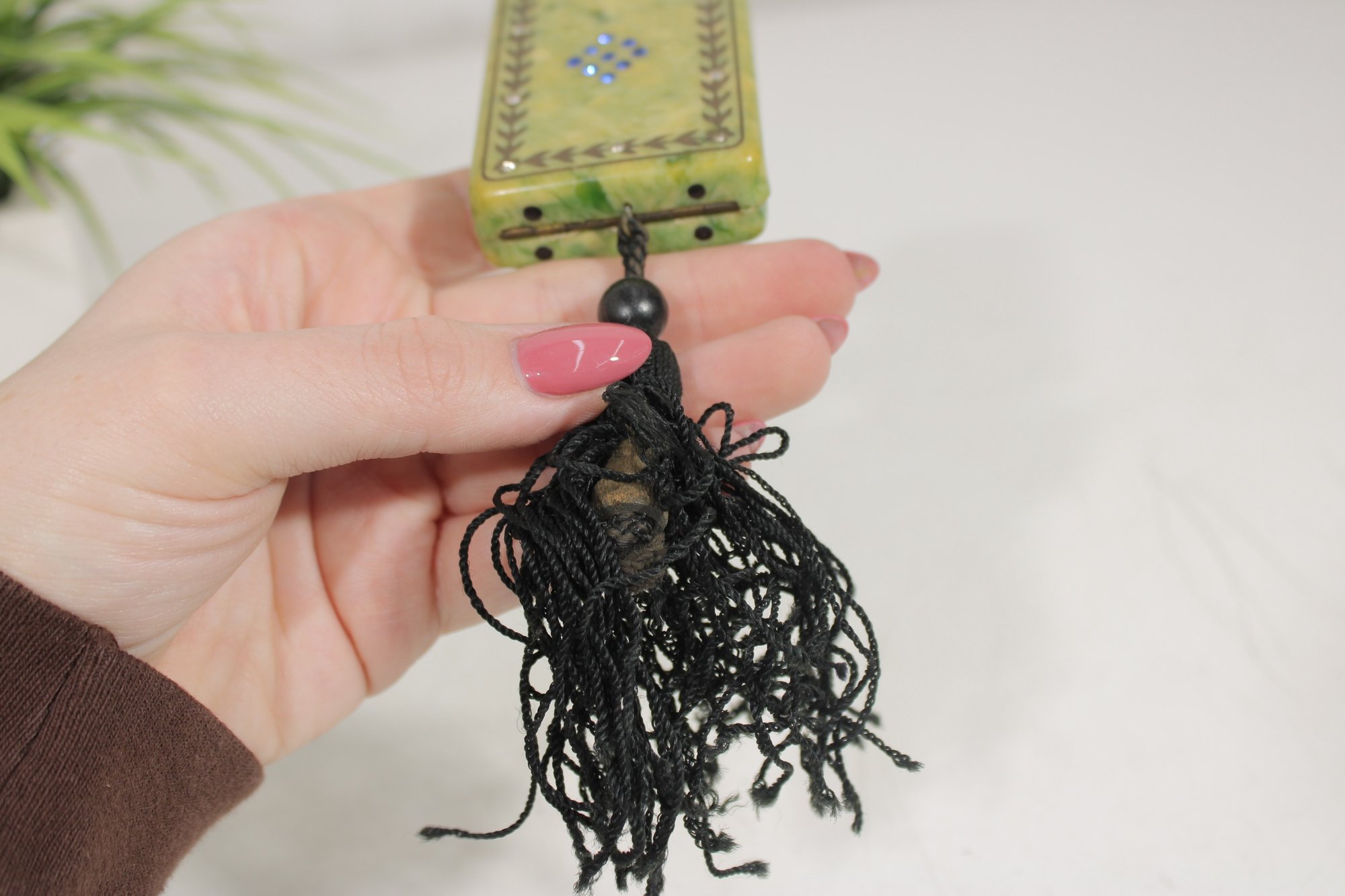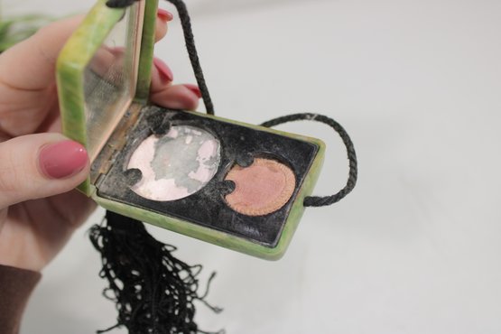 Celluloid compacts like this were popular during the 1920s–1930s Art Deco period, often carried as stylish purse accessories. The tassel and wrist strap make this example especially decorative and collectible.