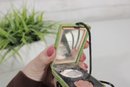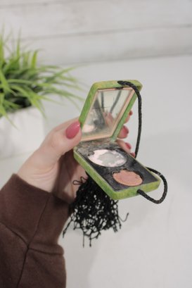 The lid opens to reveal an interior mirror and compartments that once held powder and rouge. The interior still shows traces of the original cosmetics, adding to its authentic vintage character.