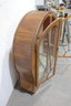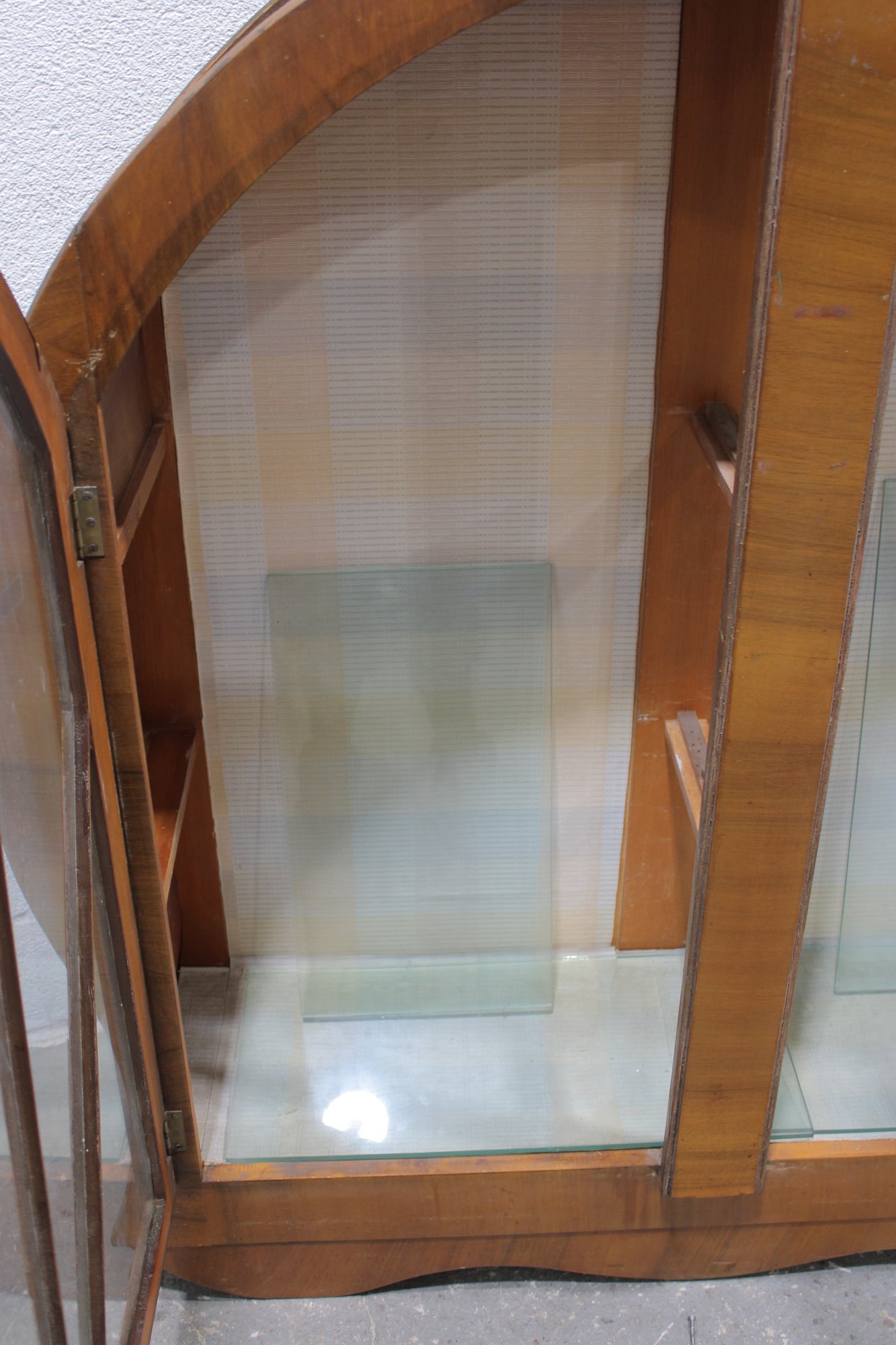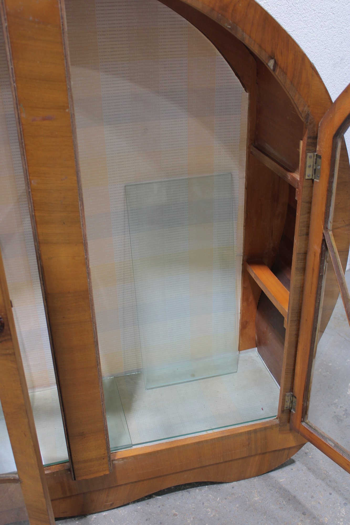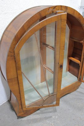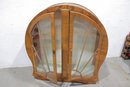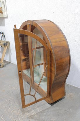 Unique vintage Art Deco style curved glass display cabinet/curio featuring a distinctive arched top and beautifully shaped case. This eye-catching piece showcases bent glass panels with geometric detailing and a warm wood veneer finish, giving it classic Deco appeal.