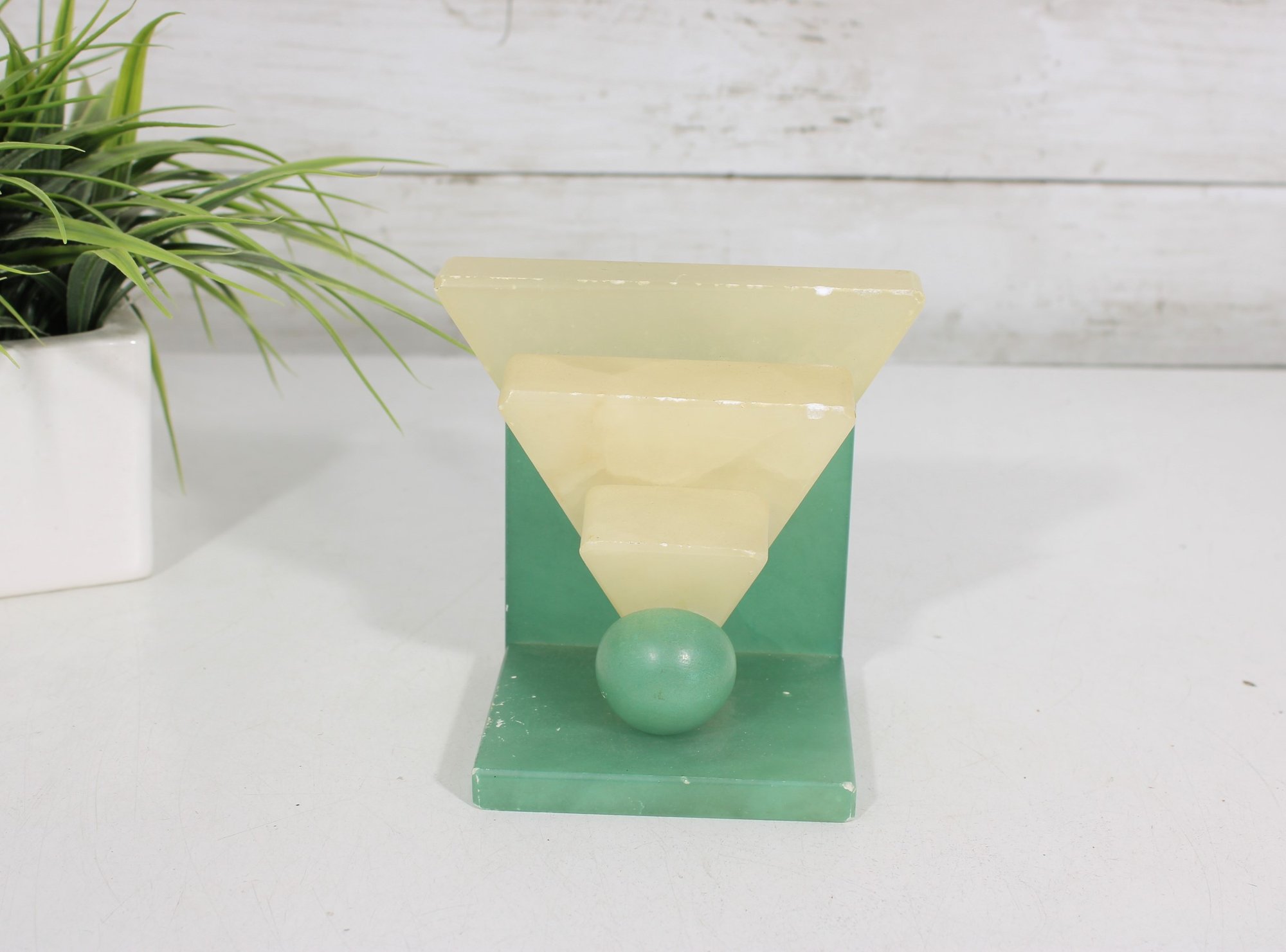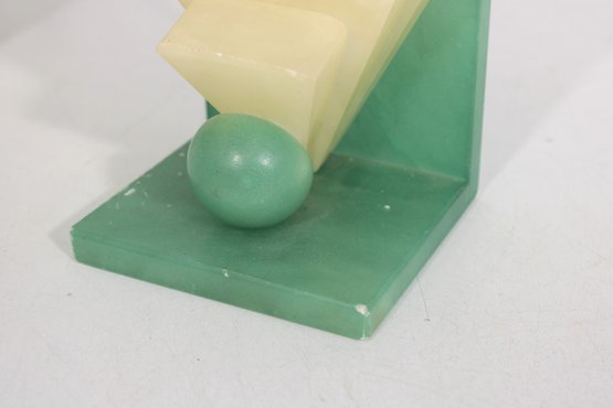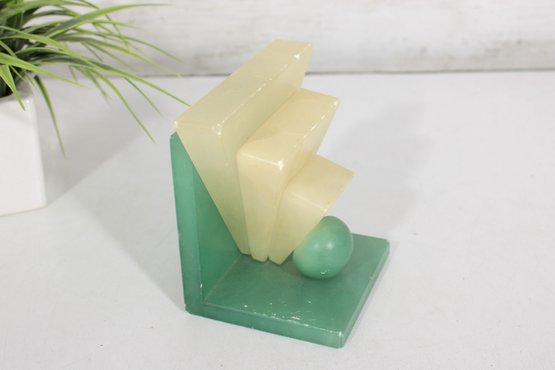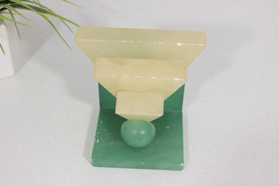 Striking vintage Art Deco hand-carved alabaster stone sculpture featuring a bold geometric design and contrasting stone colors. This sculptural piece showcases classic Deco styling with stepped architectural forms, a polished sphere element, and a sleek triangular base in soft green alabaster.