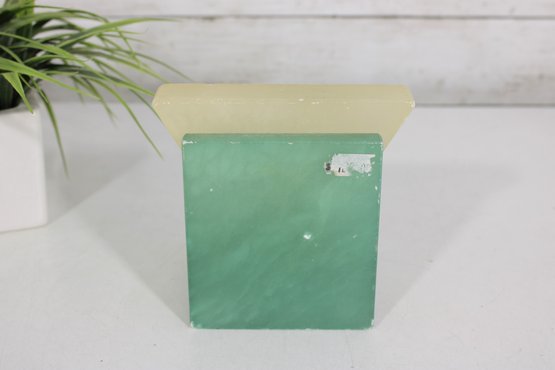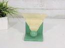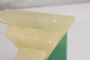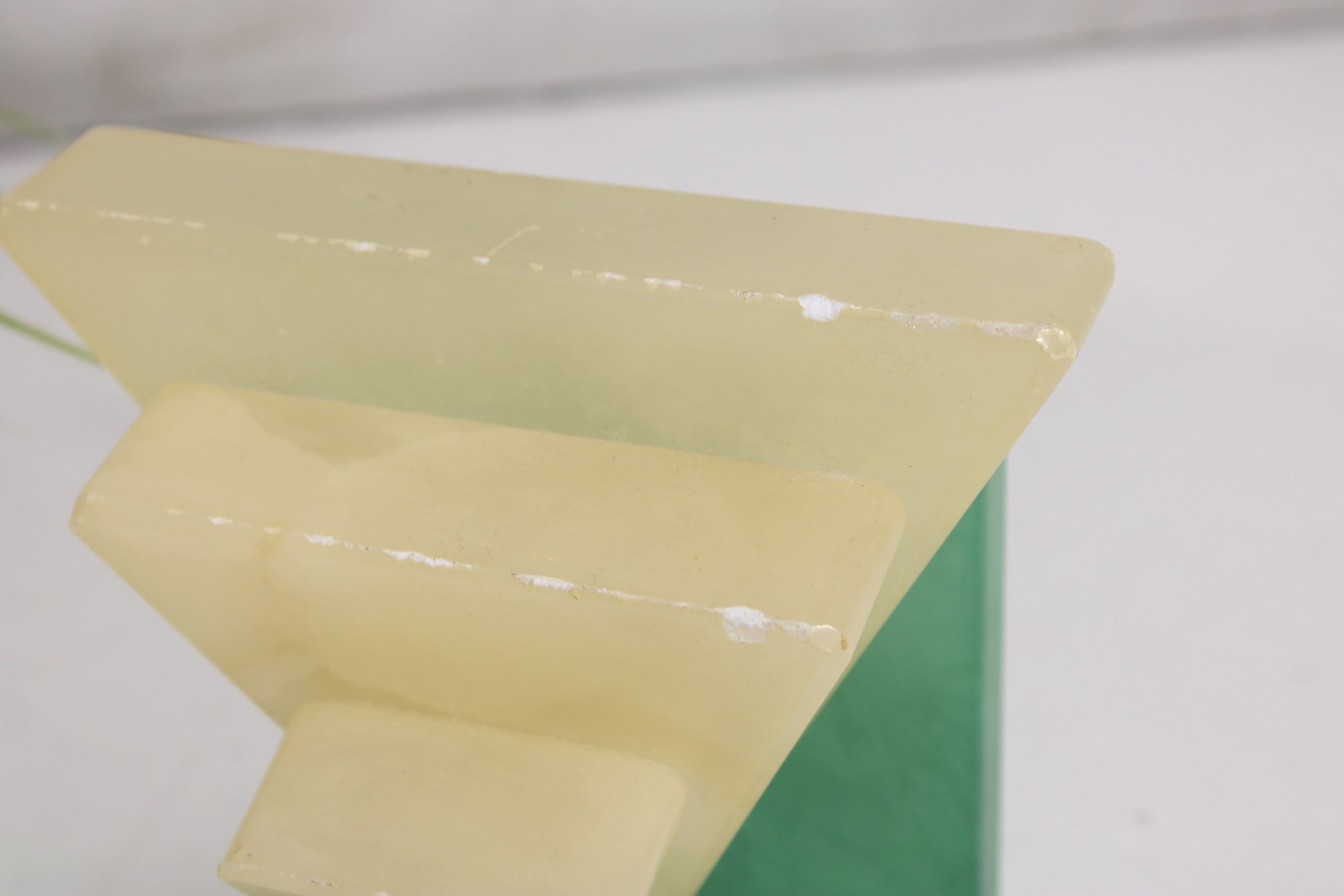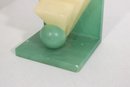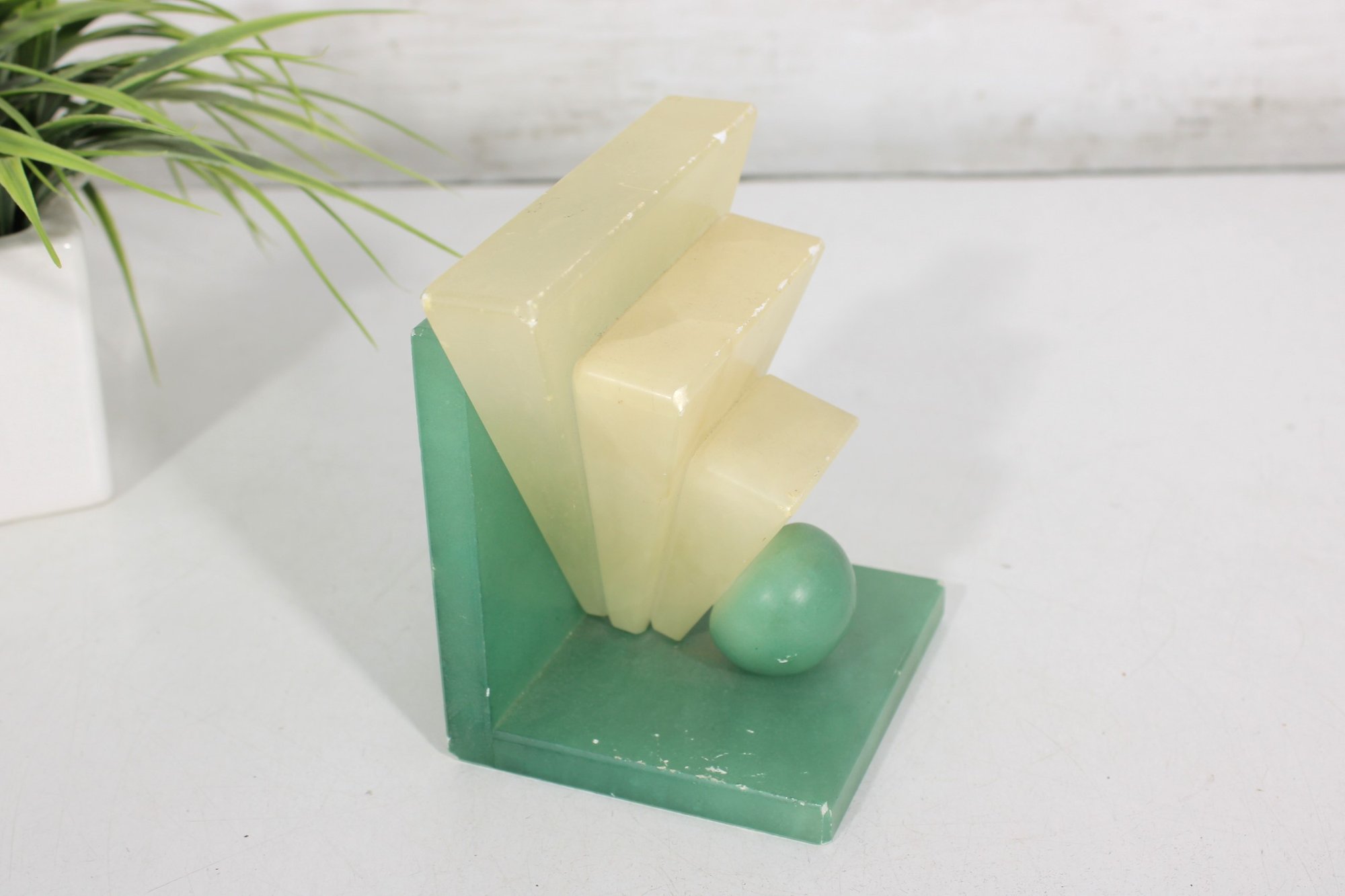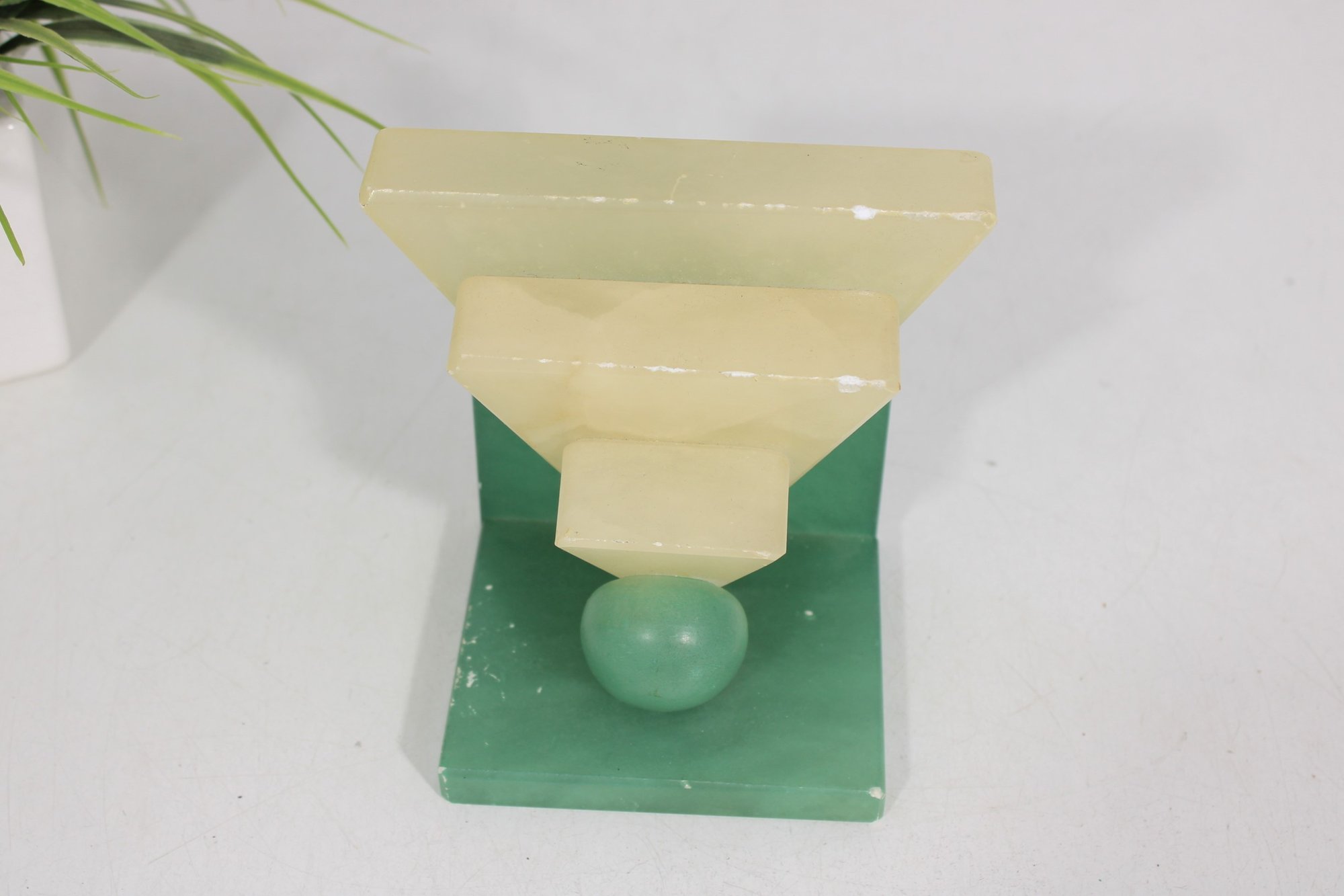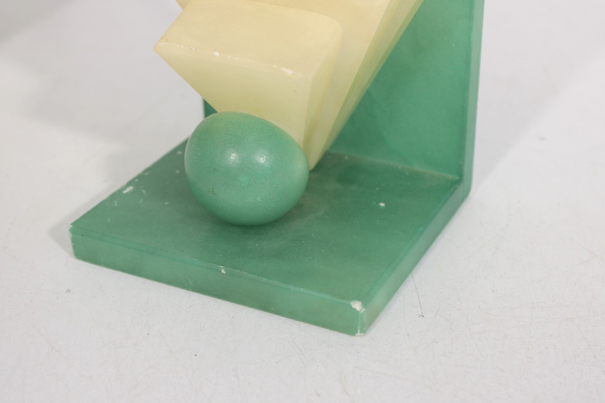 The upper portion is carved from creamy yellow alabaster, creating a beautiful contrast with the green base and sphere. The piece has a strong architectural presence reminiscent of 1920s–1930s Art Deco design and would make a wonderful decorative accent for a desk, shelf, or modernist collection.