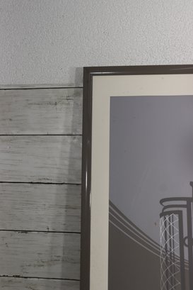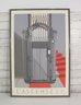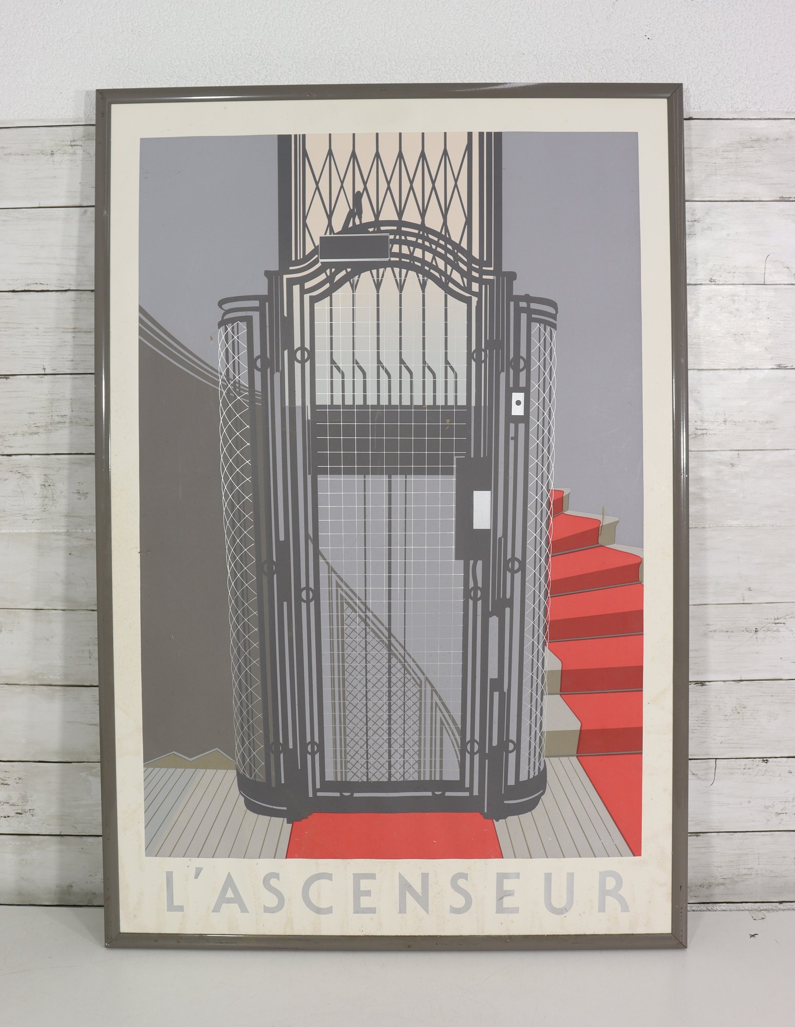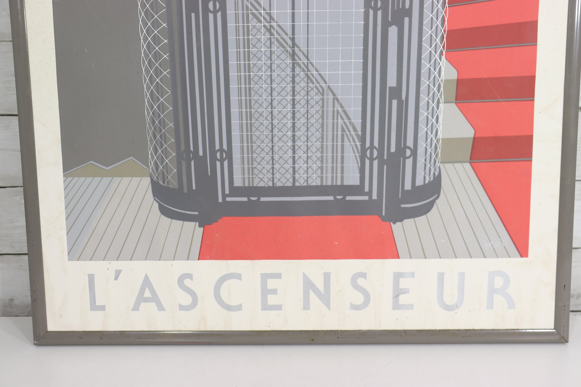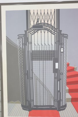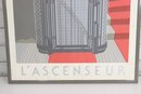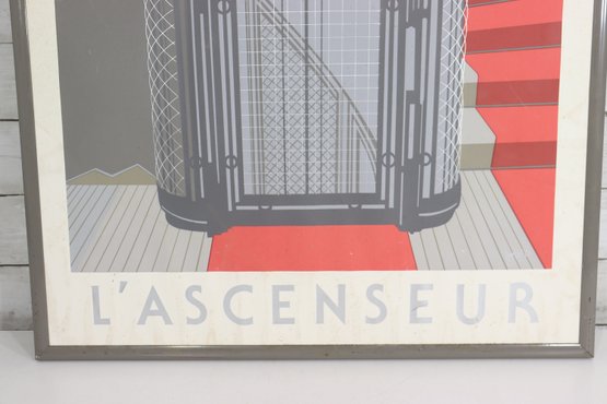 vintage-style Art Deco poster titled “L’Ascenseur”, featuring a bold architectural illustration of a classic elevator with dramatic geometric lines and a vivid red staircase. This graphic design captures the elegance and modernist aesthetic of early 20th-century European design, making it a standout statement piece for any space.