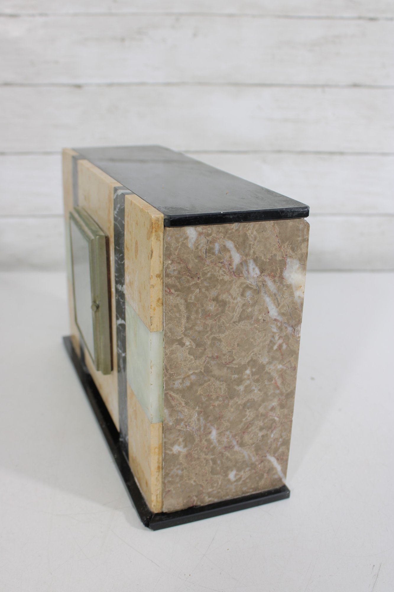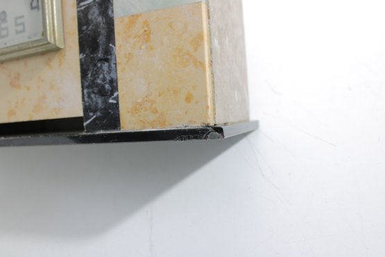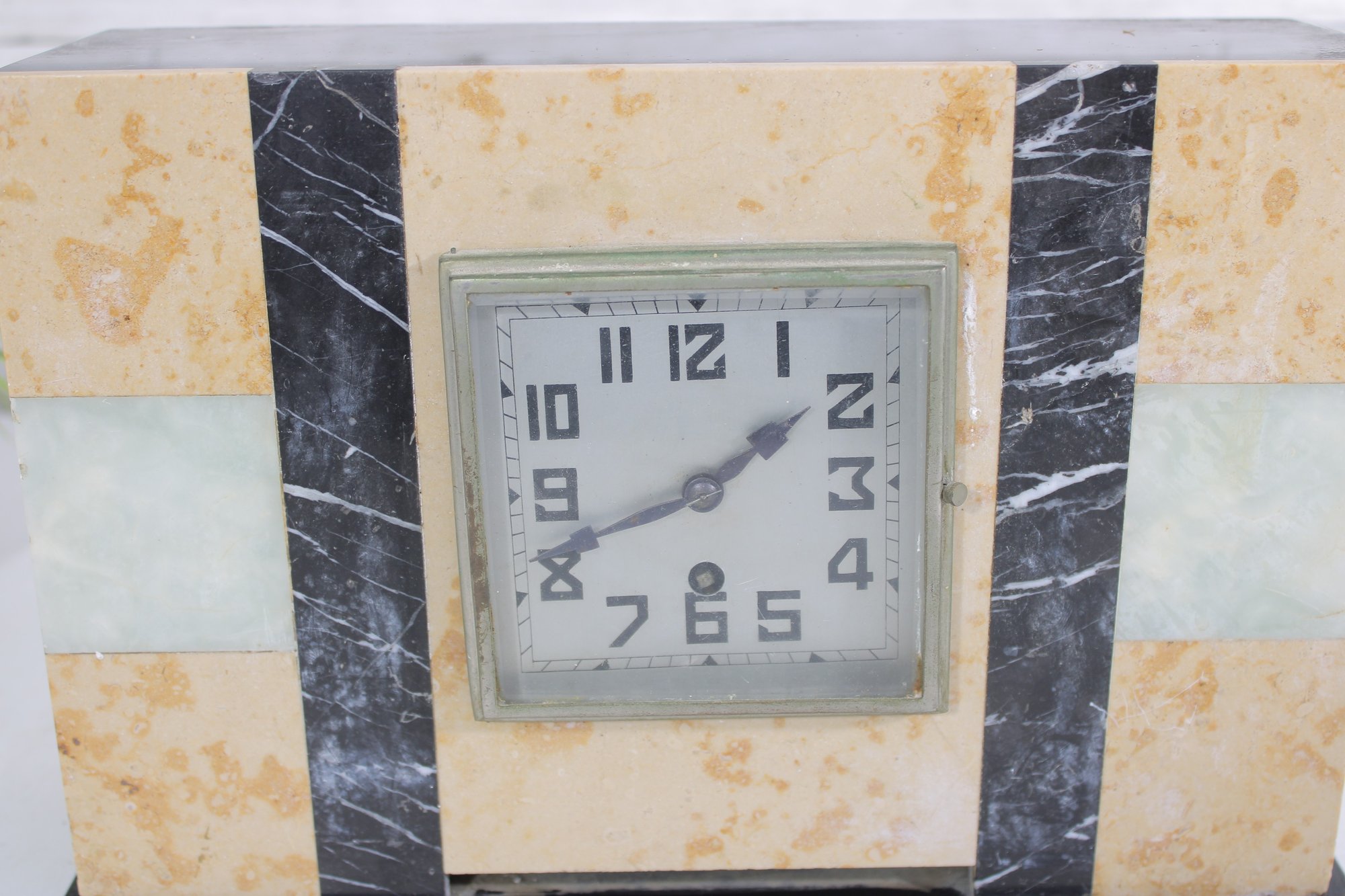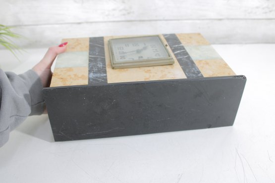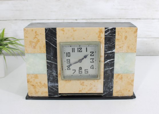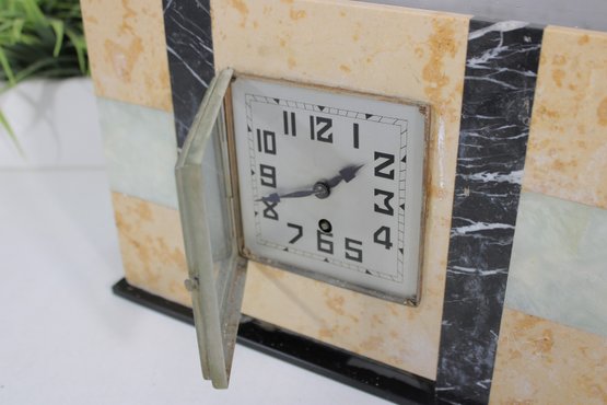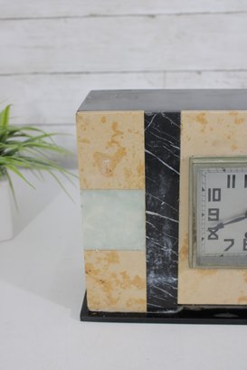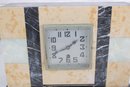 Vintage mantel clock featuring a classic Art Deco design with striking geometric lines and contrasting stone finishes. The case is constructed with a combination of marble showcasing warm cream and tan tones accented by black and pale green bands for a bold, architectural look.