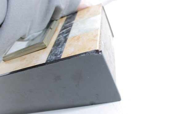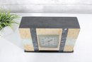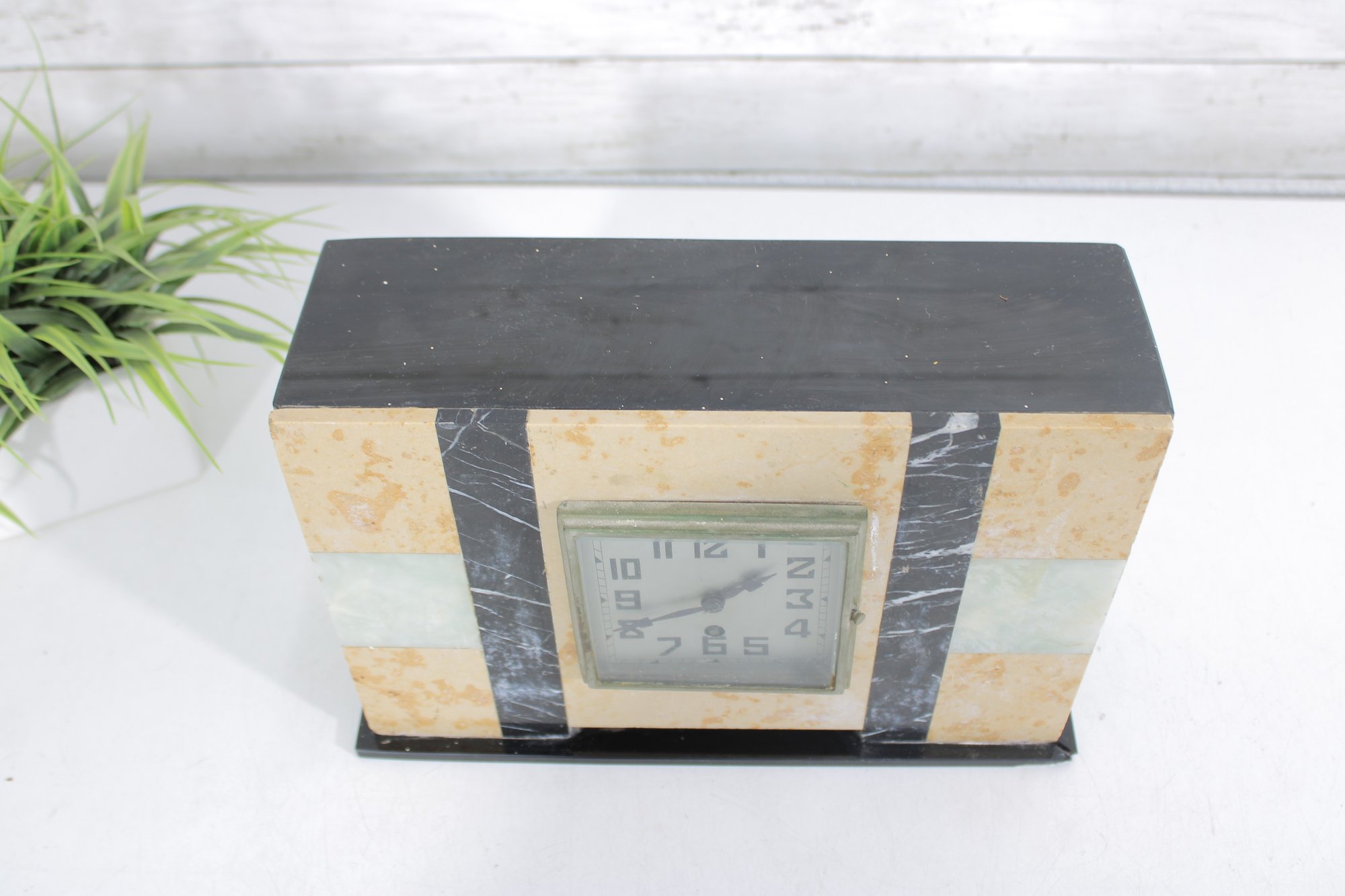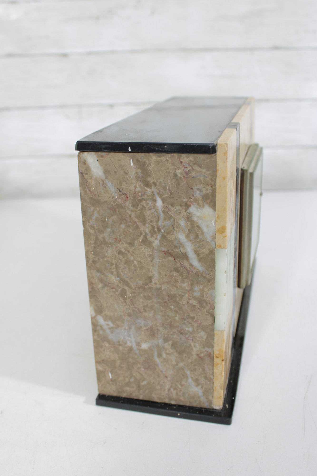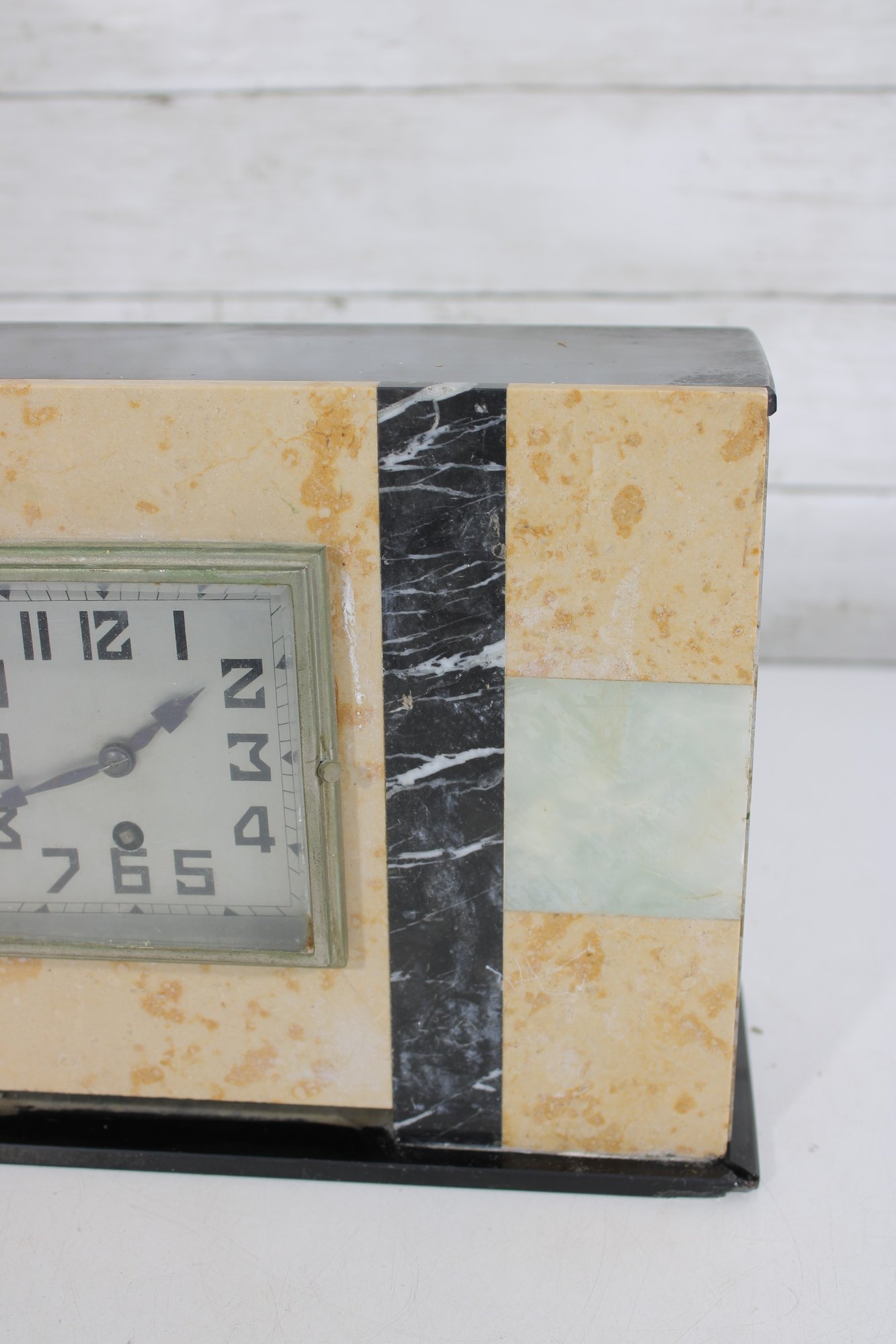 Vintage mantel clock featuring a classic Art Deco design with striking geometric lines and contrasting stone finishes. The case is constructed with a combination of marble showcasing warm cream and tan tones accented by black and pale green bands for a bold, architectural look.