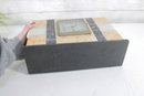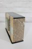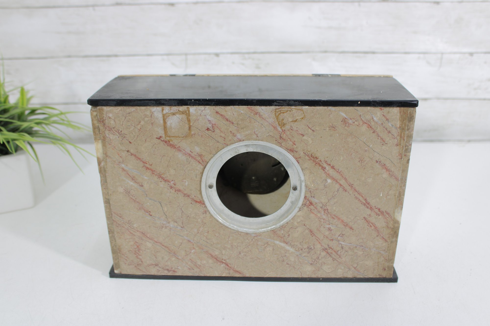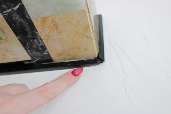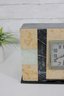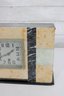 The square clock face is framed behind a hinged glass door, adding both protection and vintage charm. Its clean numeric dial and balanced proportions make it a timeless decorative piece suitable for a mantel, shelf, or desk display. HAS SOME CHIPS TO BASE