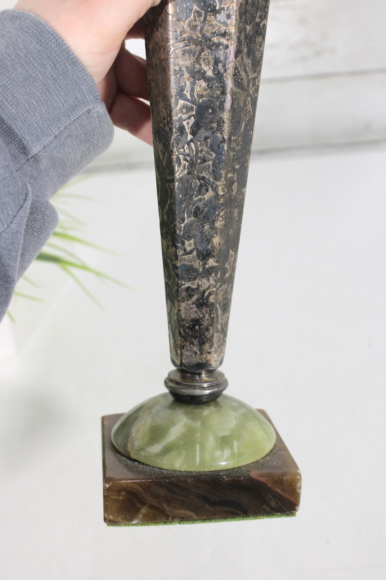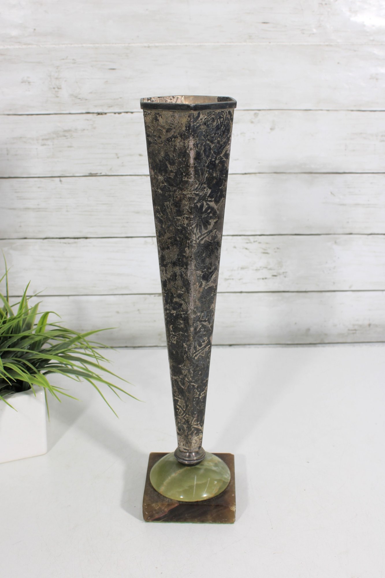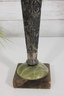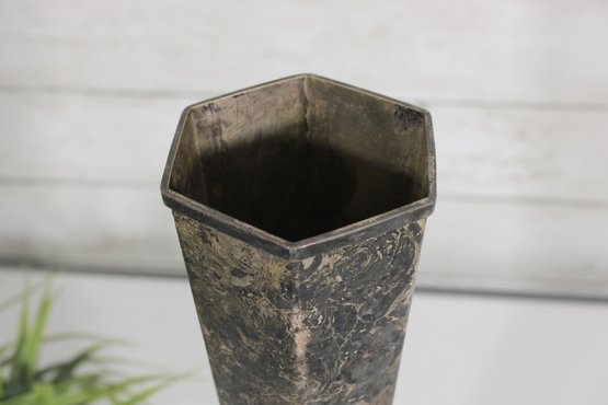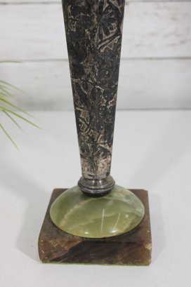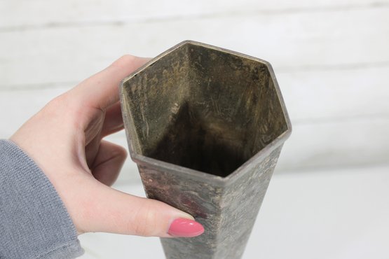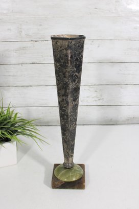 Striking vintage Art Deco style vase featuring a tall, tapered hexagonal metal body with a beautifully aged patina. The piece is mounted on a decorative green onyx base with a square foot, giving it a bold and elegant architectural presence.