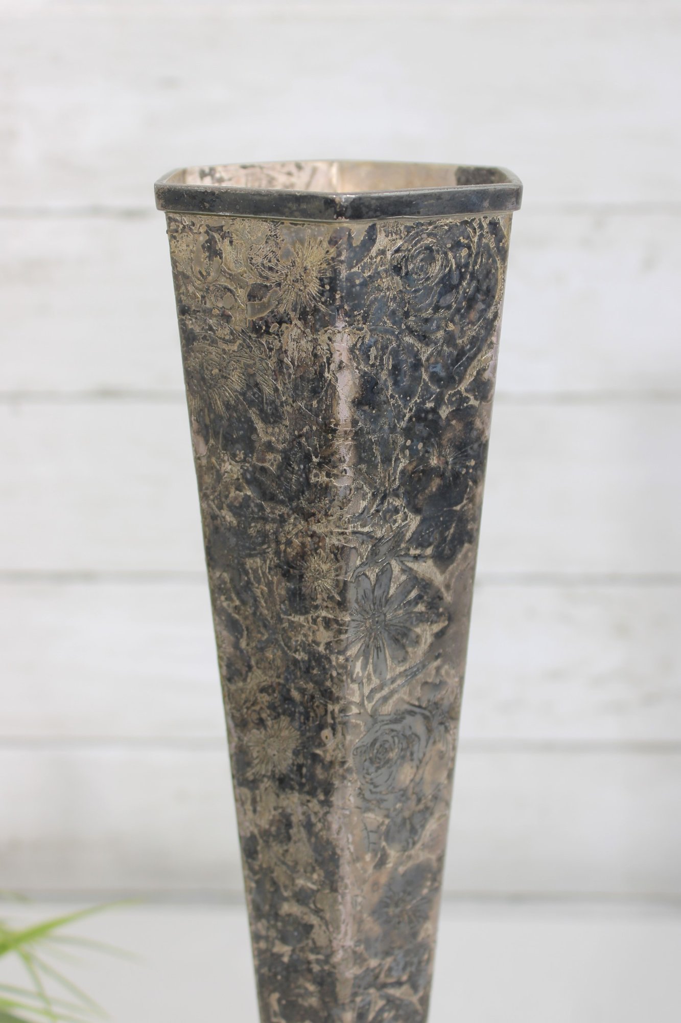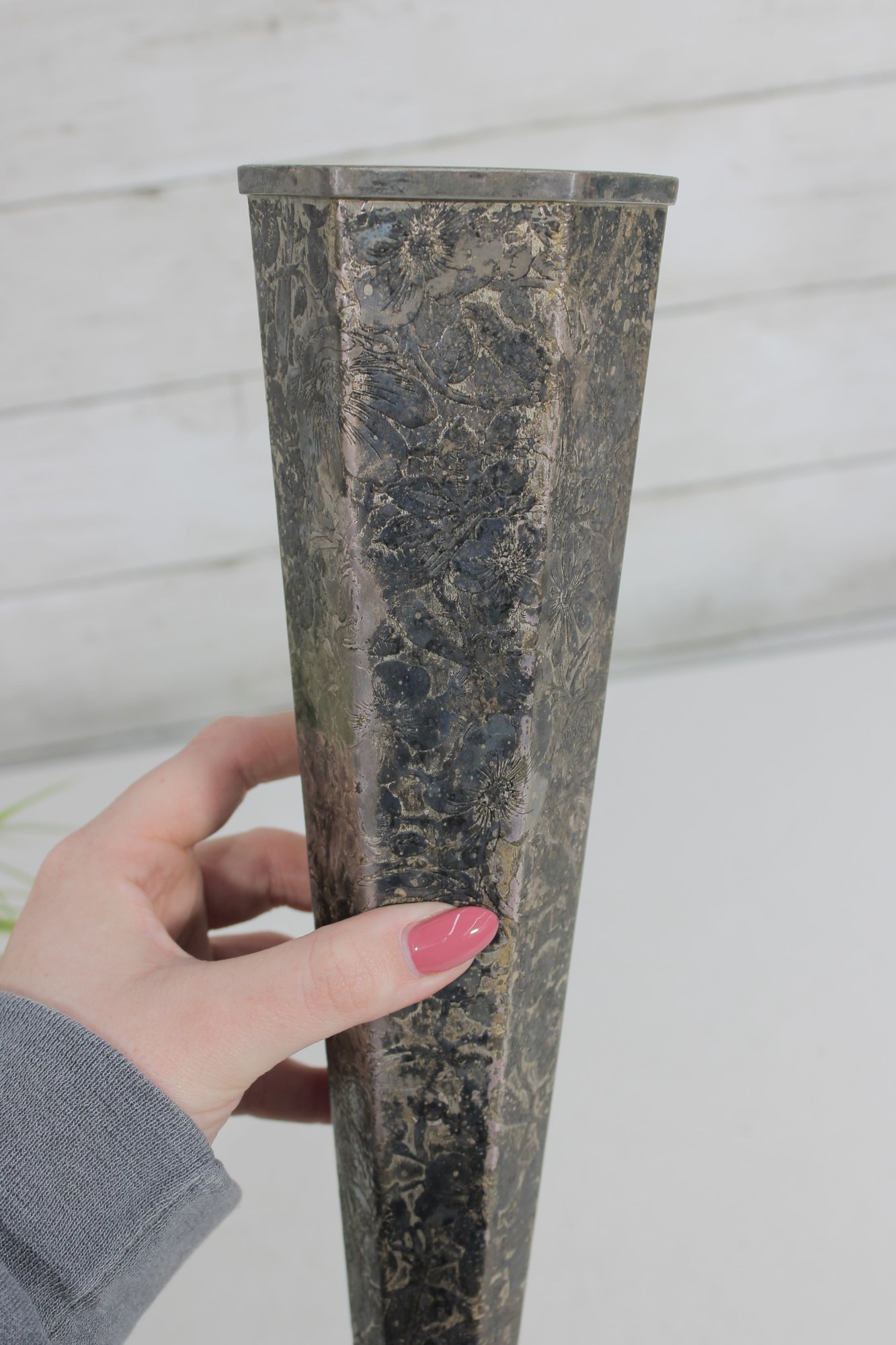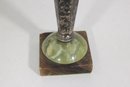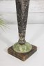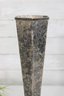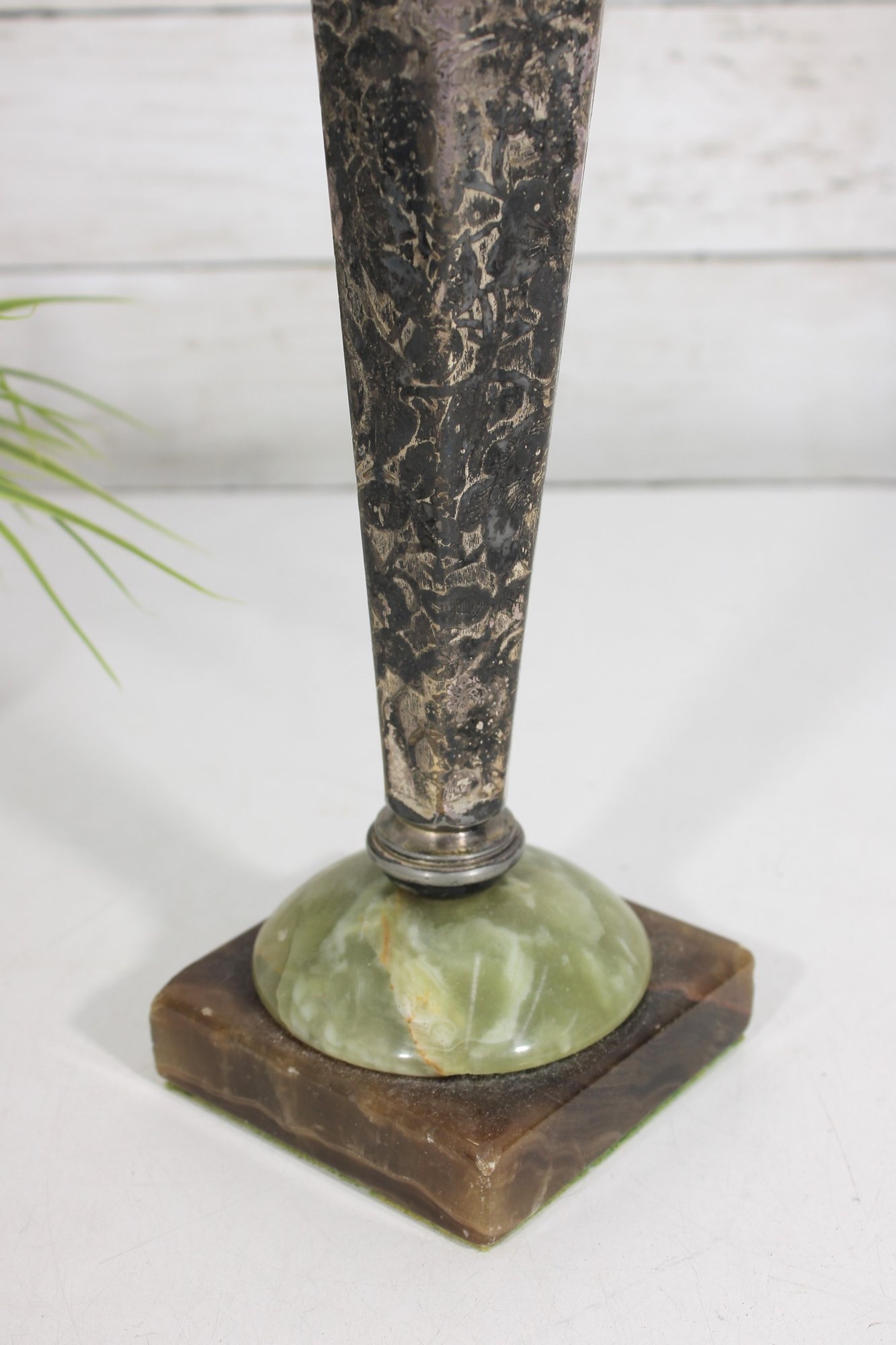 Striking vintage Art Deco style vase featuring a tall, tapered hexagonal metal body with a beautifully aged patina. The piece is mounted on a decorative green onyx base with a square foot, giving it a bold and elegant architectural presence.