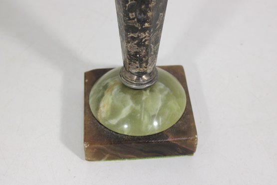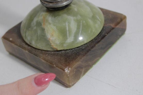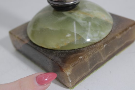 **Good vintage condition with age-appropriate wear. Metal shows patina, surface wear, and oxidation consistent with age. The onyx base has natural variations and minor wear. No major structural damage noted. Bottom shows typical wear from use.