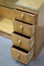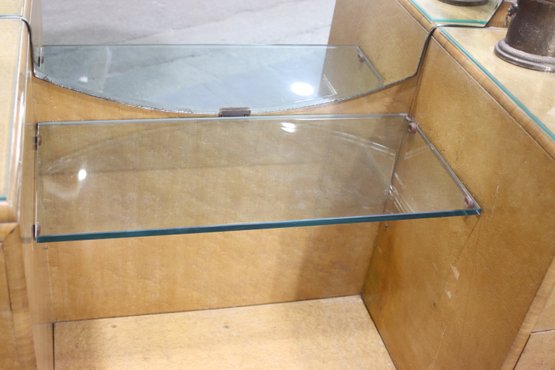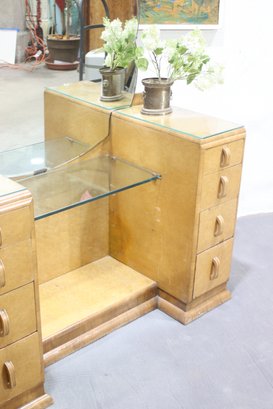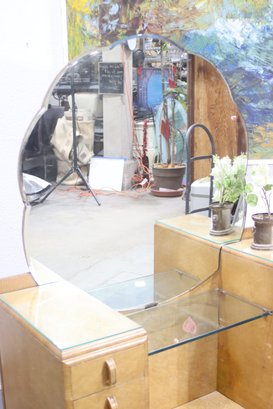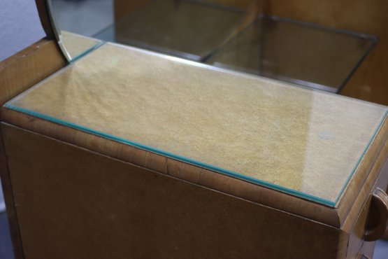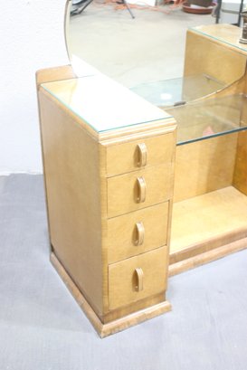 A stunning vintage Art Deco vanity, featuring a large round mirror, elegant glass top, and multiple storage drawers. This classic 1930s piece embodies the sleek, sophisticated design of the Art Deco era, with beautiful wood grain, curved details, and a functional layout.