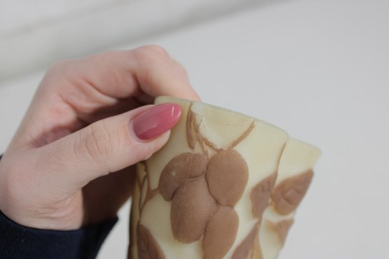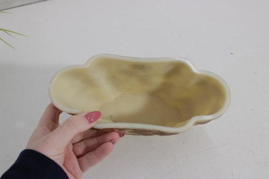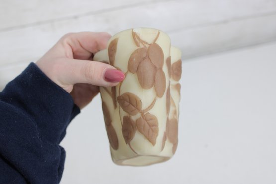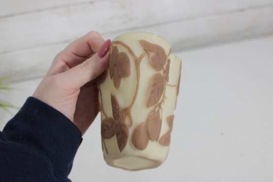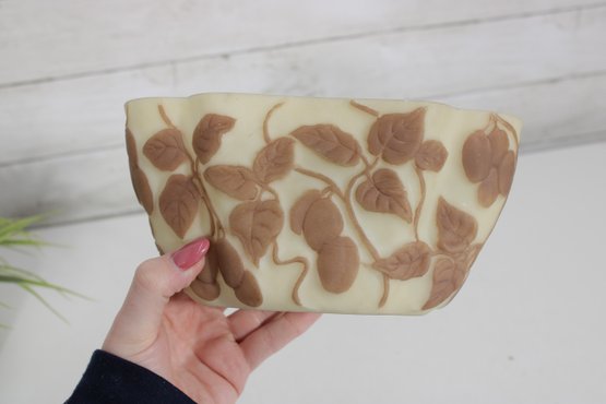Attractive vintage art glass bowl featuring a soft cream background with an overlaid brown leaf and vine motif in a cameo-style design. The organic, flowing shape with gently scalloped edges adds to its decorative appeal, making it a lovely accent piece for display or light use.