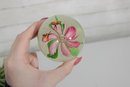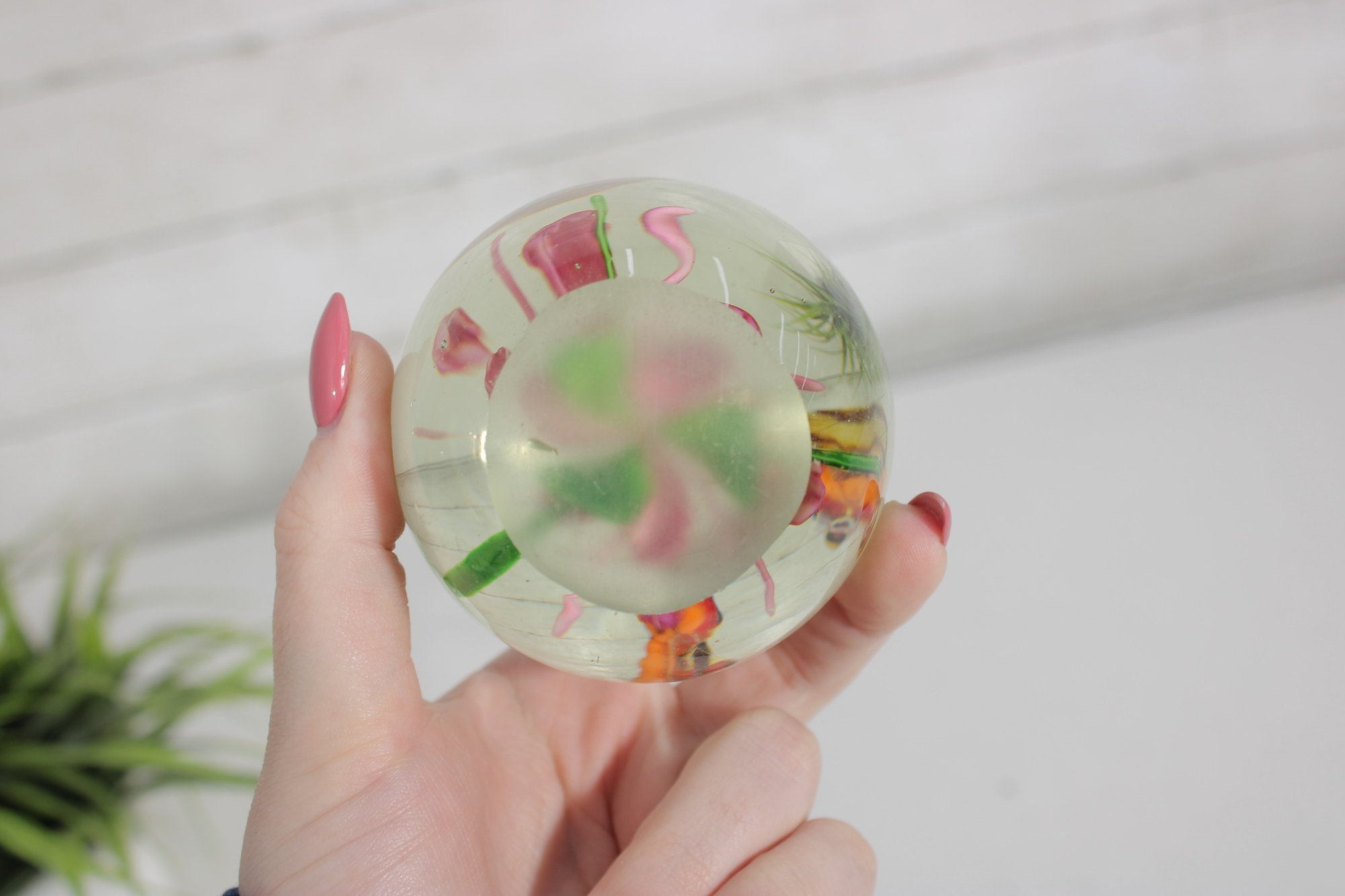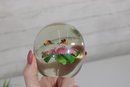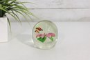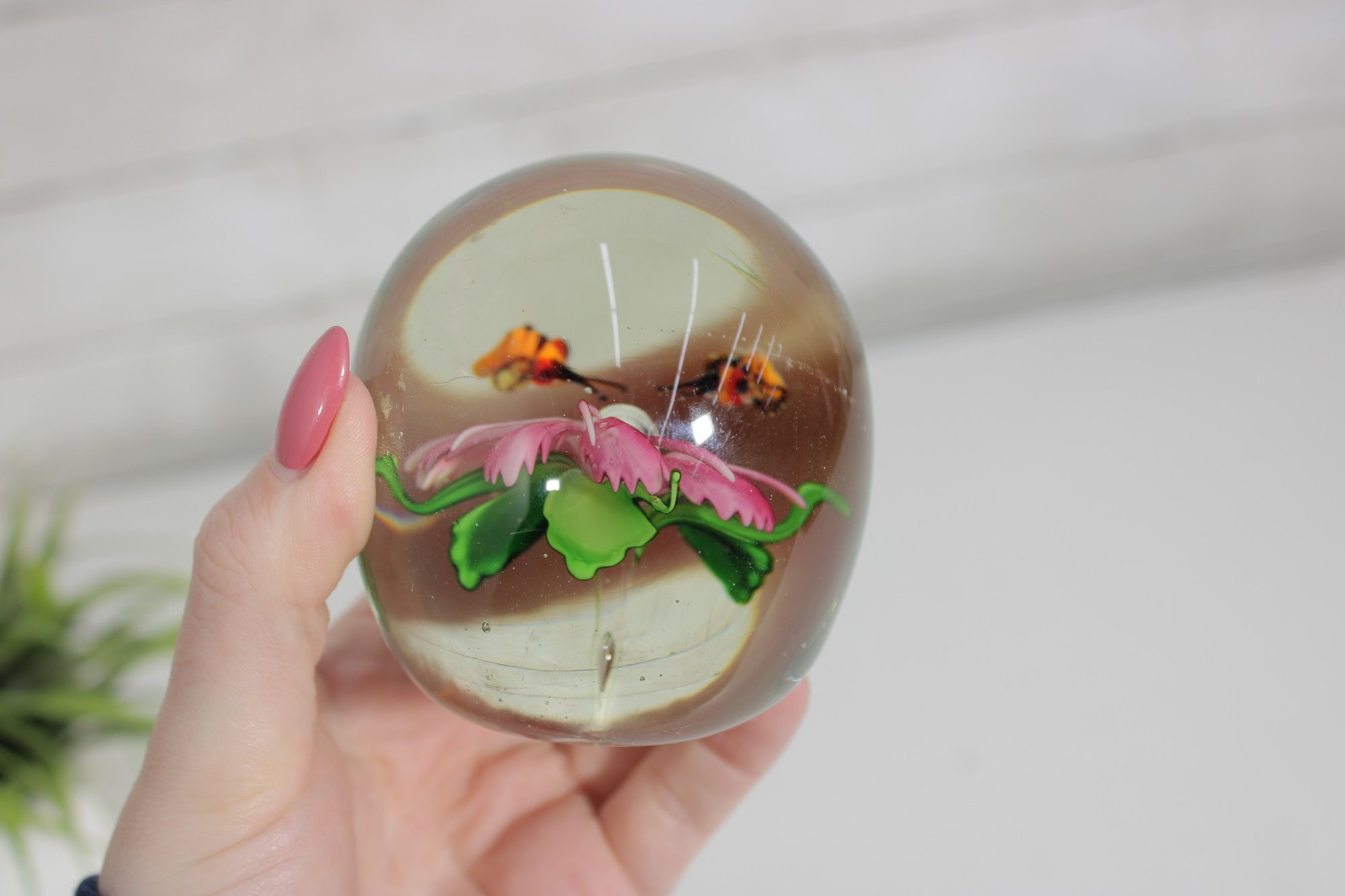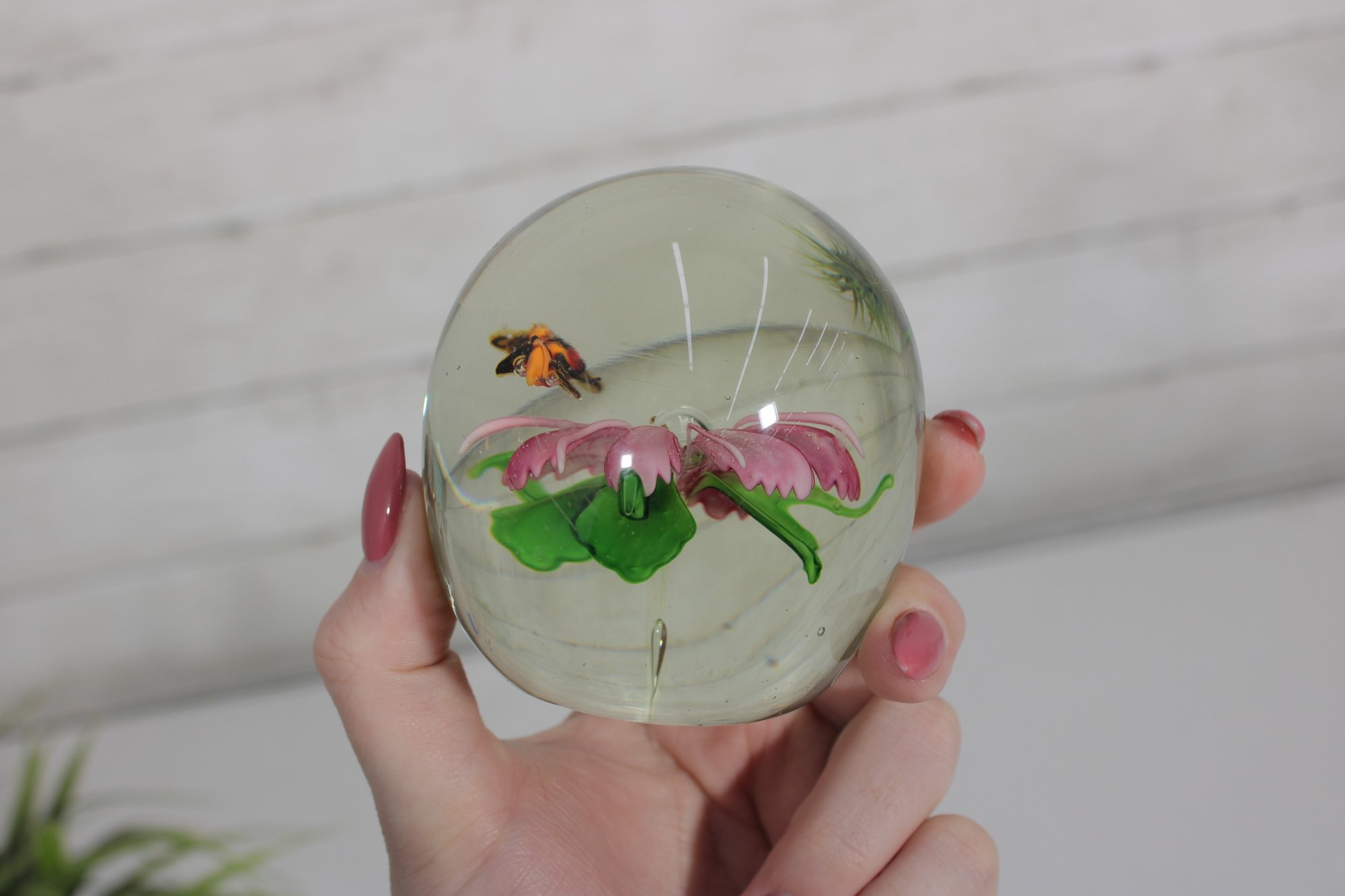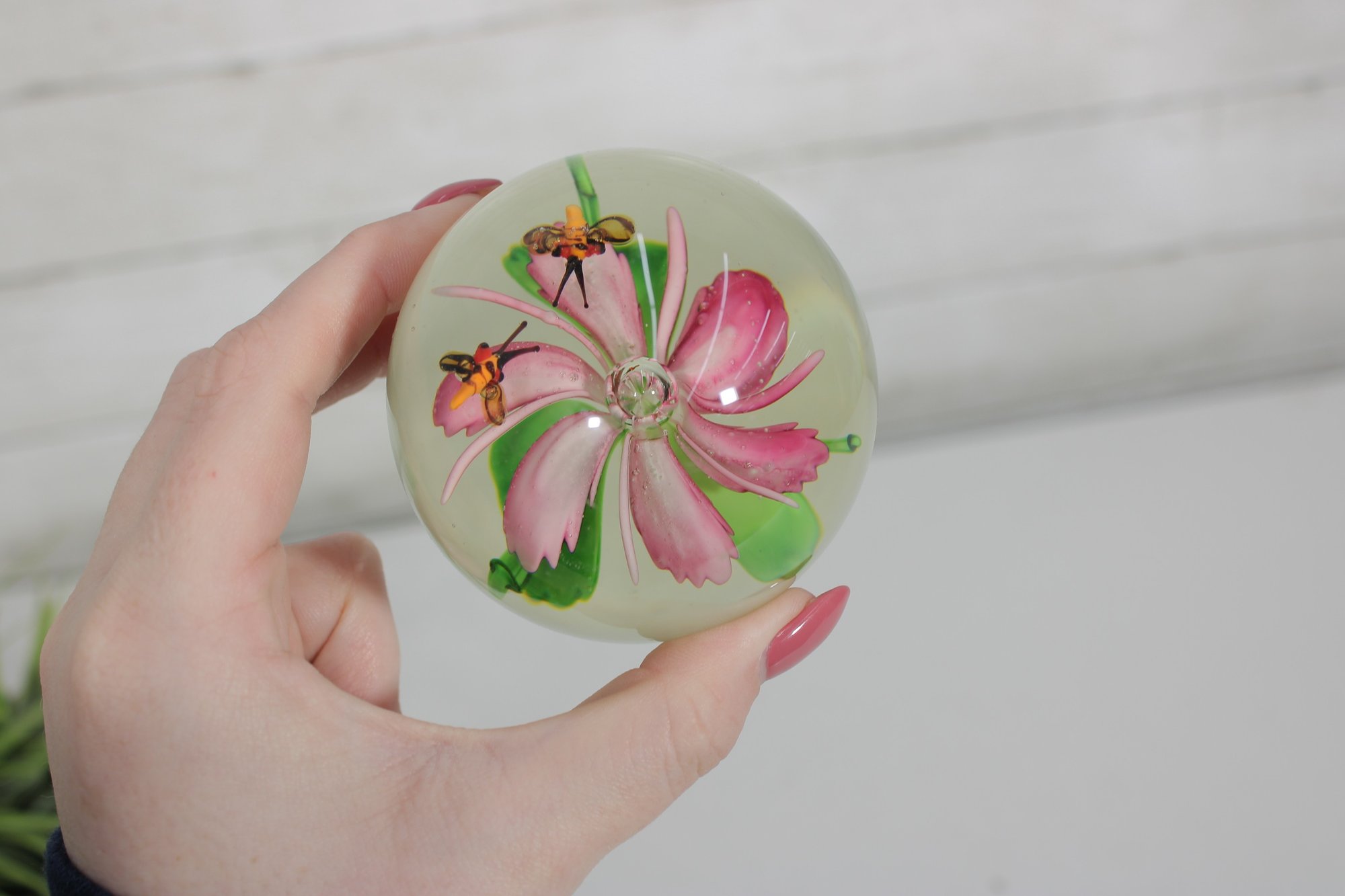 Delightful vintage art glass paperweight featuring a beautifully detailed internal scene of bumble bees hovering over a pink flower with green leaves. This charming piece measures approximately 3 inches tall and has a softly rounded, slightly domed form.