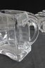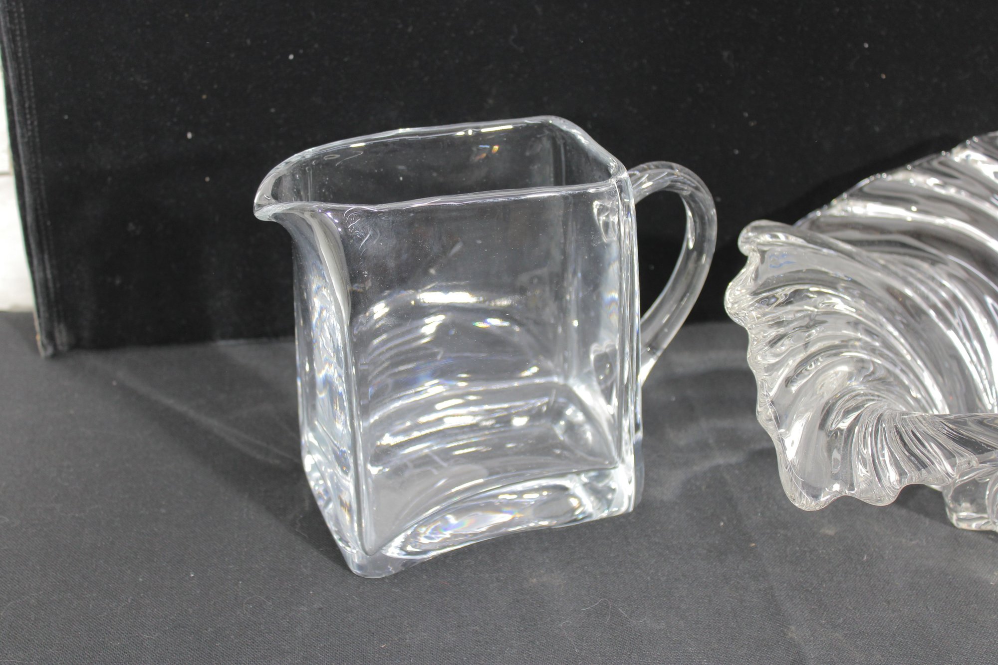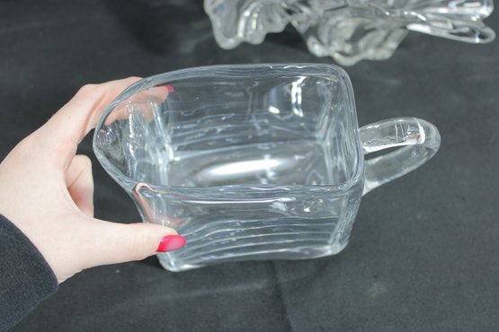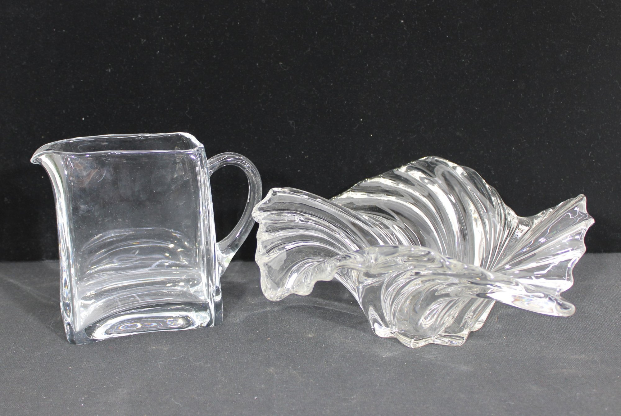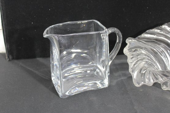 vintage glass lot featuring a sculptural centerpiece bowl and a clear glass pitcher, both with a timeless Mid-Century Modern aesthetic.