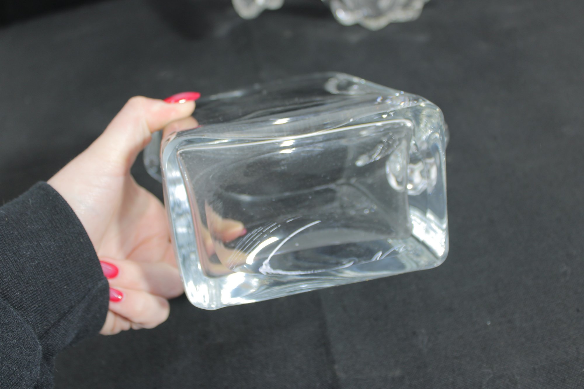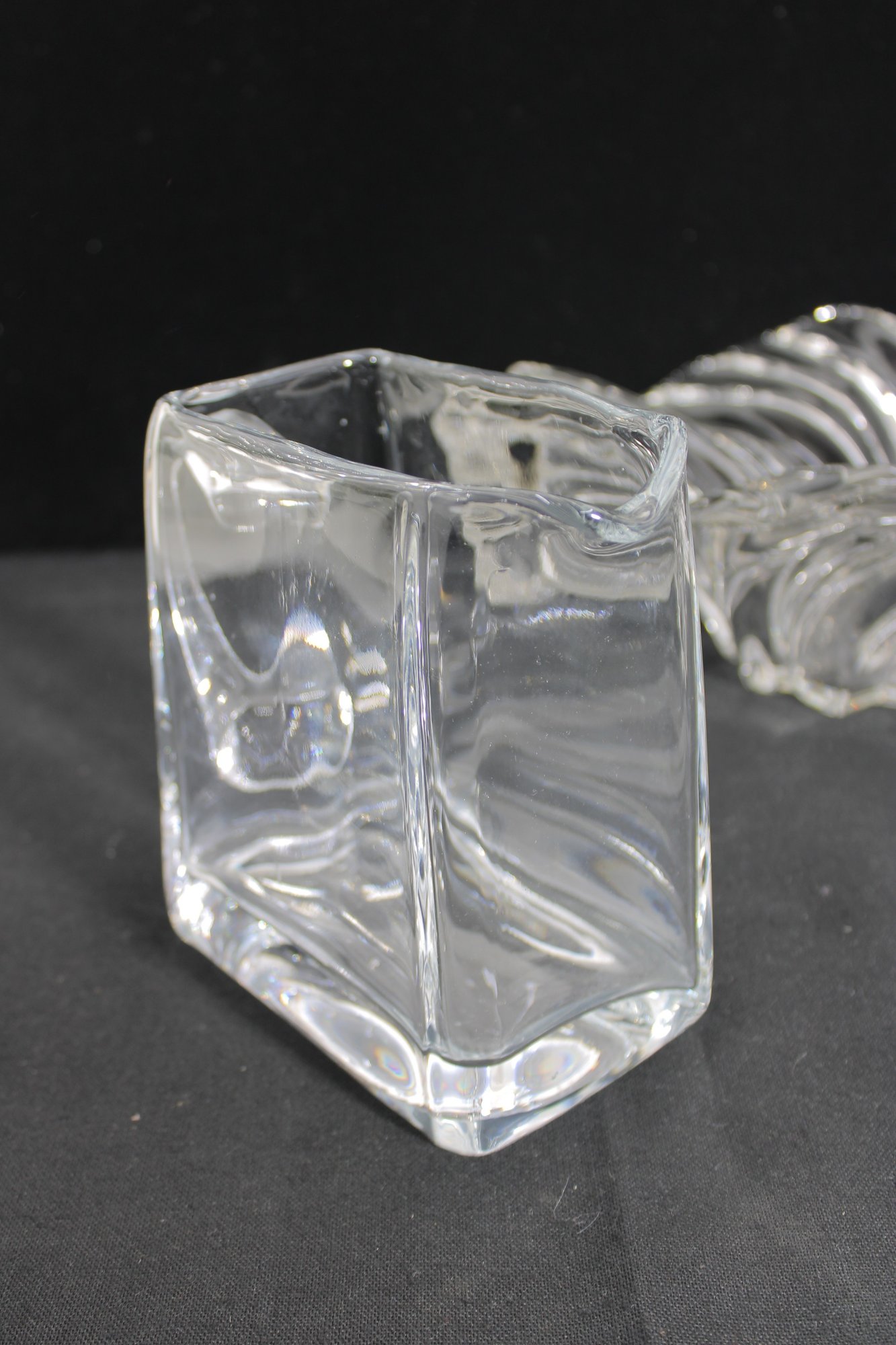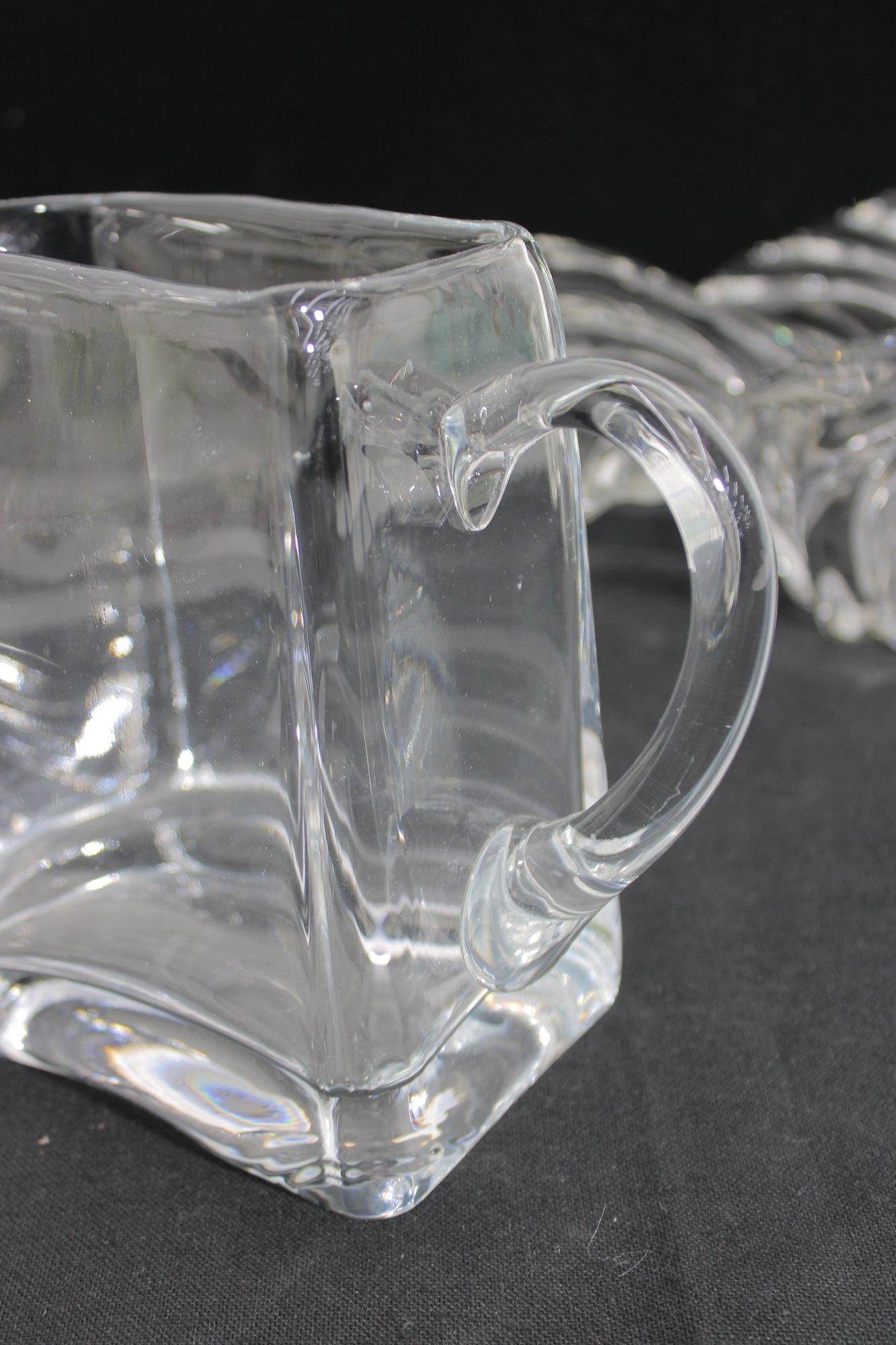 vintage glass lot featuring a sculptural centerpiece bowl and a clear glass pitcher, both with a timeless Mid-Century Modern aesthetic.
