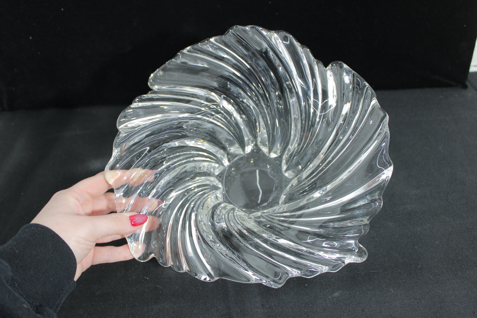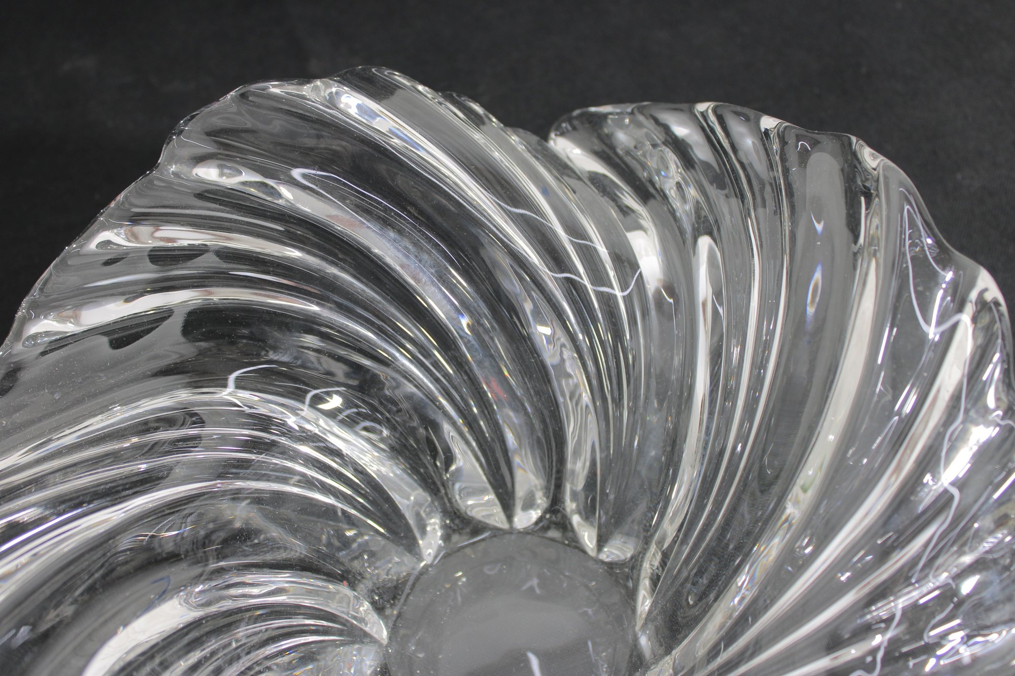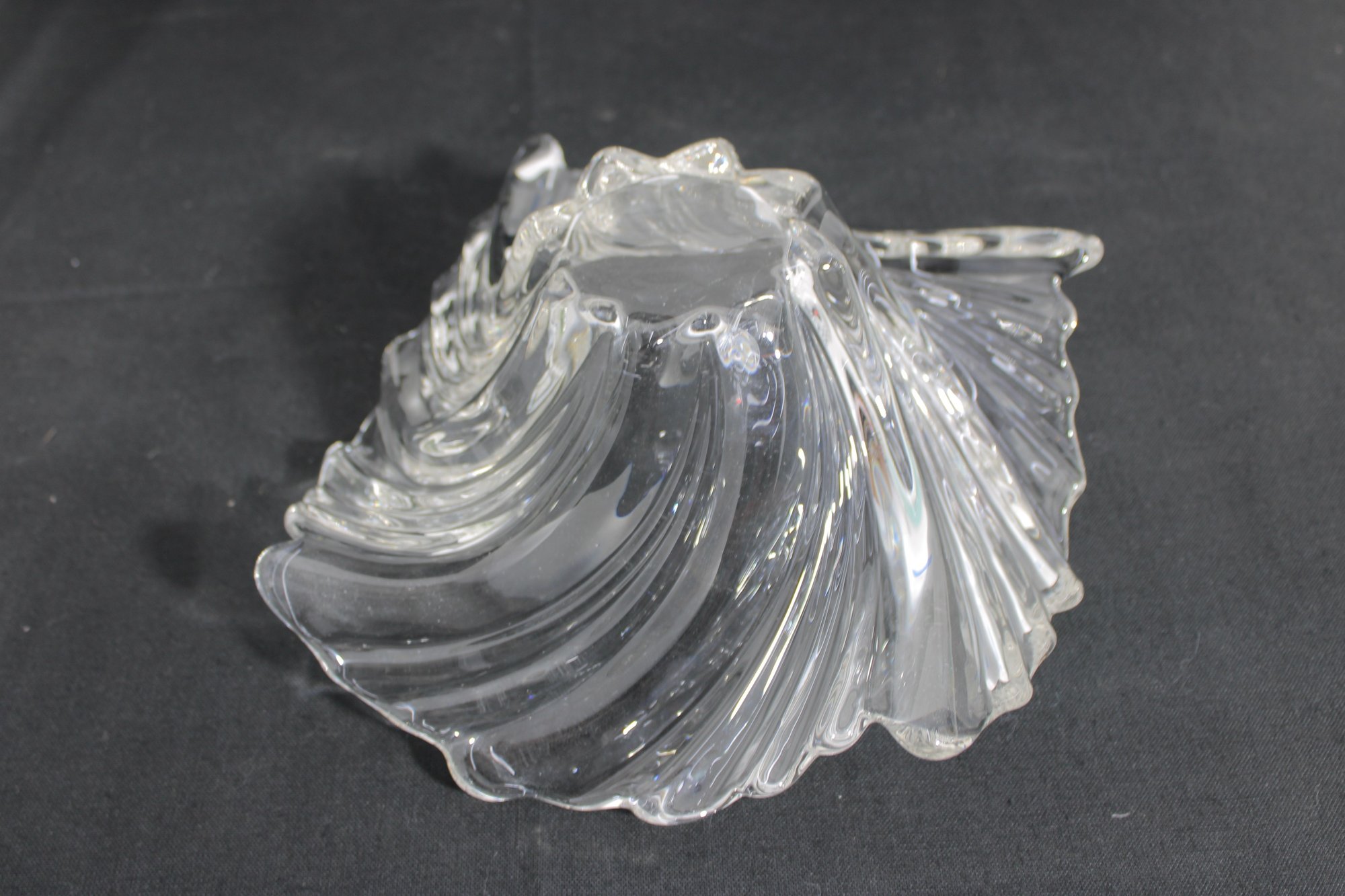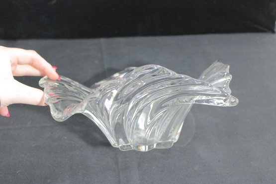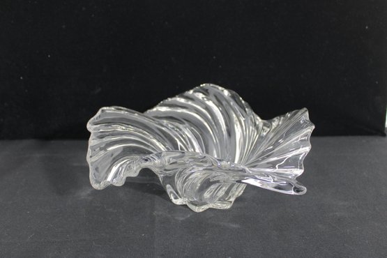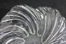 The centerpiece bowl measures approximately 11” wide and 5” high, designed in a flowing, organic form with ribbed detailing that resembles a shell or wave. Its dynamic shape makes it a striking display piece for a table or shelf.