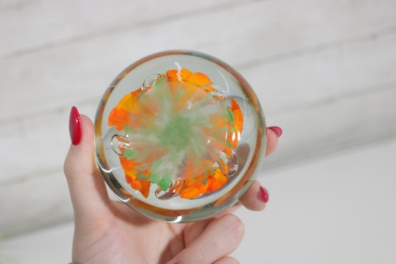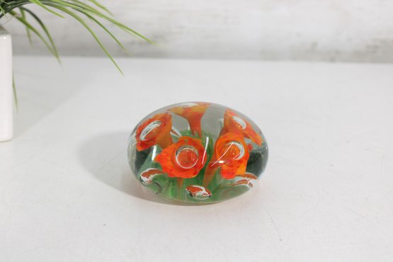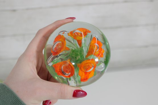 Beautiful vintage art glass paperweight featuring a vibrant bouquet of orange flowers suspended within clear glass. The design showcases detailed floral canes with green stems, surrounded by evenly spaced controlled bubbles that add depth and visual interest.