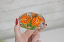 The domed shape and polished finish enhance the clarity and brilliance of the piece, allowing the vivid orange blooms to stand out from every angle.