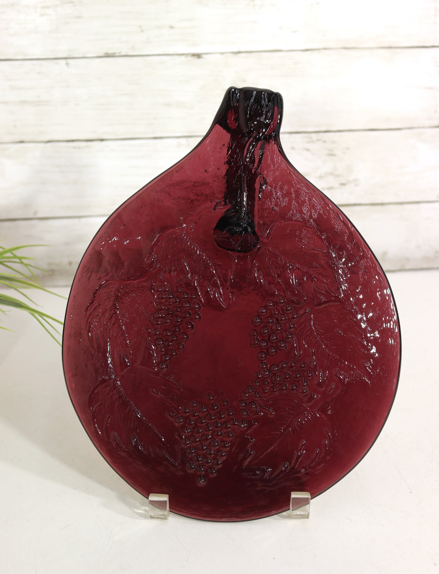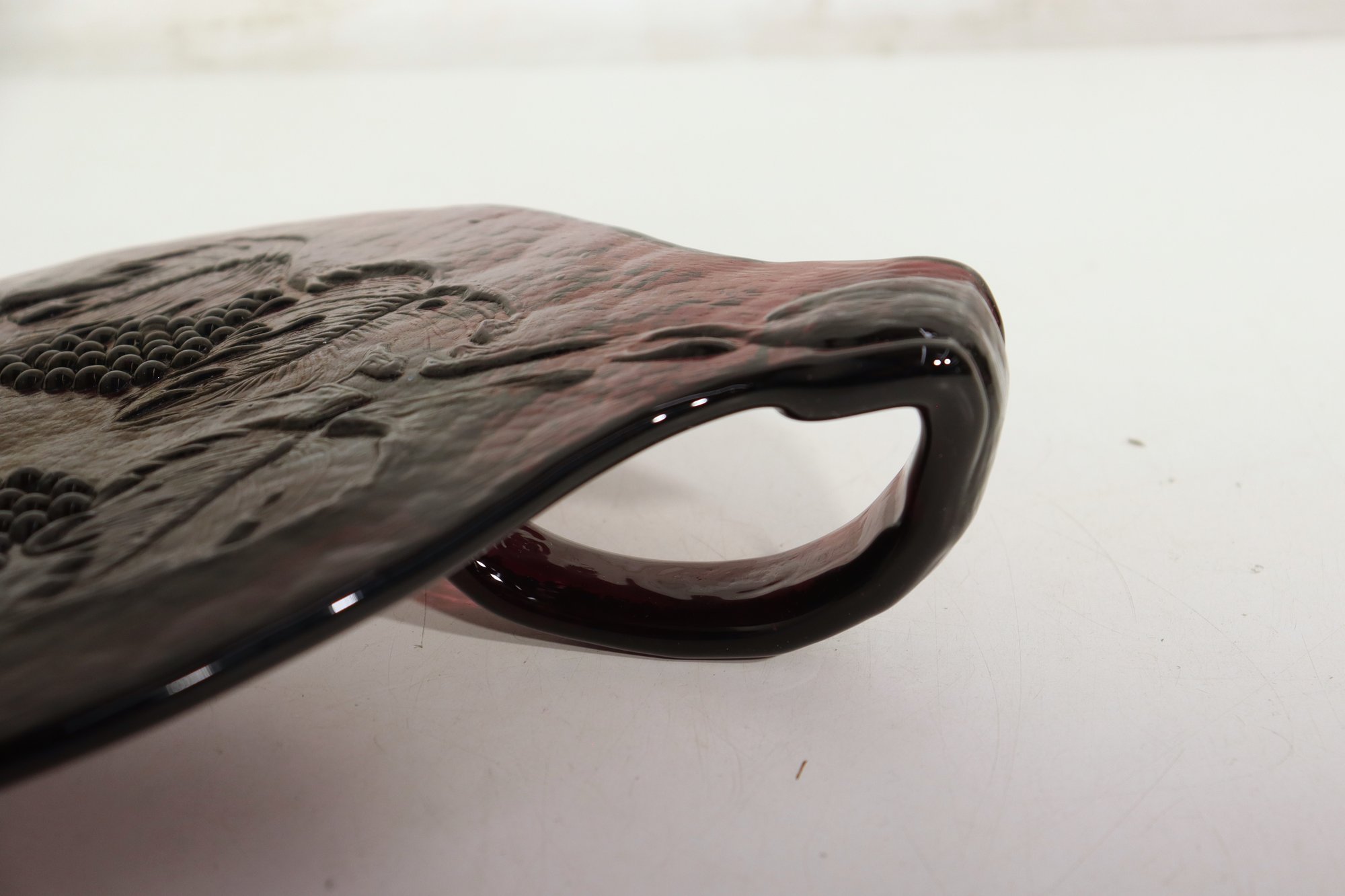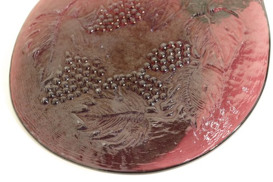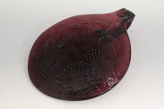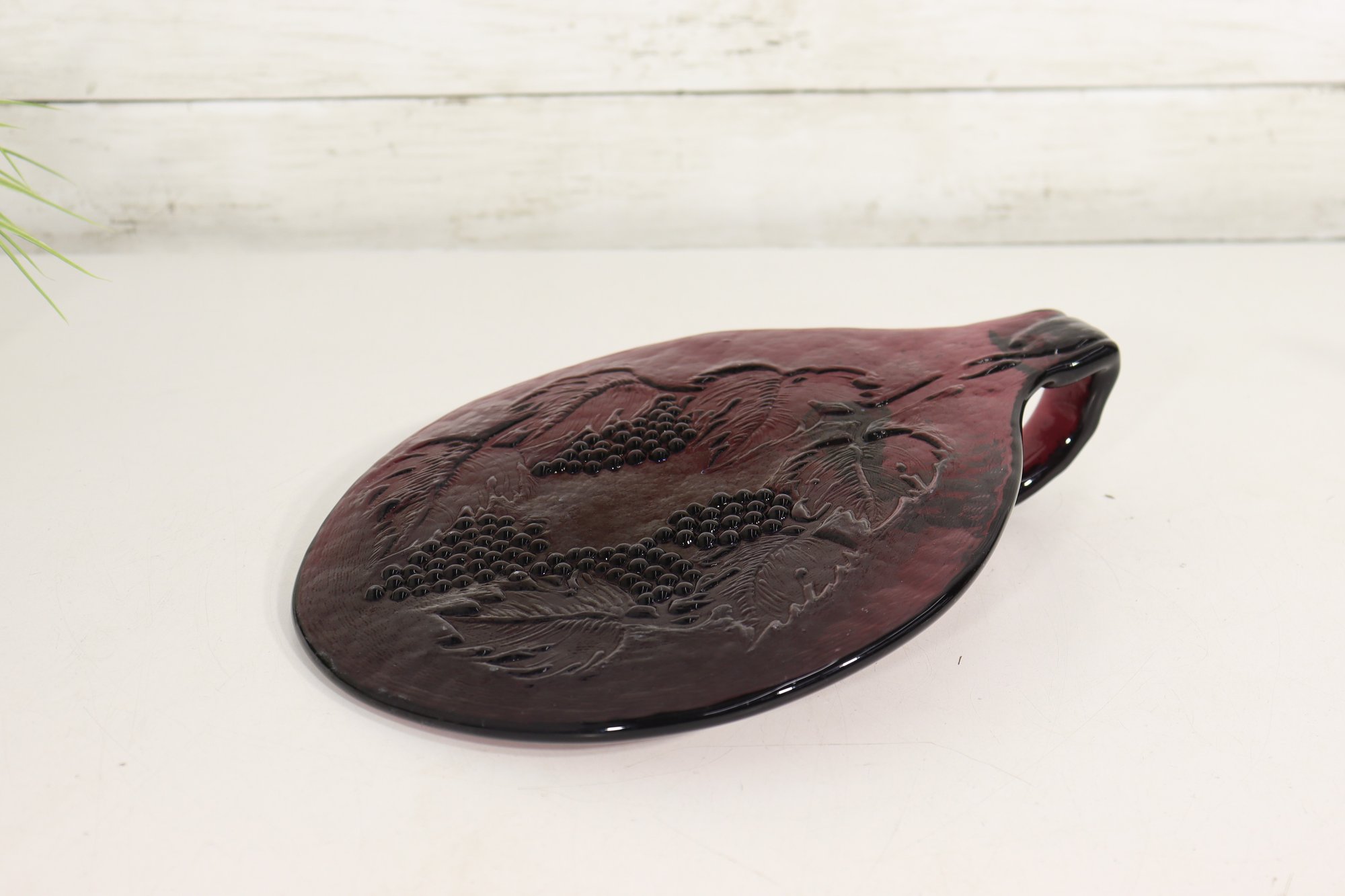 Vintage hand crafted art glass serving tray / platter featuring a raised grape and leaf motif on the top surface and a built-in glass handle. Deep reddish amethyst tone glass with beautiful variation when light hits it. Measures approx. 12” x 9”.