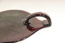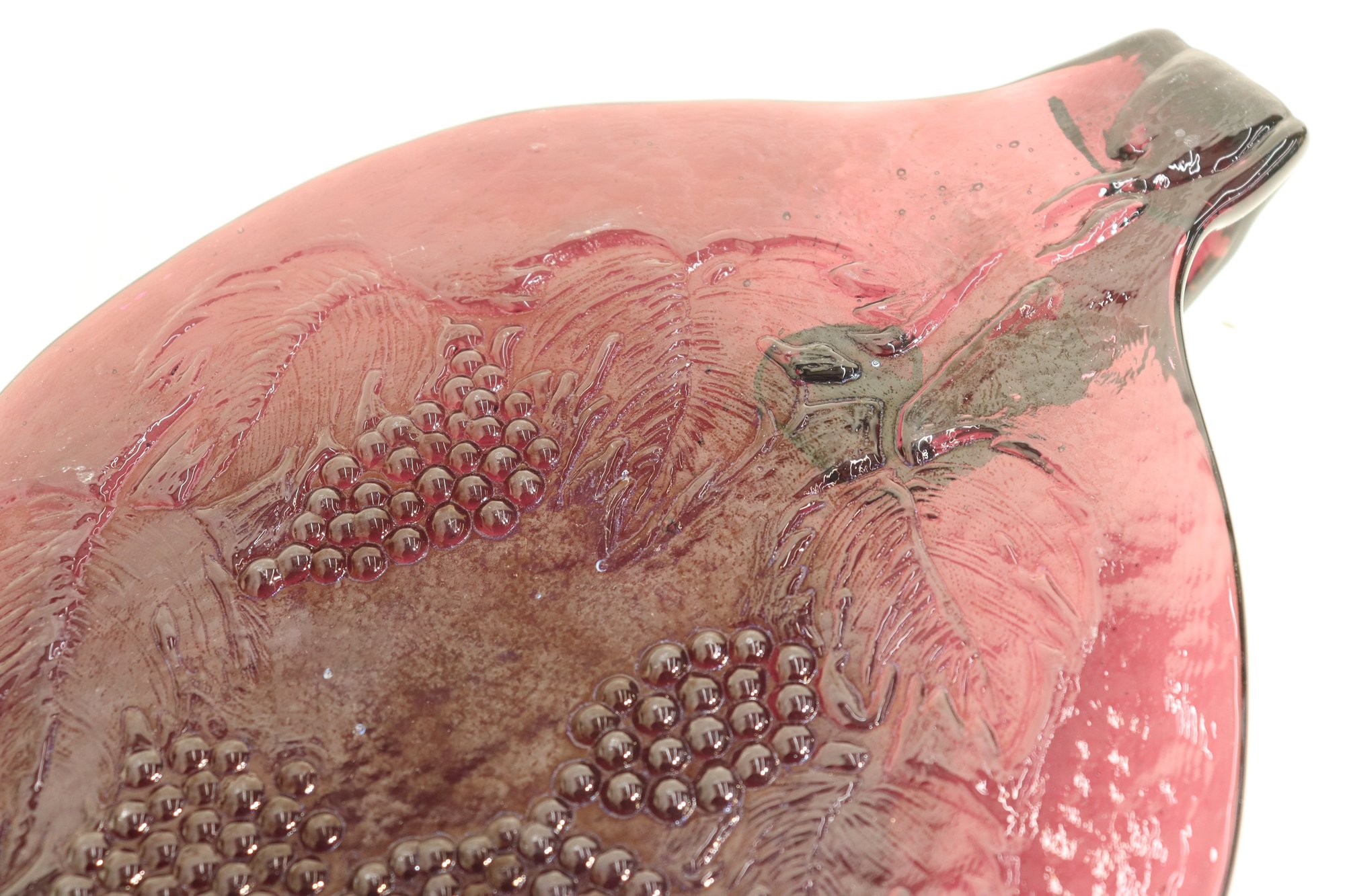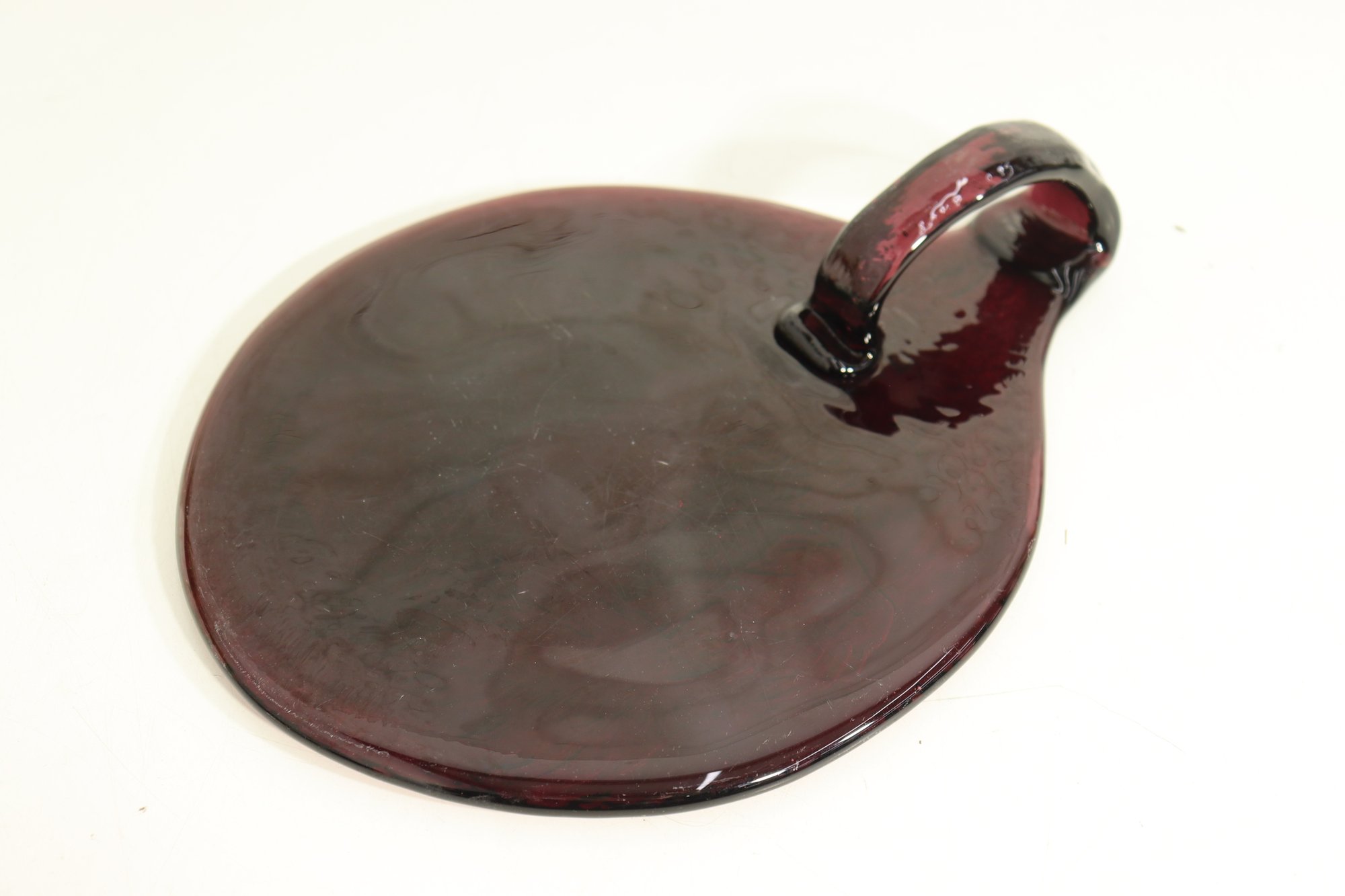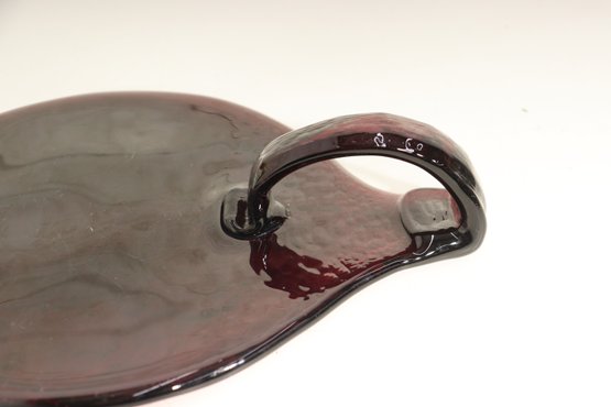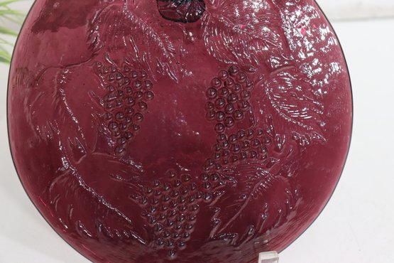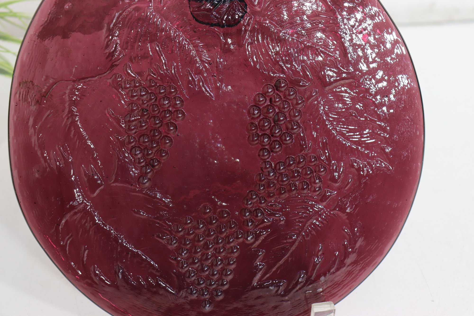 Vintage hand crafted art glass serving tray / platter featuring a raised grape and leaf motif on the top surface and a built-in glass handle. Deep reddish amethyst tone glass with beautiful variation when light hits it. Measures approx. 12” x 9”.