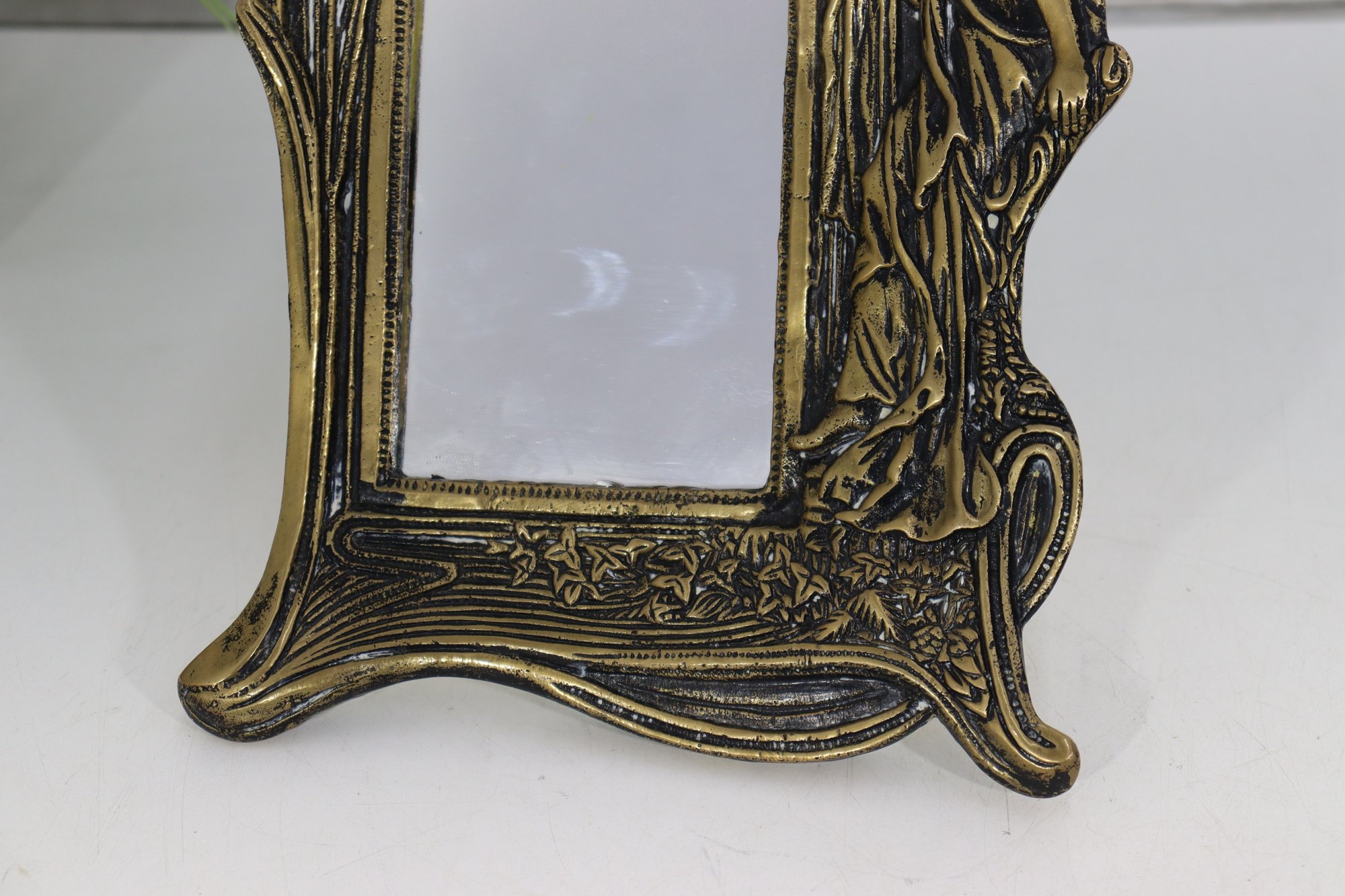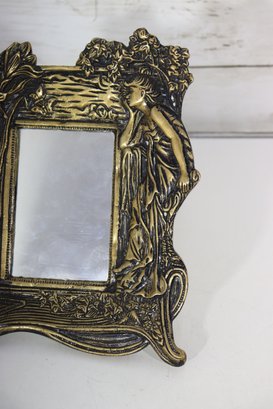 Beautiful vintage Art Nouveau style tabletop mirror featuring an ornate sculpted female figure alongside floral and scroll detailing. This piece has a stunning antique gold/bronze tone finish with rich raised relief details throughout, capturing the romantic flowing style of the Art Nouveau era.