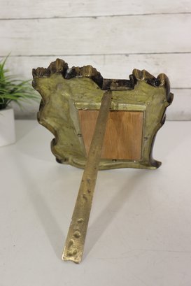 The mirror is supported by a hinged metal stand at the back, allowing it to sit perfectly on a vanity, dresser, desk, entryway table, or shelf. A great accent décor piece with elegant vintage charm.