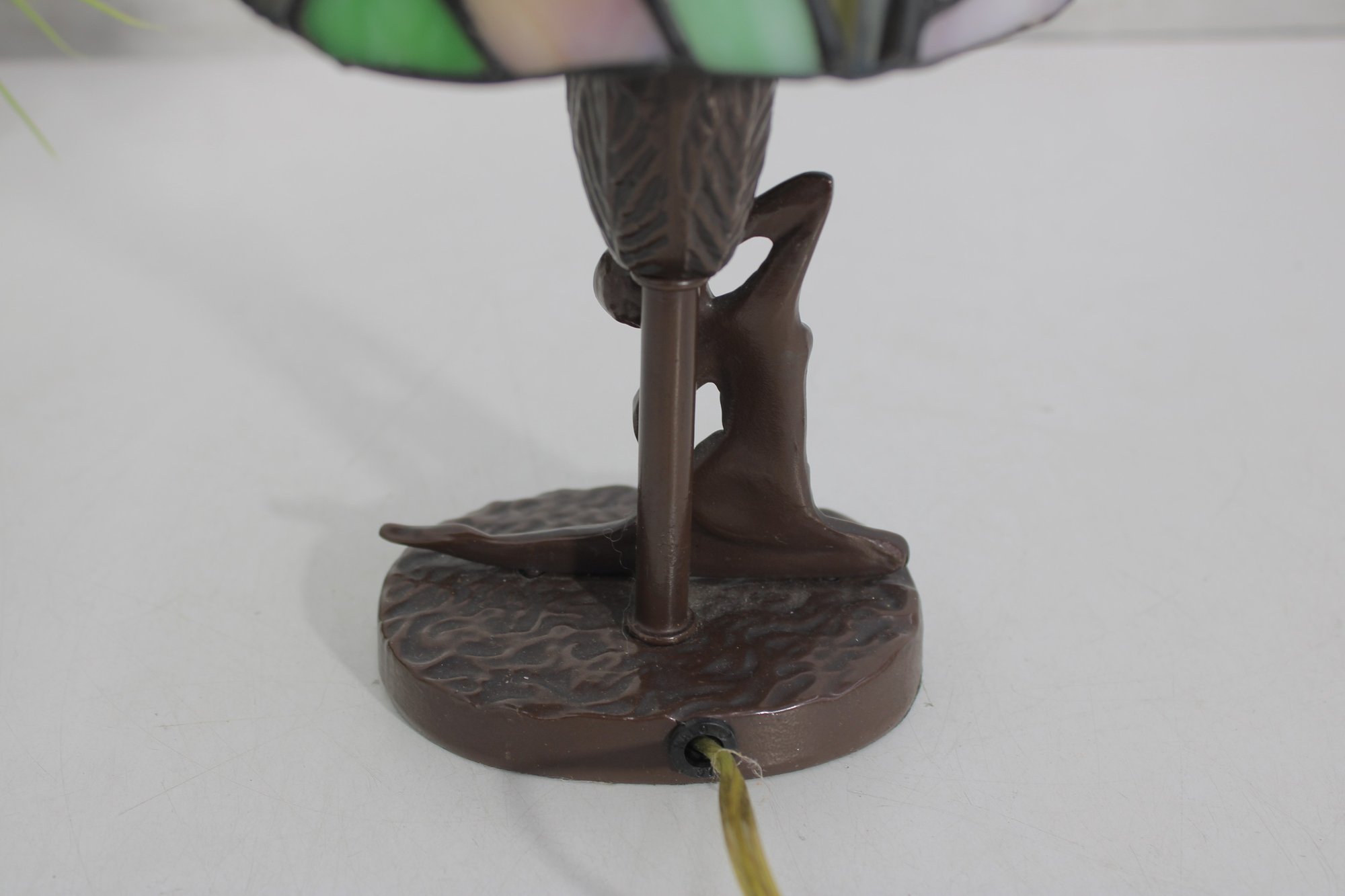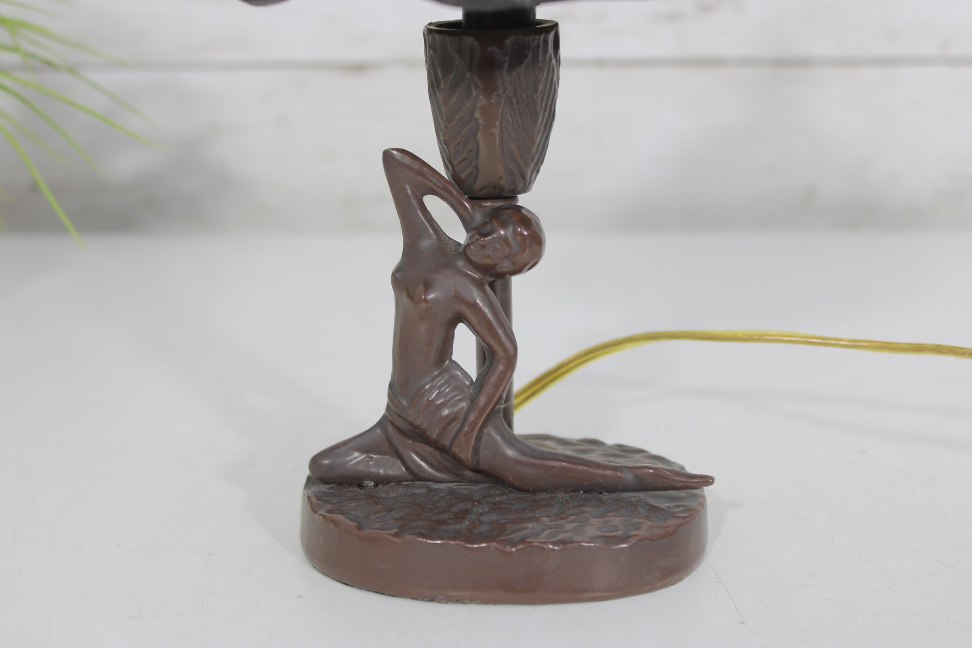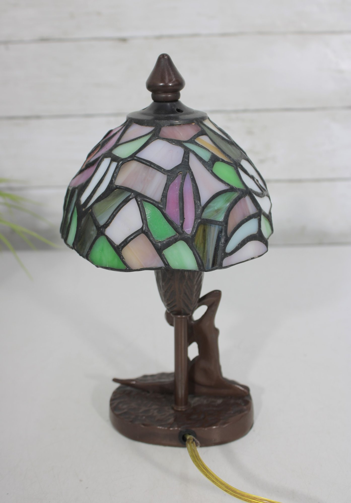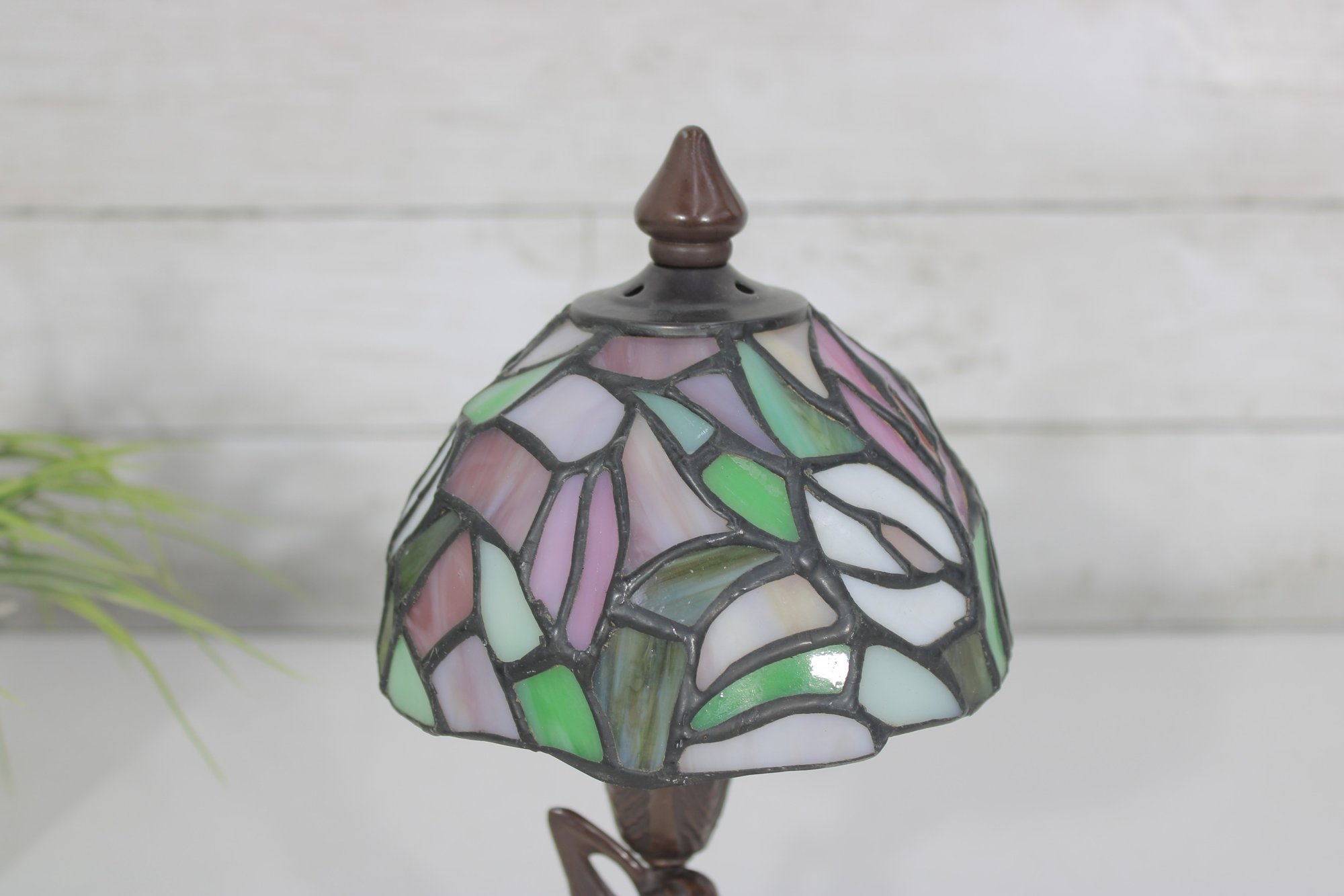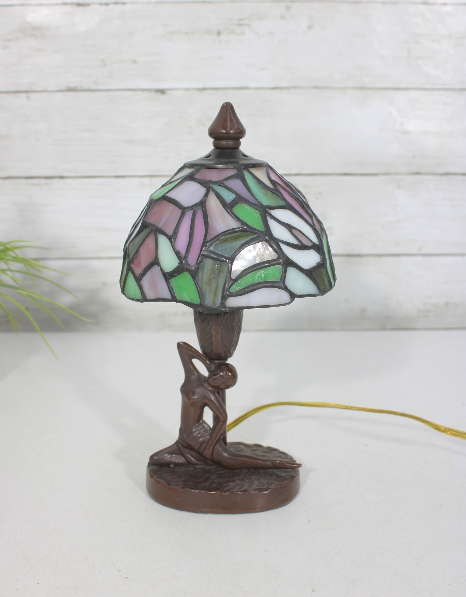 This petite decorative lamp features a beautifully detailed Art Nouveau–style figural base depicting a seated female form in a flowing pose. The shade is crafted in a mosaic-style stained glass design with soft hues of green, lavender, cream, and pink, outlined in dark leading.