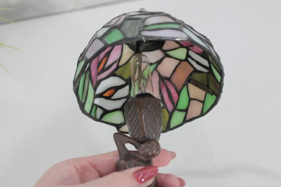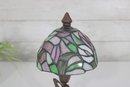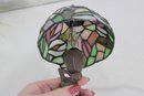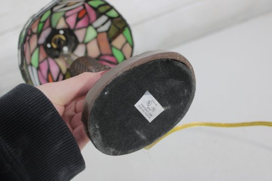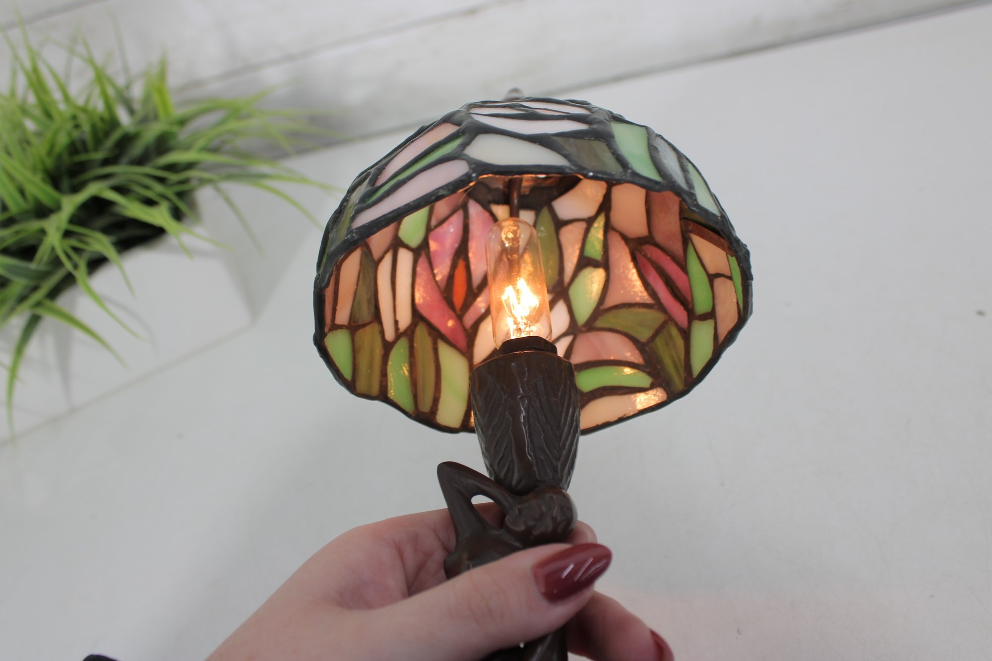 When lit, the shade glows warmly, highlighting the multicolored glass pattern and creating a cozy ambiance. The sculptural base adds artistic appeal, making this a standout accent piece.